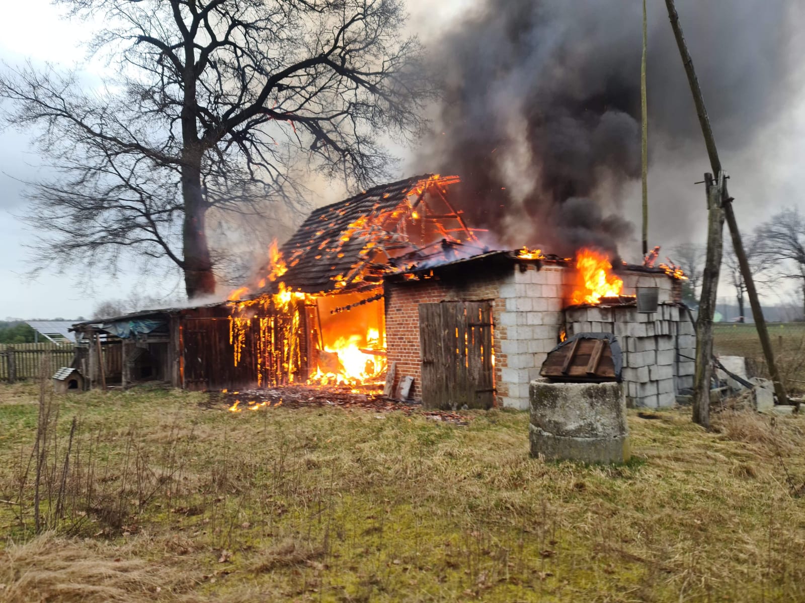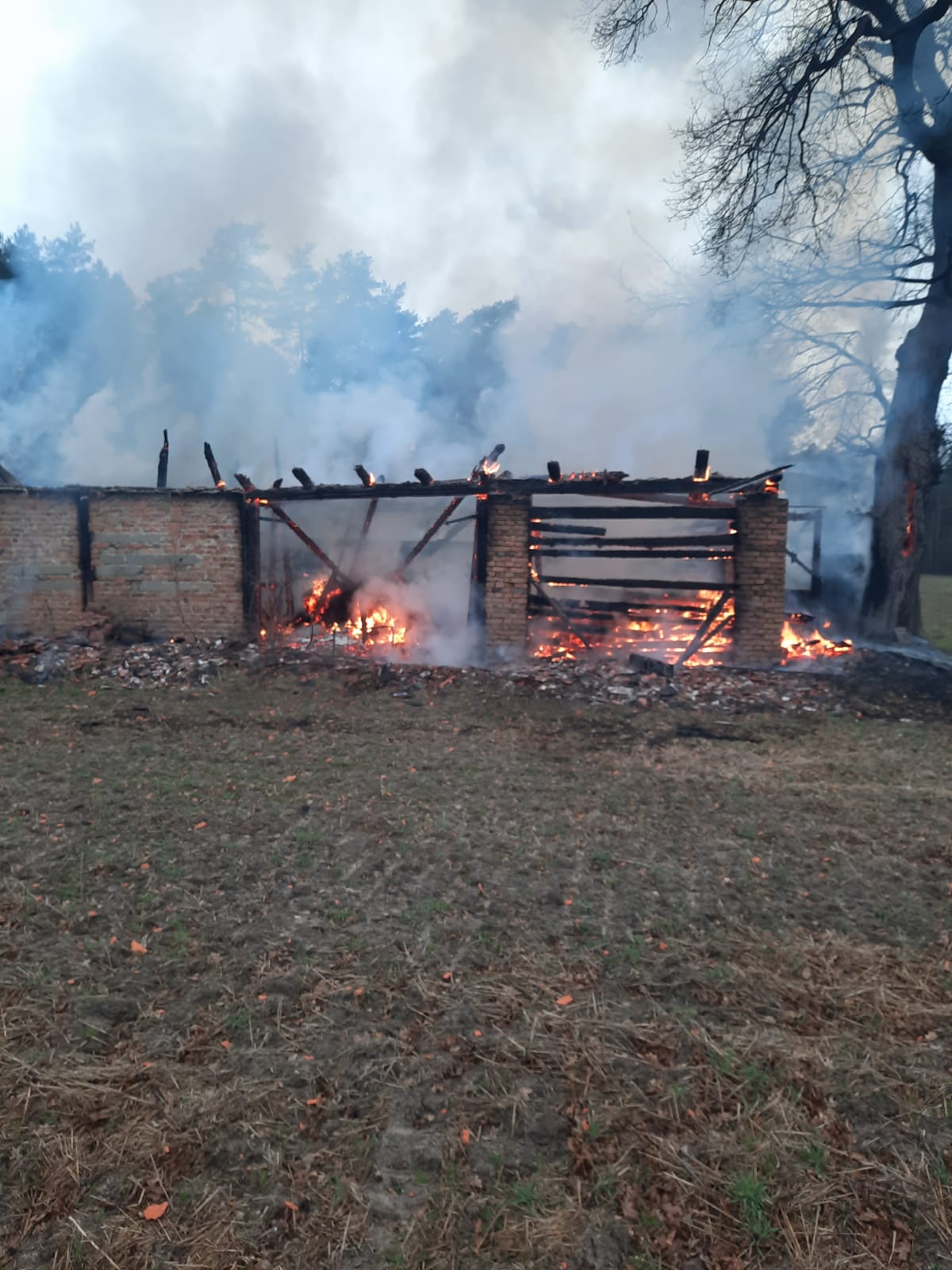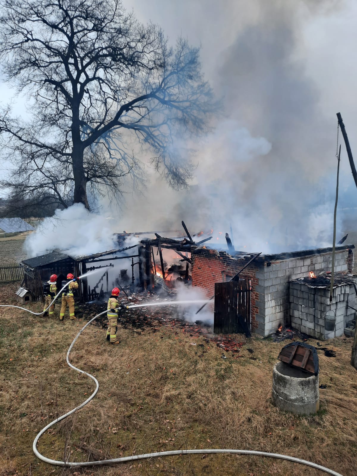 Na miejscu zdarzenia zastaliśmy w całości objęty ogniem budynek gospodarczy oraz palące się wnętrze pojedynczego drzewa.