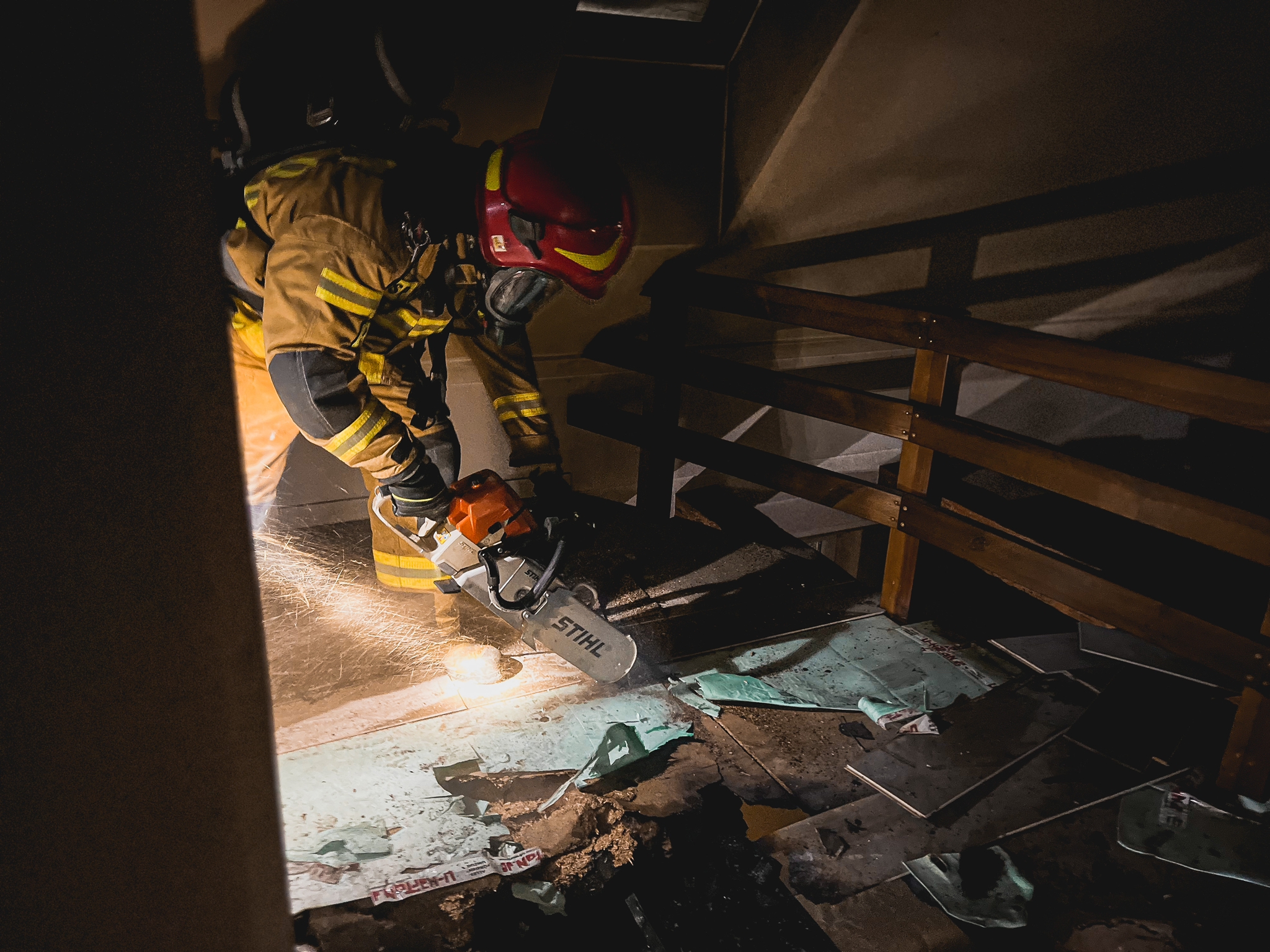Odłączono prąd w budynku oraz zakręcono główny zawór gazu. Ratownicy zabezpieczenie w sprzęt ochrony dróg oddechowych podali jeden prąd wody w natarciu na palące się belki nośne, co przyczyniło się do opanowania pożaru. Przy pomocy wentylatora oddymiono pomieszczenia. Następnie strażacy użyli piły ratowniczej oraz podręcznego sprzętu burzącego w celu usunięcia nadpalonych elementów konstrukcji. W dalszej fazie sprawdzono obiekt kamerą termowizyjną w celu wykluczenia zarzewi ognia.