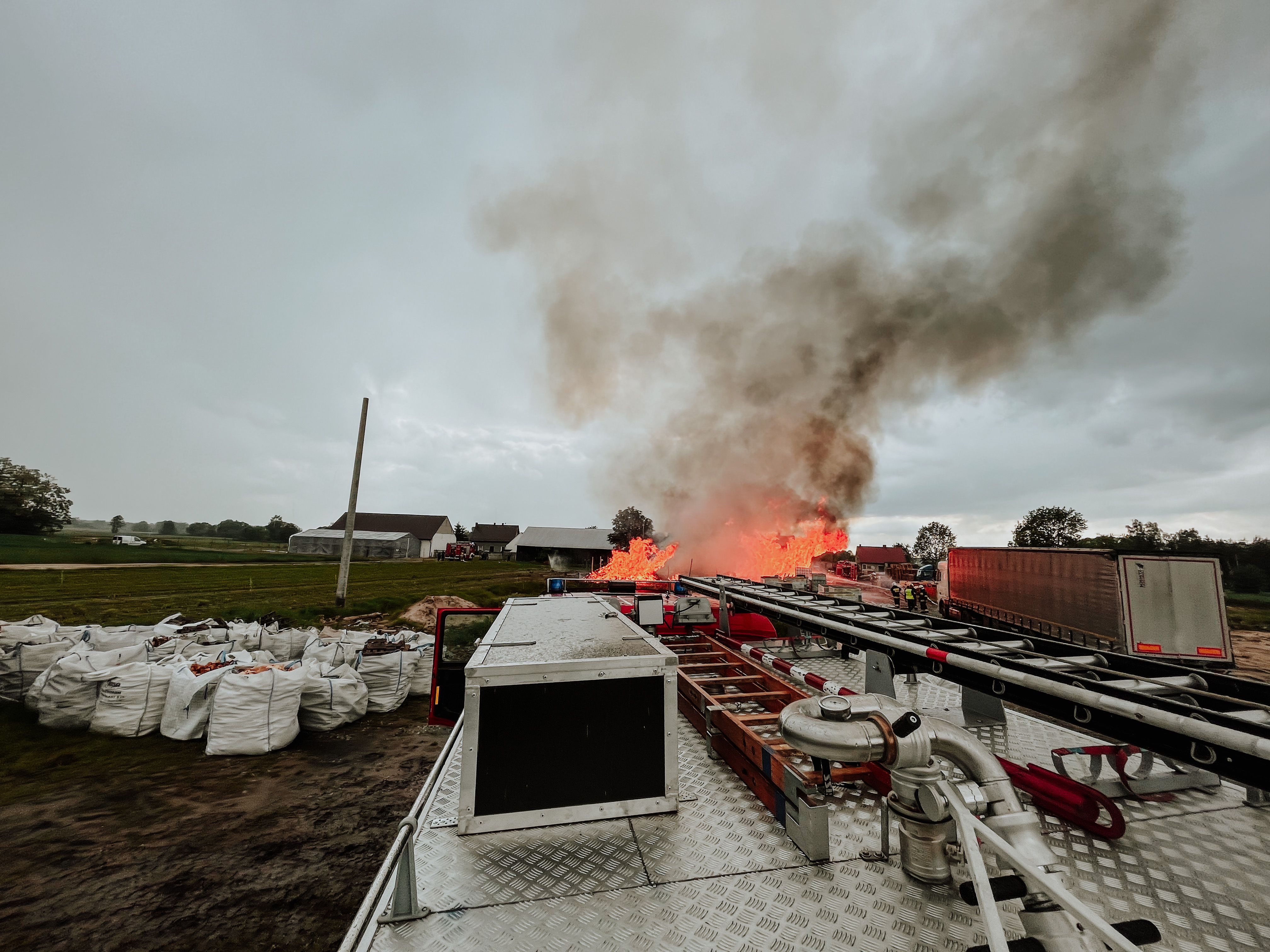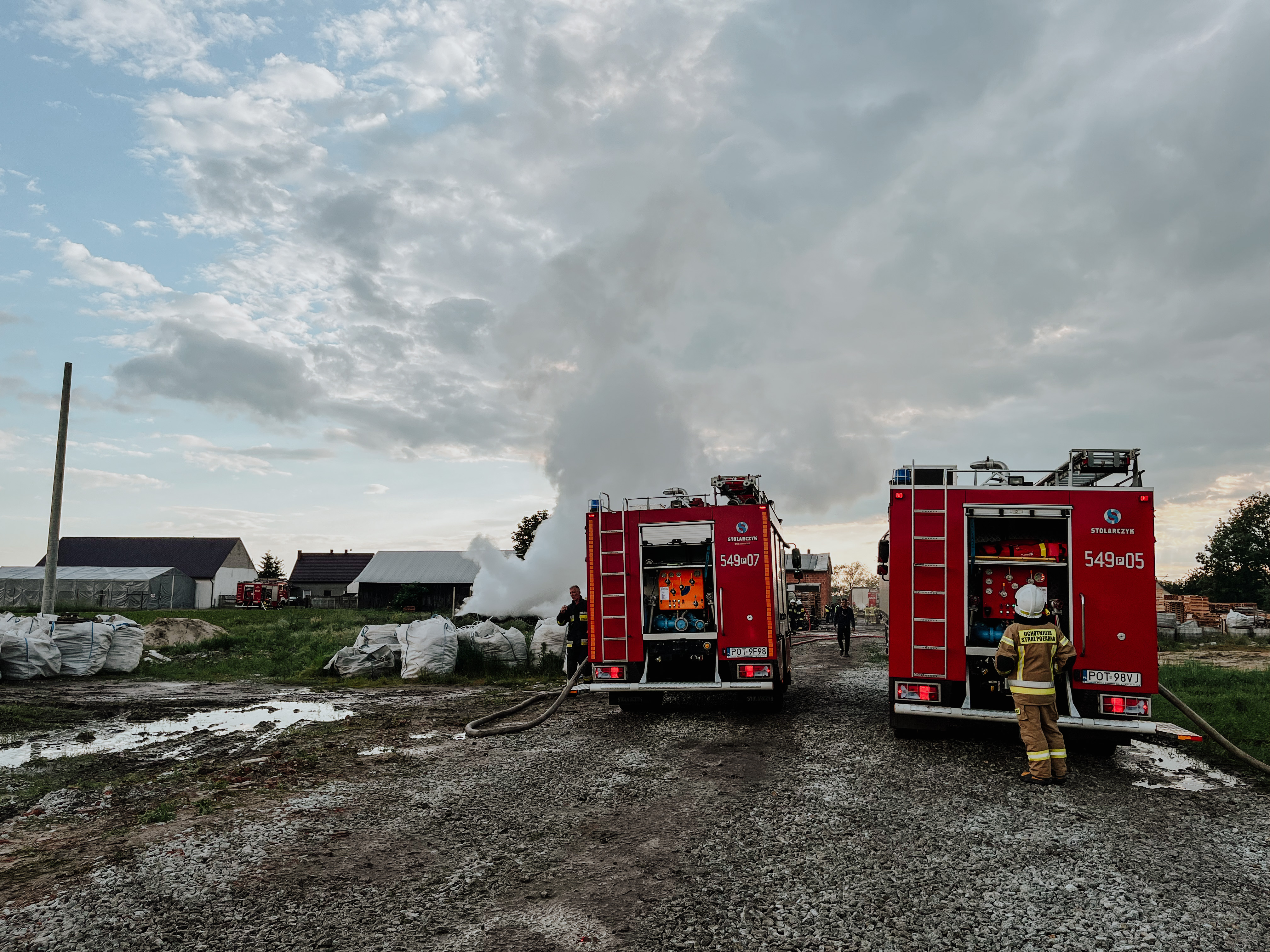 Przybyłe na miejsce zdarzenia jednostki ochrony przeciwpożarowej ustaliły, że pożarem objęty został skład drewnianych palet na powierzchni około 600m2, które znajdowały się w pobliżu samochodów ciężarowych oraz budynków mieszkalnych.