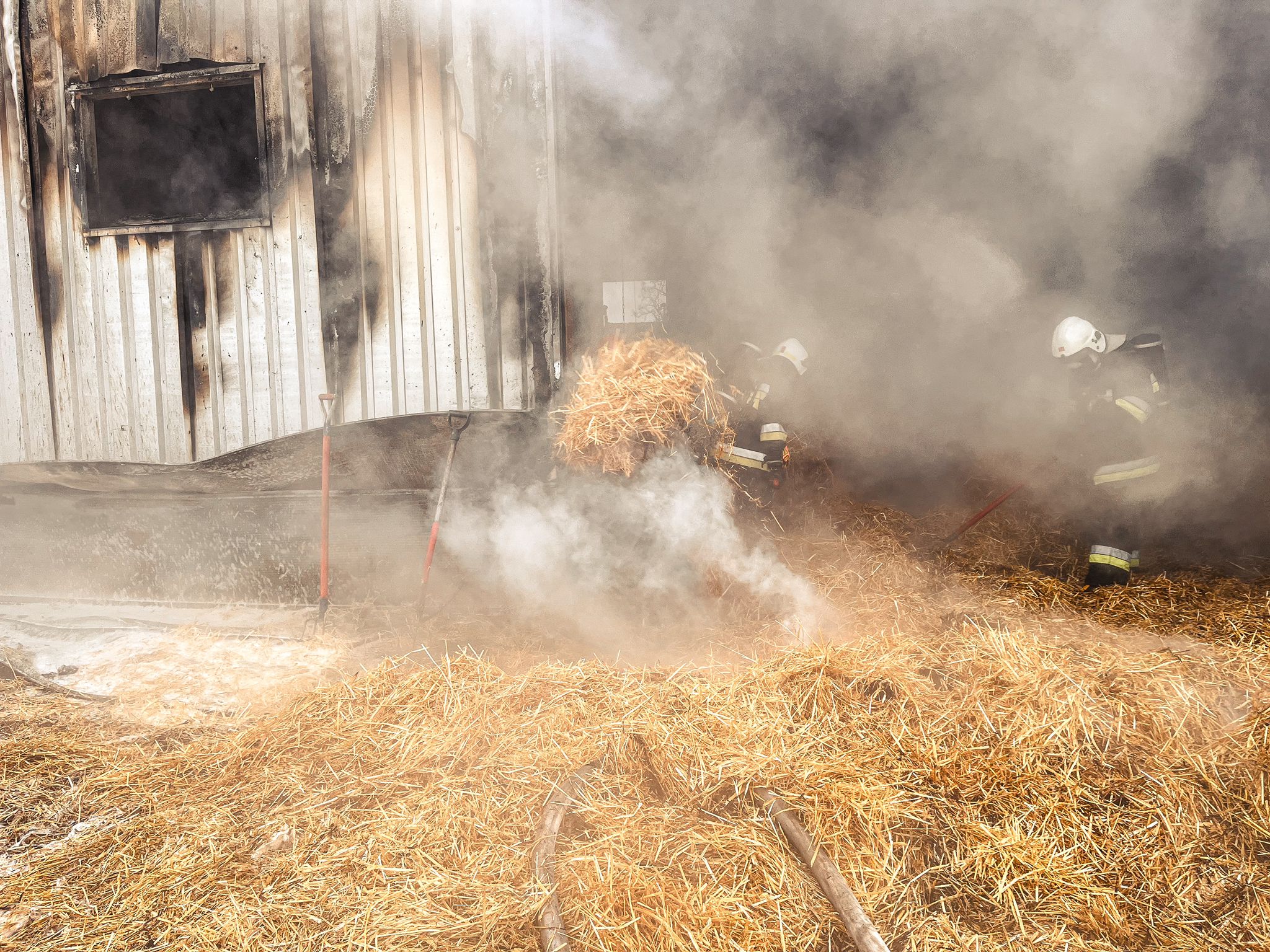 Po dojeździe na miejsce zdarzenia pierwszych zastępów straży pożarnych zastano budynek inwentarski całkowicie objęty pożarem. Ratownicy zabezpieczeni w aparaty ochrony dróg oddechowych podali 3 prądy wody w natarciu na pożar. W trakcie gaszenia usunięto palącą się słomę z budynku, którą przelano dodatkowo wodą. Wprowadzono wentylację mechaniczną oraz obiekt sprawdzono kamerą termowizyjną w celu wykluczenia zarzewi ognia.