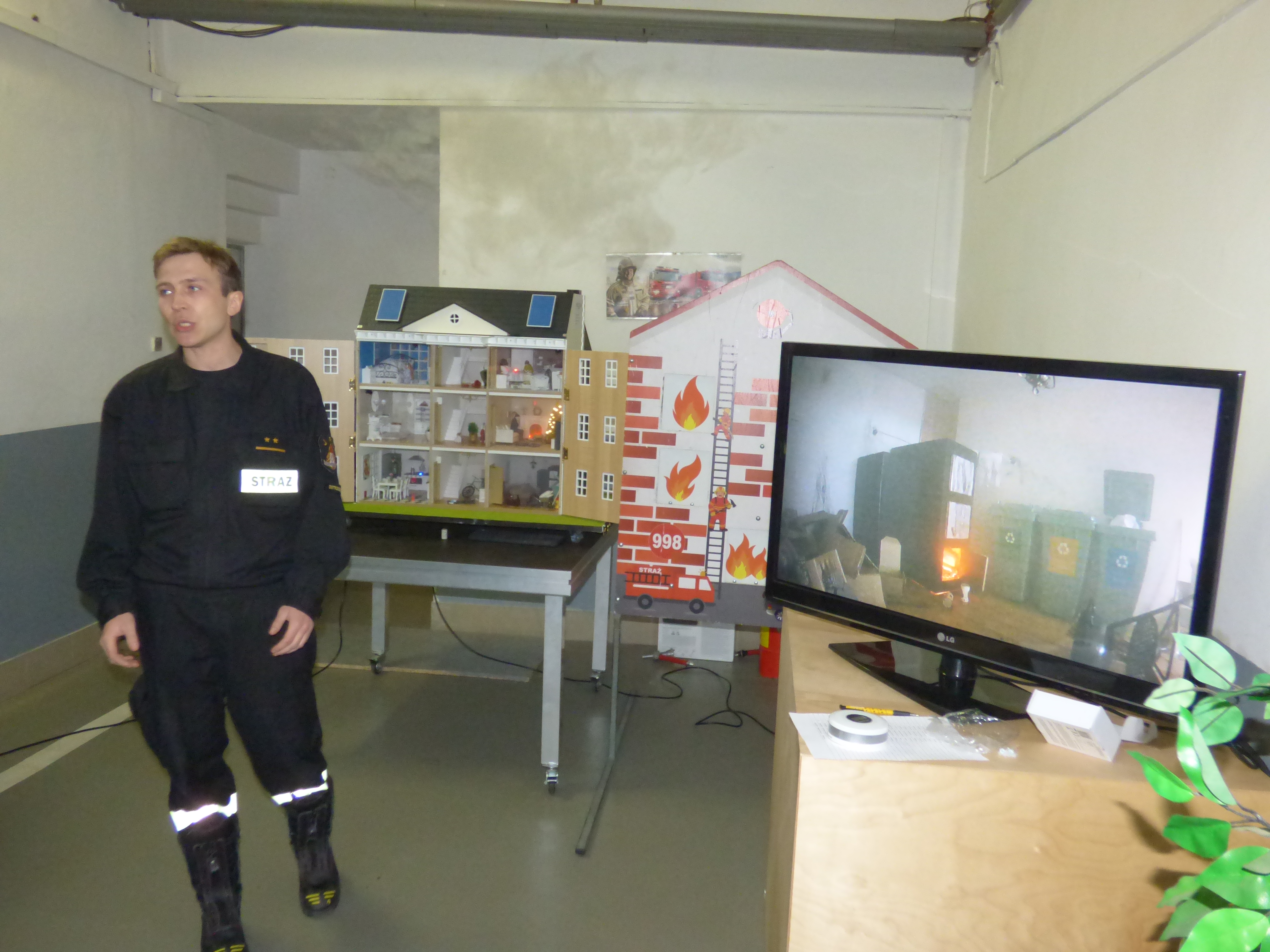 W trakcie uroczystego rozdania laureatom konkursu został zaprezentowany mobilny symulator zagrożeń pożarowych za pomocą którego zaaranżowaliśmy kilka scenek tematycznych związanych z pożarem w poszczególnych pomieszczeniach.