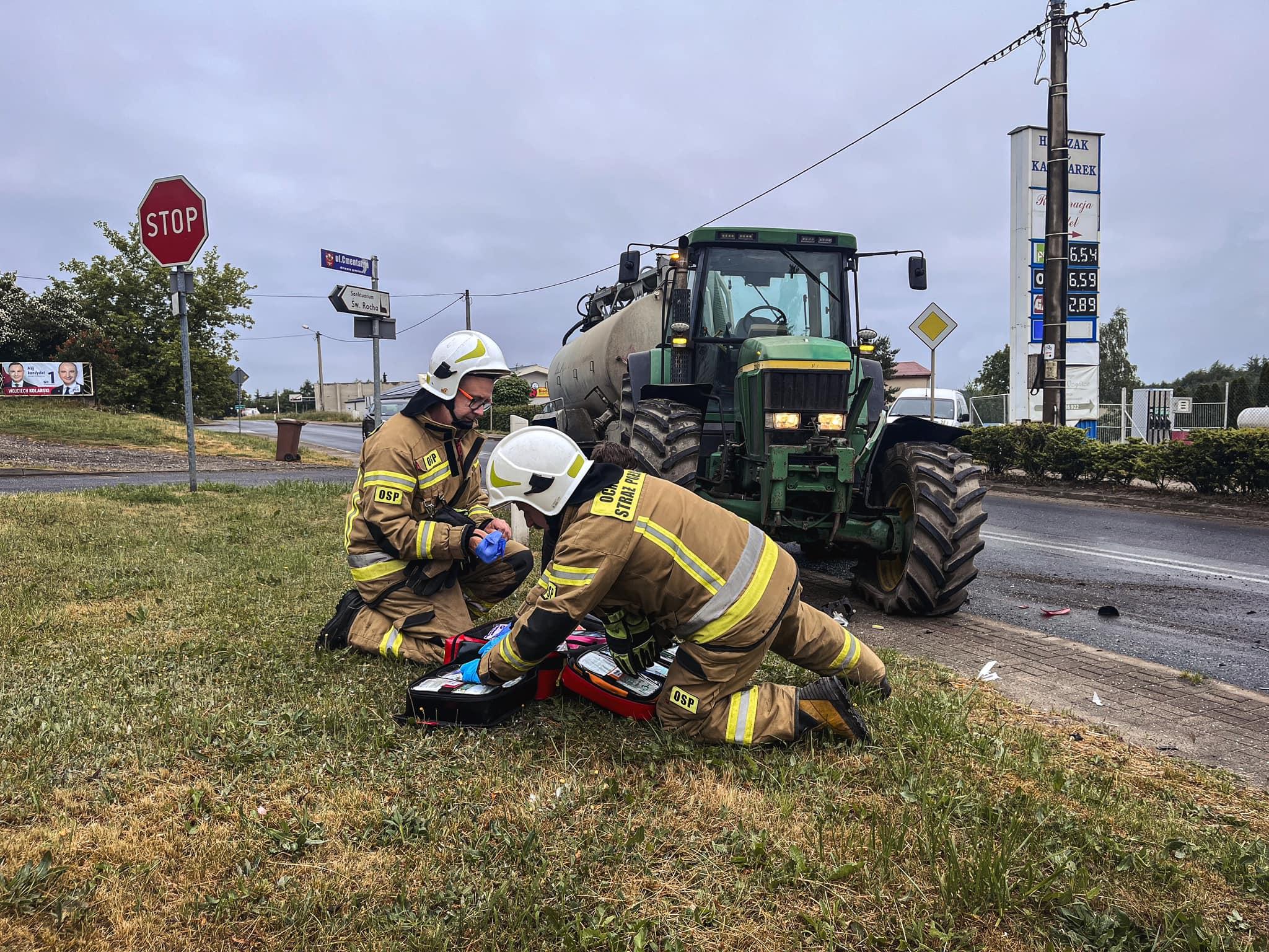 Po dojeździe na miejsce zdarzenia pierwszych zastępów straży pożarnej zastano samochów osobowy po zderzeniu z ciągnikiem rolniczym. Zabezpieczono miejsce zdarzenia. Udzielono kwalifikowanej pierwszej pomocy dwóm osobom poszkodowanym do czasu przybycia na miejsce zdarzenia ZRM. Następnie zabezpieczono miejsce działań na czas prowadzonych czynności przez policję. Po odholowaniu pojazdów usunięto pozostałości oraz płyny eksploatacyjne z jezdni.