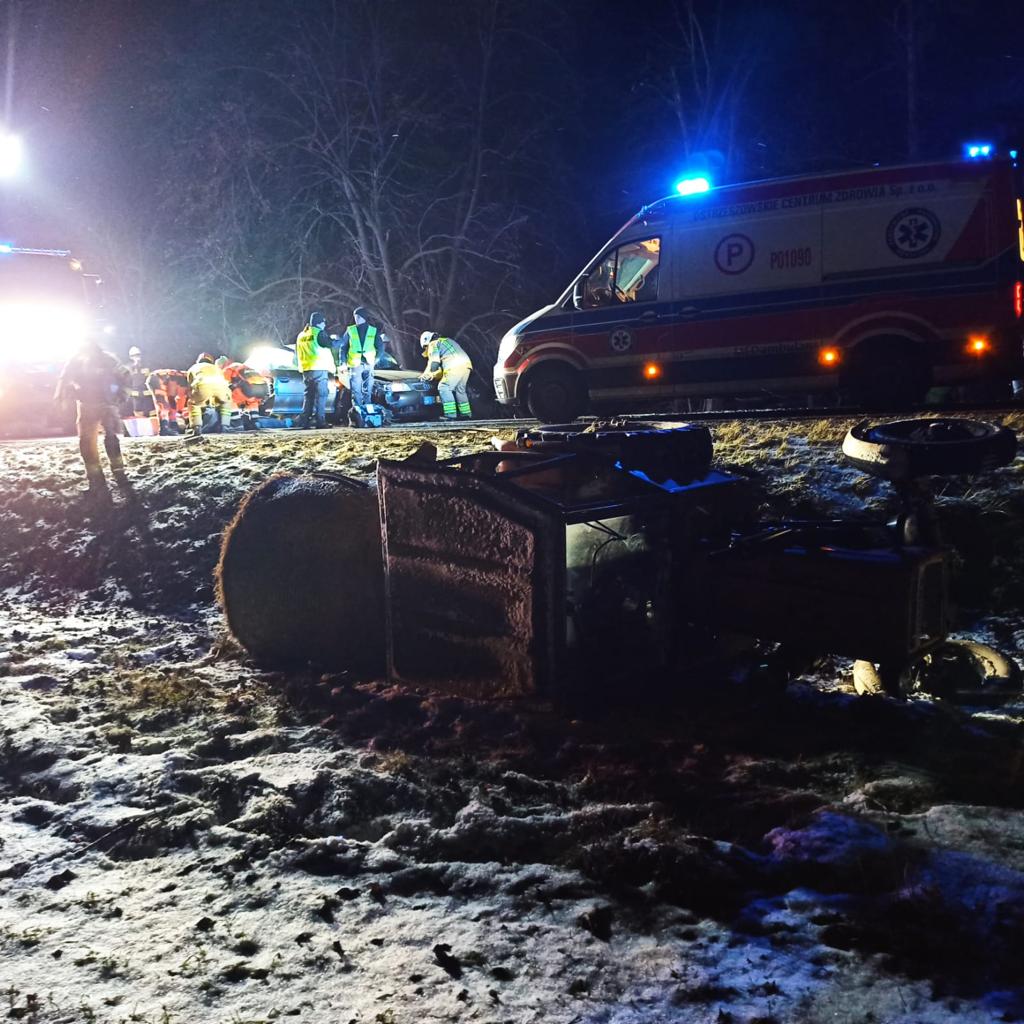 Na miejscu zdarzenia zastano dwa samochody osobowe oraz ciągnik rolniczy po zderzeniu. Działania strażaków polegały na zabezpieczeniu miejsca zdarzenia oraz przeprowadzono rozpoznanie. W jednym z pojazdów znajdował się nieprzytomny kierowca.