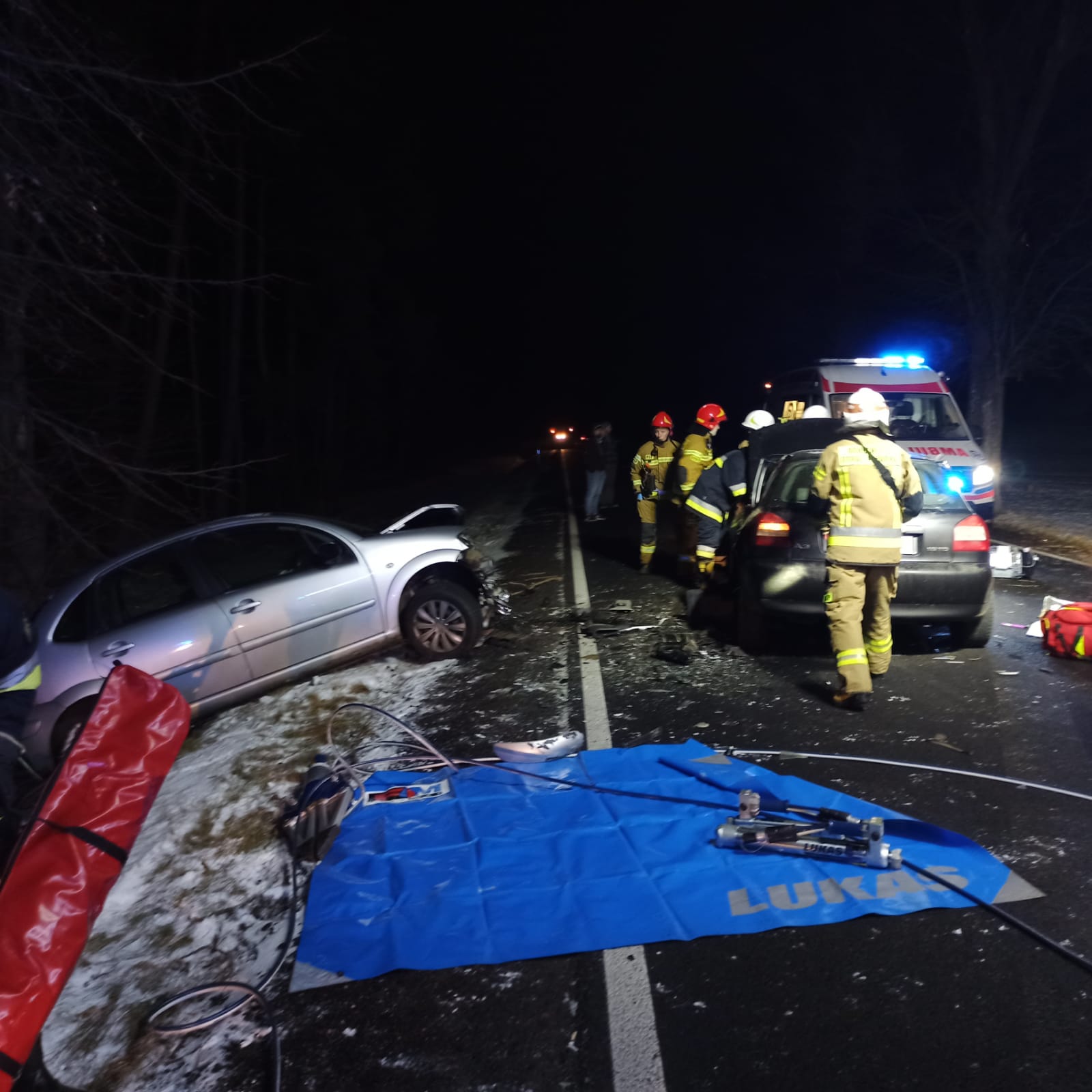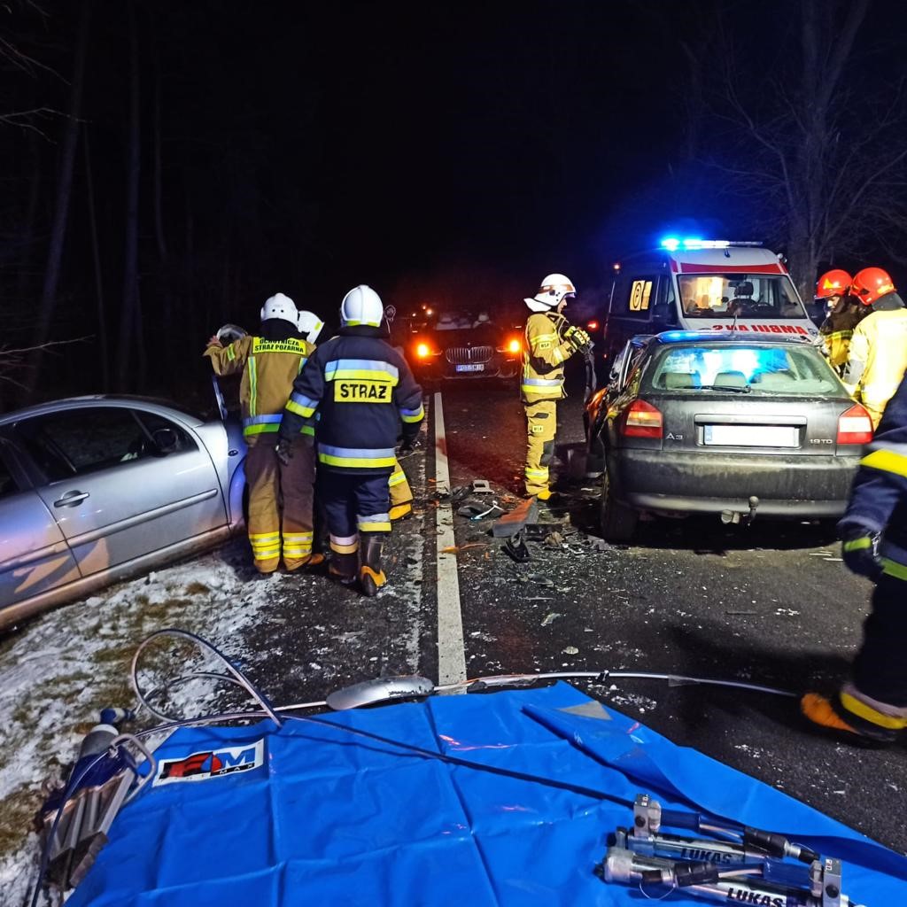Strażacy przy pomocy sprzętu hydraulicznego wykonali dostęp do osoby poszkodowanej, a następnie wraz z Zespołem Ratownictwa Medycznego ewakuowali ją z pojazdu. Równocześnie ratownicy udzielali kwalifikowanej pierwszej pomocy pozostałym dwóm osobom poszkodowanym. Na miejsce zdarzenia przybyło Lotnicze Pogotowie Ratunkowe. Niestety lekarz stwierdził zgon mężczyzny wydobytego z pojazdu. Jedna z osób poszkodowanych została zabrana śmigłowcem LPR do szpitala.