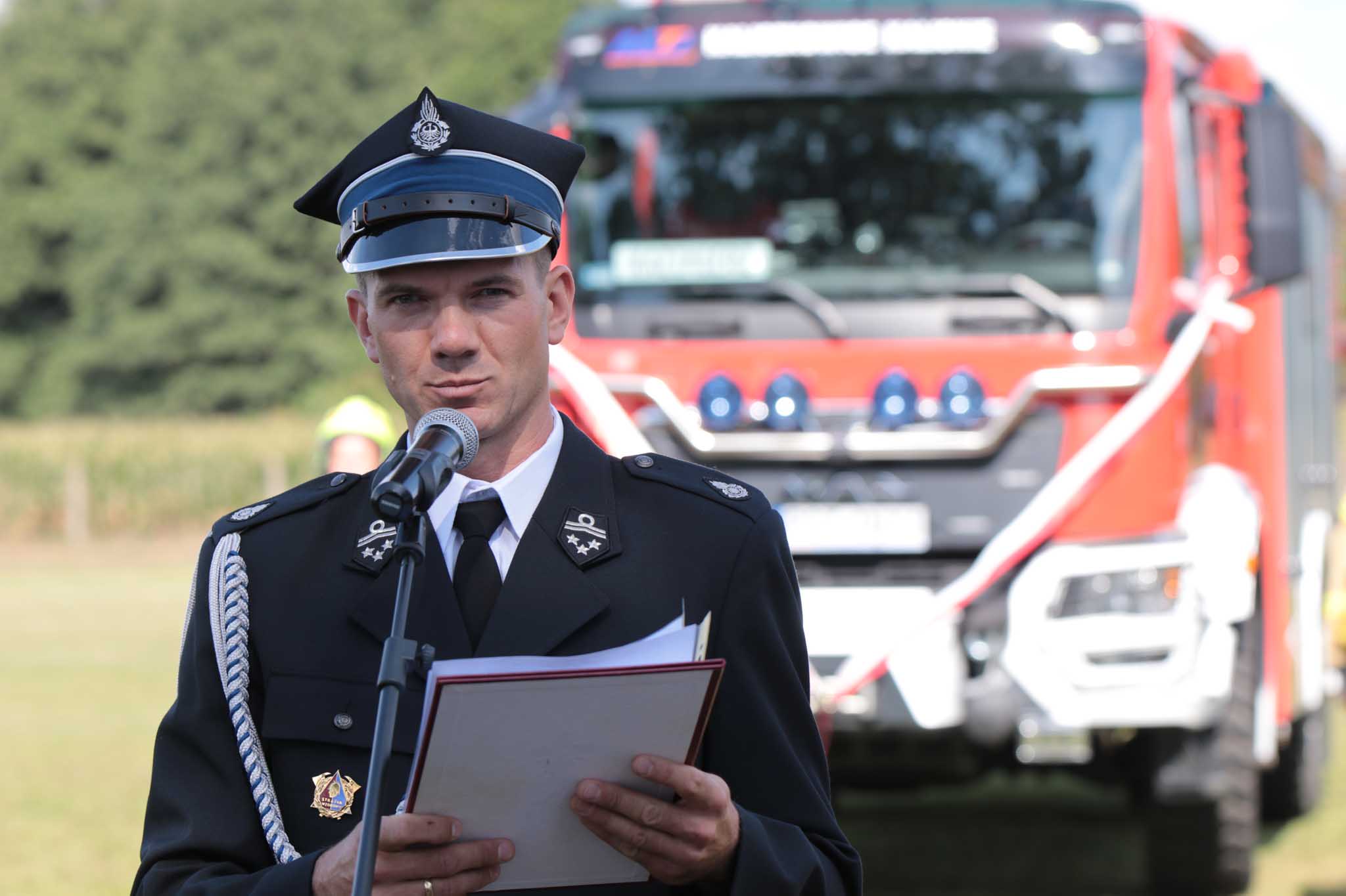 Kulminacją apelu było uroczyste poświęcenie samochodu i symboliczne przekazanie kluczyków do samochodu pożarniczego GBA 4/29,7 MAN TGM na ręce prezesa. Po przekazaniu nastąpiły wystąpienia zaproszonych gości, w trakcie przemówień padło wiele gratulacji, ciepłych słów oraz życzeń i podziękowań za wytrwałość w pozyskaniu nowego pojazdu, za codzienną gotowość operacyjną, ofiarność w ratowaniu dobytku oraz życia ludzkiego. Głos miedzy innymi zabrali: Pani Katarzyna Sójka – Poseł na Sejm Rzeczypospolitej Polskiej, list gratulacyjny w imieniu Pani Marleny Maląg – Minister Rodziny i Polityki Społecznej odczytał Pan Piotr Trybek, następnie głos zabrał bryg. Tomasz Grelak Zastępca Wielkopolskiego Komendanta Wojewódzkiego Państwowej Straży Pożarnej w Poznaniu, Pan Lech Janicki – Starosta Ostrzeszowski oraz dh Tomasz Mak – Prezes Zarządu Oddziału Powiatowego Związku Ochotniczych Straży Pożarnych Rzeczpospolitej Polskiej w Ostrzeszowie.