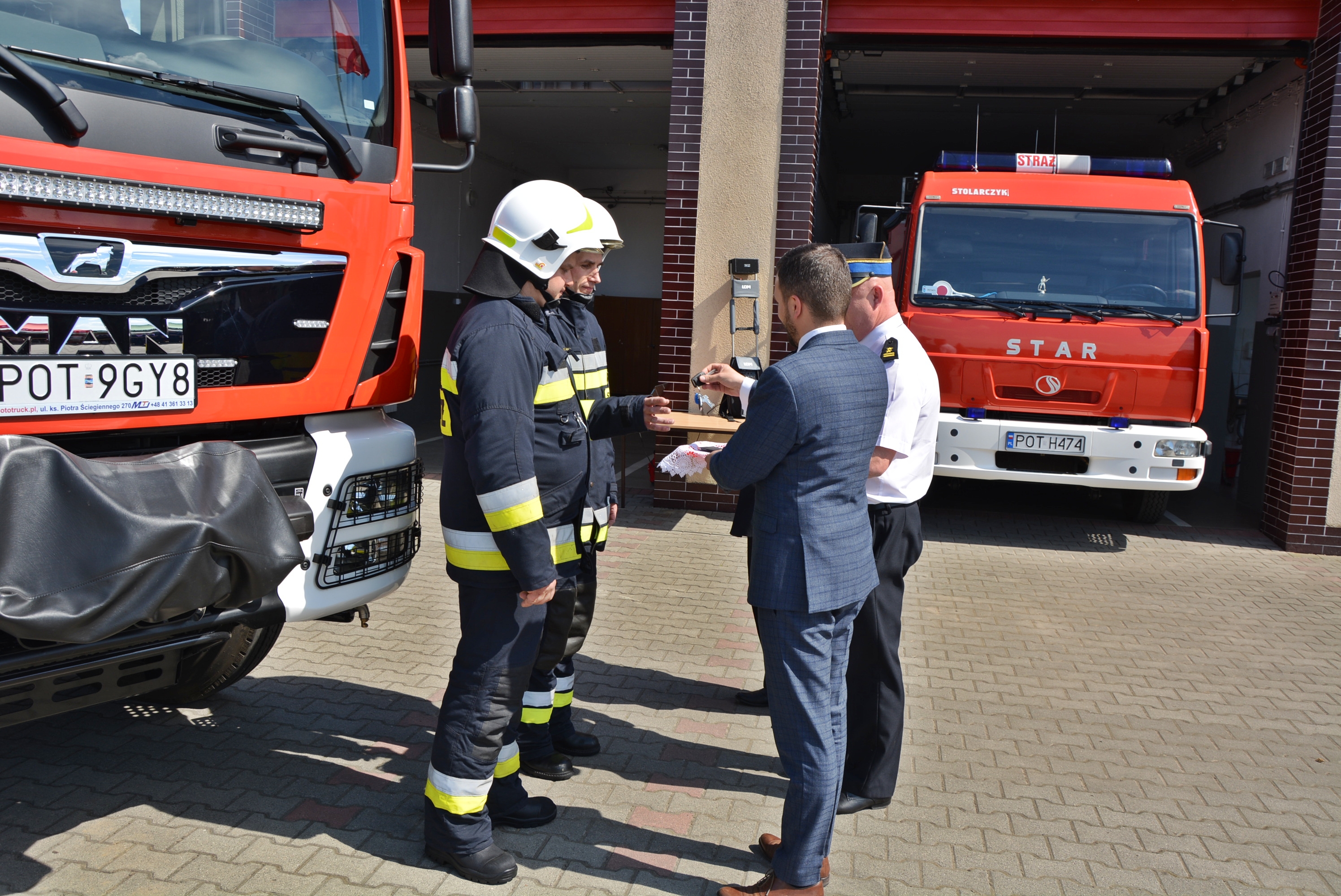 Burmistrz Miasta i Gminy Grabów nad Prosną wraz z Zastępcą Komendanta Powiatowego w Ostrzeszowie bryg. Mariuszem Szczepańskim przekazali kluczyki druhom z Ochotniczej Straży Pożarnej w Bukownicy do nowego samochodu ratowniczo gaśniczego marki MAN.
