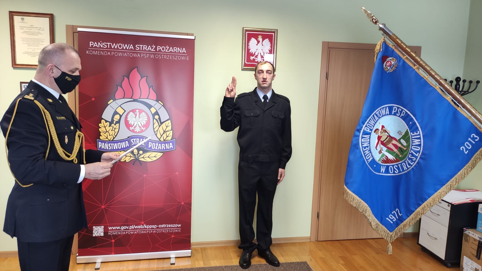 11 stycznia 2021 roku w Komendzie Powiatowej Państwowej Straży Pożarnej w Ostrzeszowie, odbyło się uroczyste ślubowanie strażaka Kamila Dzięcielskiego, który rozpoczął służbę w Jednostce Ratowniczo-Gaśniczej w Ostrzeszowie. Ślubowanie przyjął Komendant Powiatowy PSP bryg. Piotr Mazurkiewicz. Ślubowanie to bardzo uroczysty i podniosły moment w życiu zawodowym każdego strażaka.