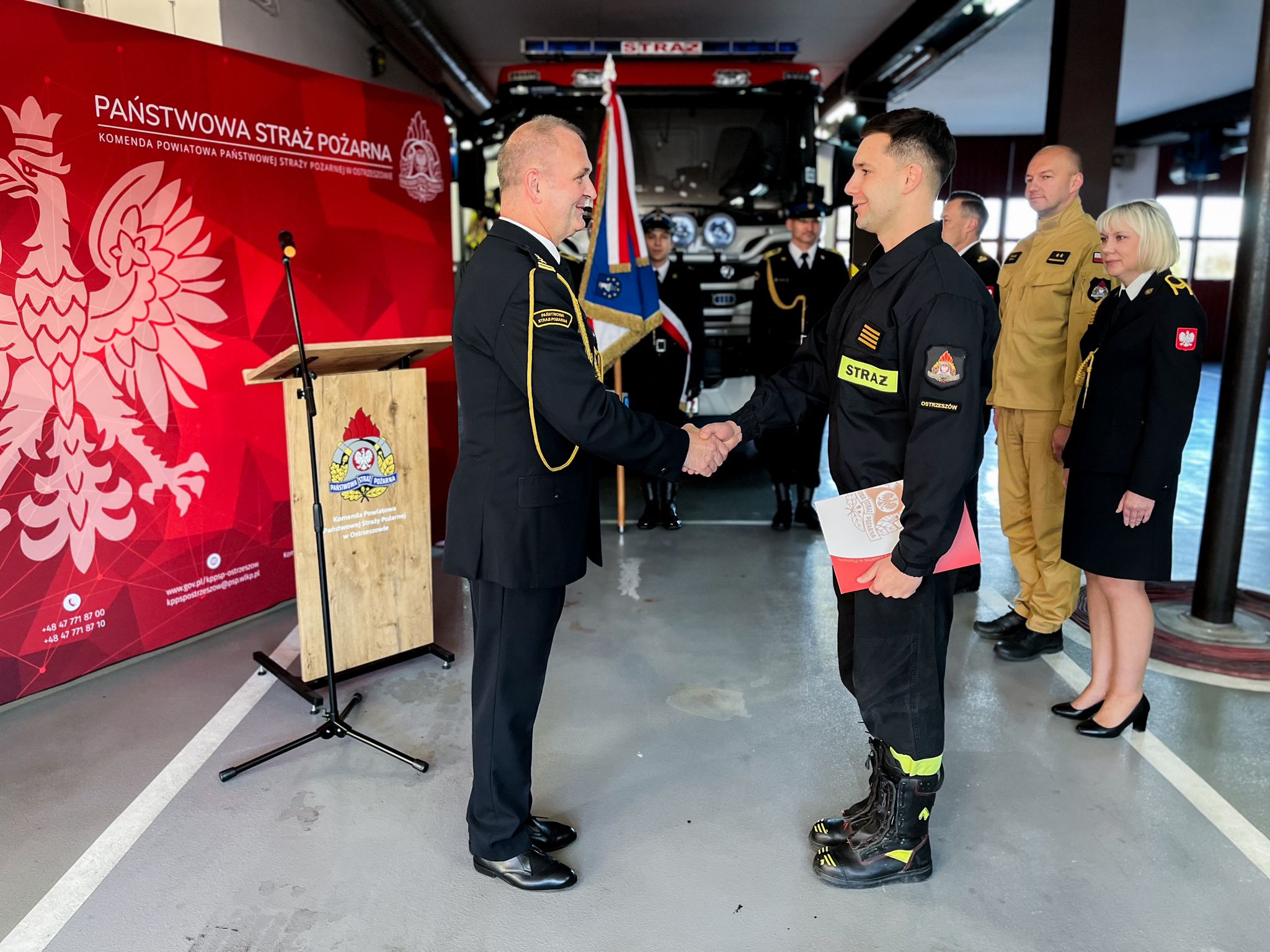 Ponadto, podczas uroczystego apelu została wręczona nominacja na wyższy stopień służbowy. Wielkopolski Komendant Wojewódzki Państwowej Straży Pożarnej w Poznaniu nadbryg. Dariusz Matczak z dniem 11 listopada 2023 roku nadał stopień młodszego ogniomistrza starszemu sekcyjnemu Mateuszowi Lisowi.