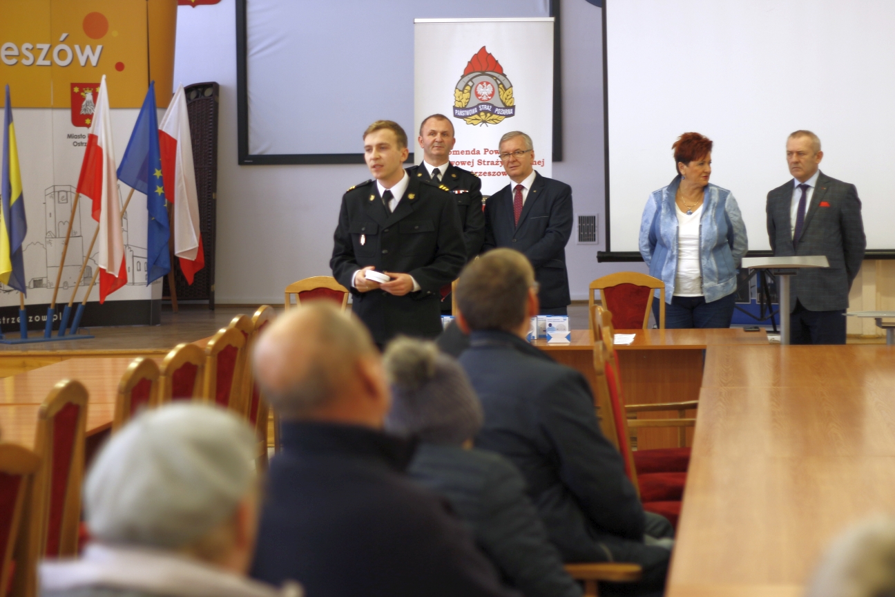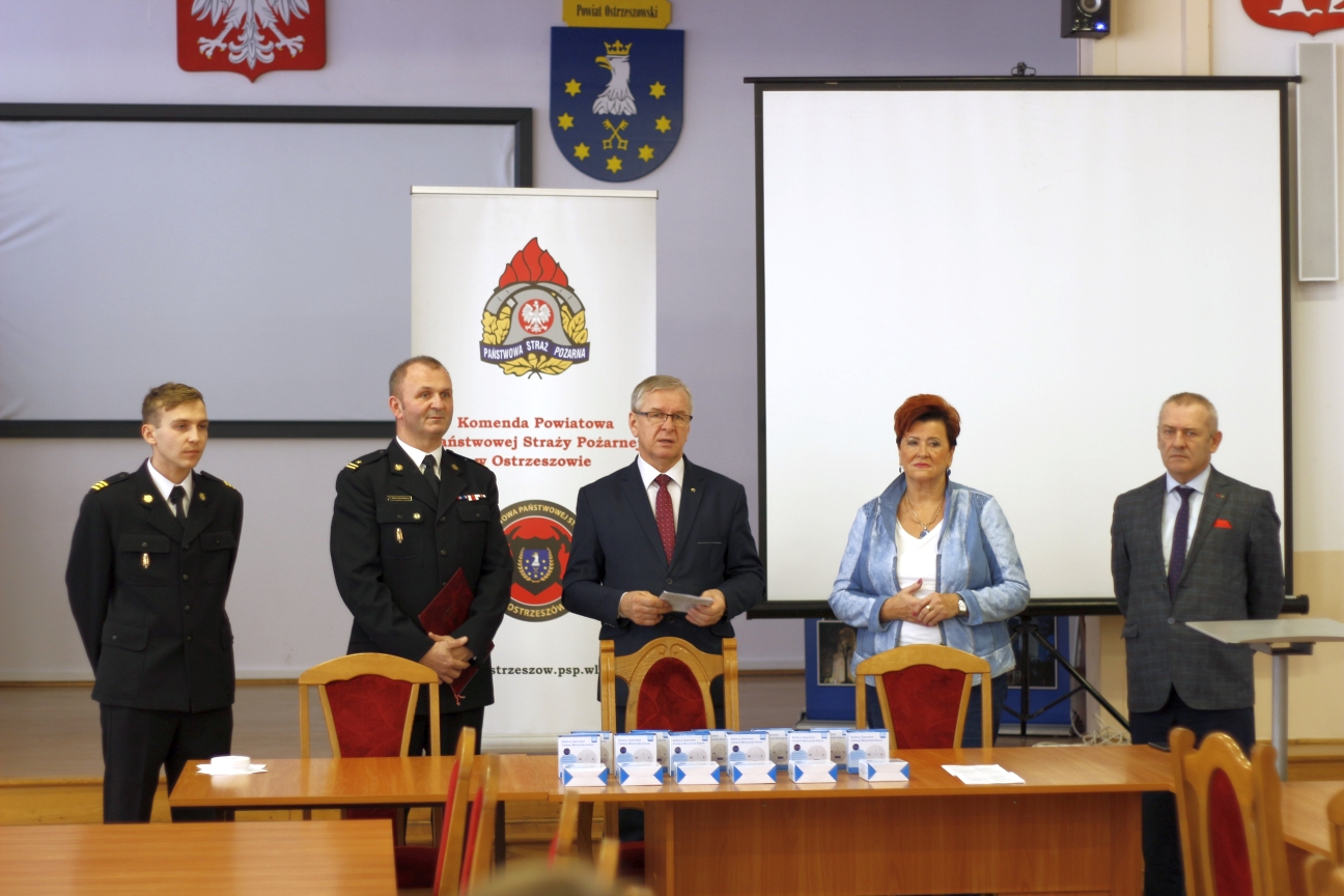 W poniedziałek 2 grudnia 2019 roku w sali sesyjnej Starostwa Powiatowego w Ostrzeszowie, odbyło się przekazanie blisko 100 czujek tlenku węgla, wylosowanych w ramach akcji prewencji społecznej organizowanej z inicjatywy Komendy Powiatowej Państwowej Straży Pożarnej w Ostrzeszowie i Starostwa Powiatowego w Ostrzeszowie na falach Radia SUD. Tym razem kampania prowadzona była dla mieszkańców 3 powiatów tj. ostrzeszowskiego, kępińskiego i wieruszowskiego woj. łódzkie. Celem akcji było propagowanie wiedzy z zakresu ochrony przeciwpożarowej, a tym samym zwiększenie bezpieczeństwa pożarowego mieszkańców. Zakup czujek dla naszego powiatu sfinansowany został z budżetu powiatu oraz Stowarzyszenia Bezpieczny Powiat. W spotkaniu wziął udział Pan Lech Janicki Starosta Powiatu Ostrzeszowskiego, Pani Zofia Witkowska Wicestarosta Ostrzeszowski a zarazem Wiceprezes Stowarzyszenia Bezpieczny Powiat w Ostrzeszowie, Pan Adam Mickiewicz członek Zarządu Powiatu Ostrzeszowskiego, mł. bryg. Piotr Mazurkiewicz Komendant Powiatowy PSP w Ostrzeszowie. Przy okazji spotkania strażacy mówili o korzyściach wynikających z posiadania takiego urządzenia.