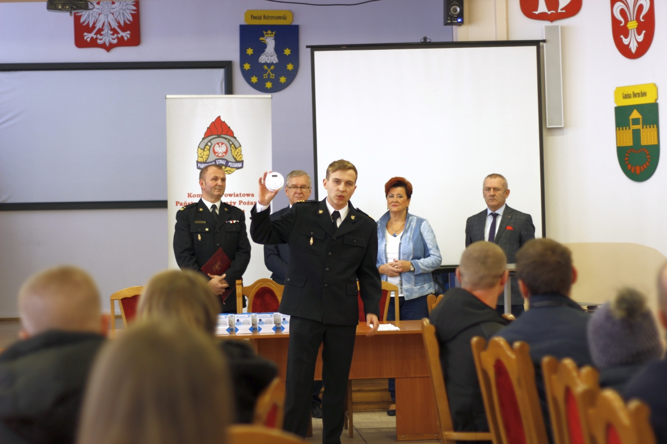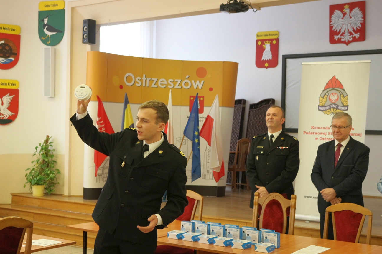 Jednym z punktów uroczystości był krótki instruktaż instalacji czujki. Producent zaleca, żeby czujki nie montować w bezpośrednim sąsiedztwie urządzeń, które mogą być źródłem tlenku węgla, tylko minimum 4,5 metra od niego – informował st. sekc. Damian Stempniewicz lider prewencji społecznej z KP PSP w Ostrzeszowie.