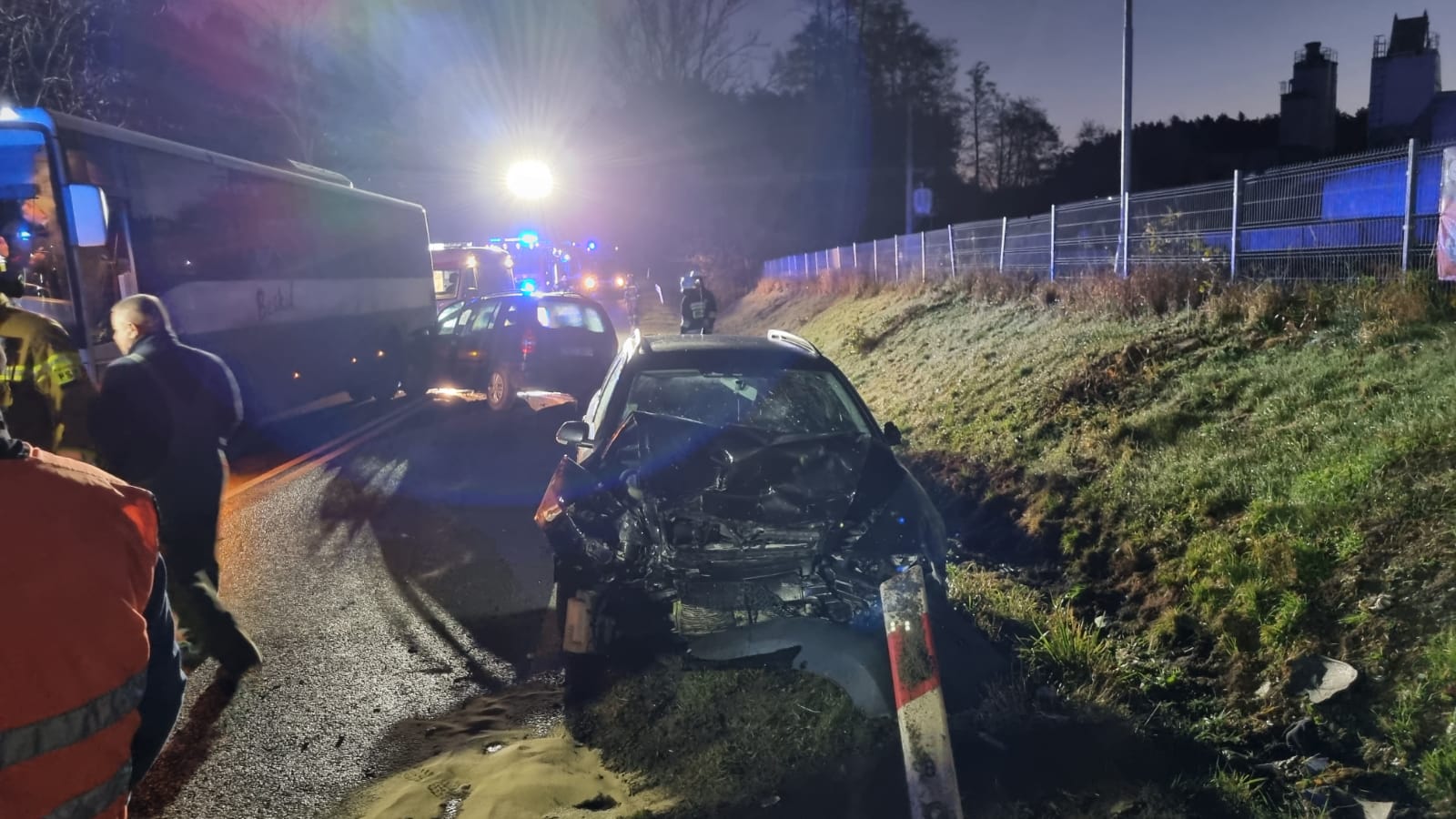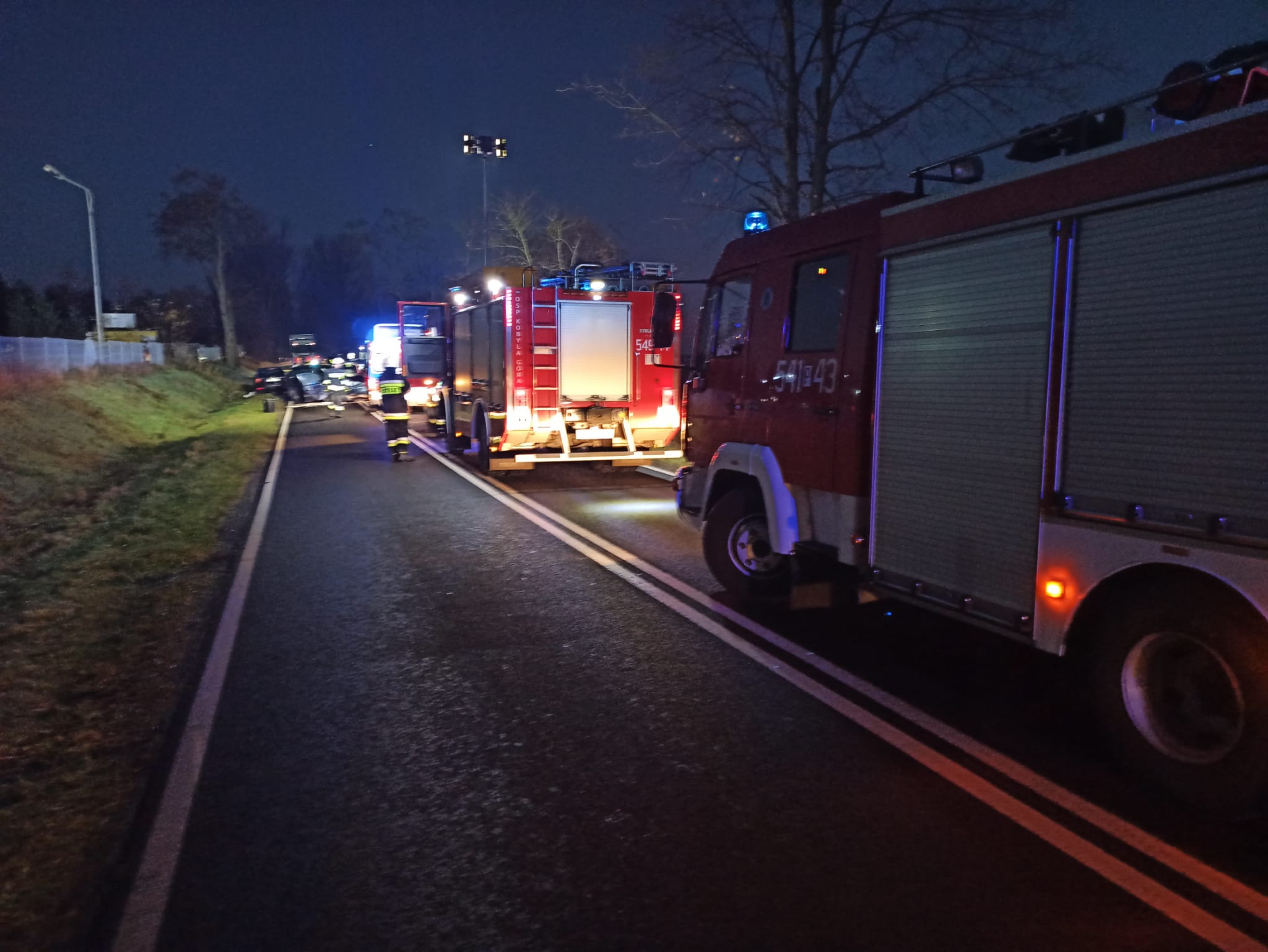 Przybyłe na miejsce jednostki ochrony przeciwpożarowej zastały całkowicie zablokowaną drogę wojewódzką 449. Ustalono, że w zdarzeniu uczestniczyły dwa samochody osobowe oraz autobus. W wyniku zdarzenia dwie osoby zostały poszkodowane.