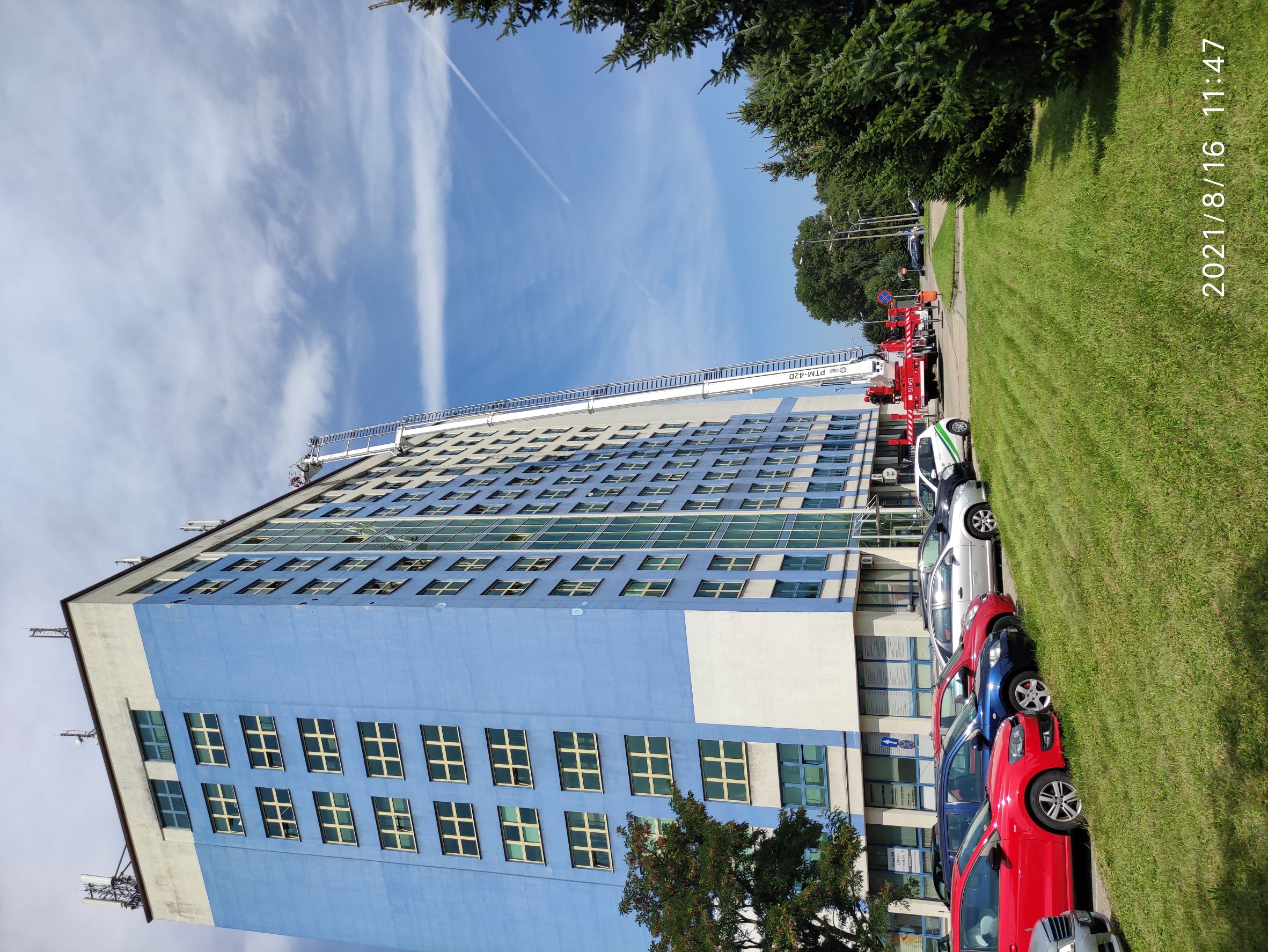 W dniu 16 sierpnia br., w związku z wprowadzeniem do podziału bojowego w JRG Oświęcim nowego samochodu specjalistycznego- podnośnika SCHD42 na podwoziu Mercedes, na terenie miasta w wybranych lokalizacjach przeprowadzono praktyczne ćwiczenia, sprawdzające możliwości manewrowe tego sprzętu. Ćwiczenia przeprowadzono na obiektach wysokich: ponad 40 – metrowy budynek Medical Tower w Oświęcimiu ul. Chemików oraz 12 – kondygnacyjnych budynkach mieszkalnych wielorodzinnych przy ul. 3 Maja oraz Nojego. Próby rozstawienia podnośnika potwierdziły jego spore możliwości operacyjne – zasięg 42 m oraz dobre parametry manewrowe, wynikające z posiadania tylnej osi skrętnej, co jest szczególnie przydatne w ciasnej zabudowie miejskiej, przy ograniczonych możliwościach dojazdu i gęsto zaparkowanych pojazdach.