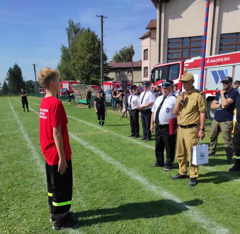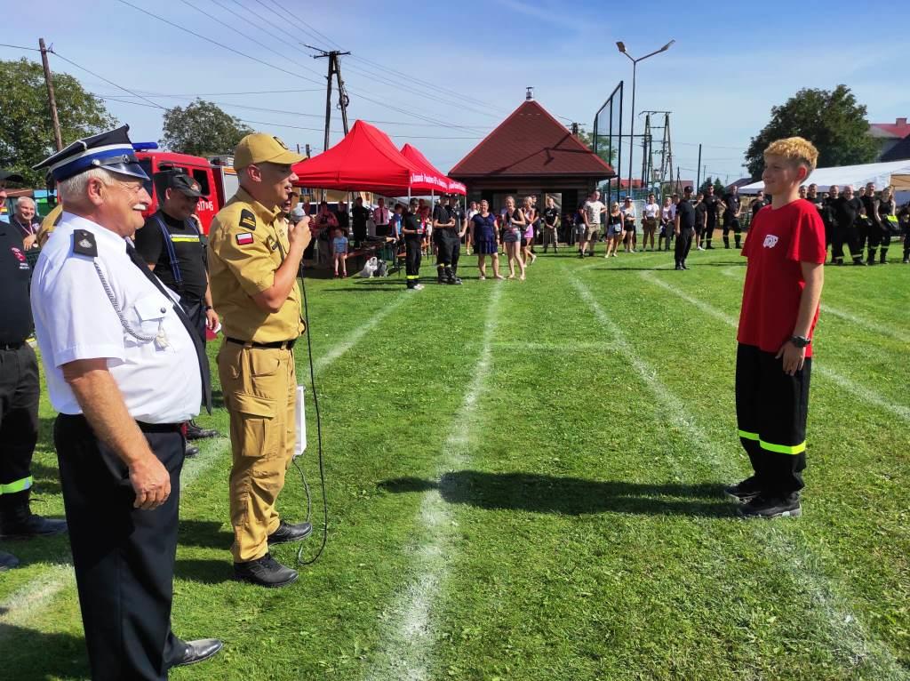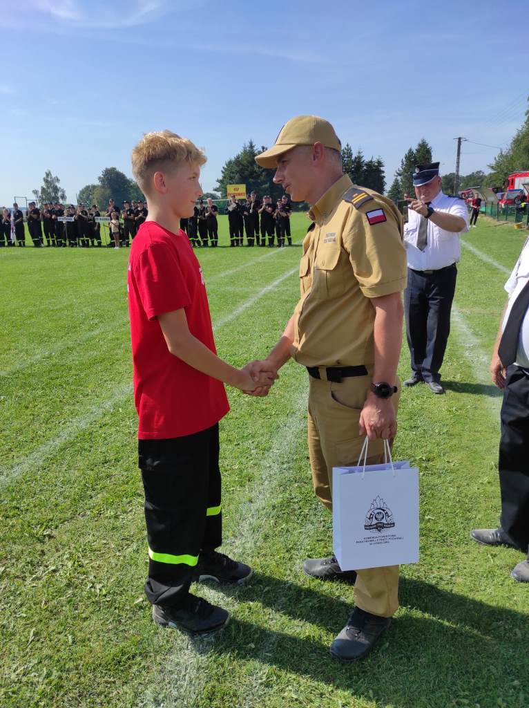 W trakcie powiatowych zawodów sportowo-pożarniczych mł. bryg. Marcin Głogowski – Komendant Powiatowy PSP w Oświęcimiu oraz dh Tadeusz Morończyk – Prezes Zarządu Oddziału Powiatowego ZOSP RP złożyli podziękowania dla Kacpra za właściwą postawę w czasie wypadku samochodowego w Harmężach 12 sierpnia br. Kacper wykazał się ofiarnością i umiejętnością udzielania pierwszej pomocy w czasie zdarzenia drogowego z trzema osobami poszkodowanymi.