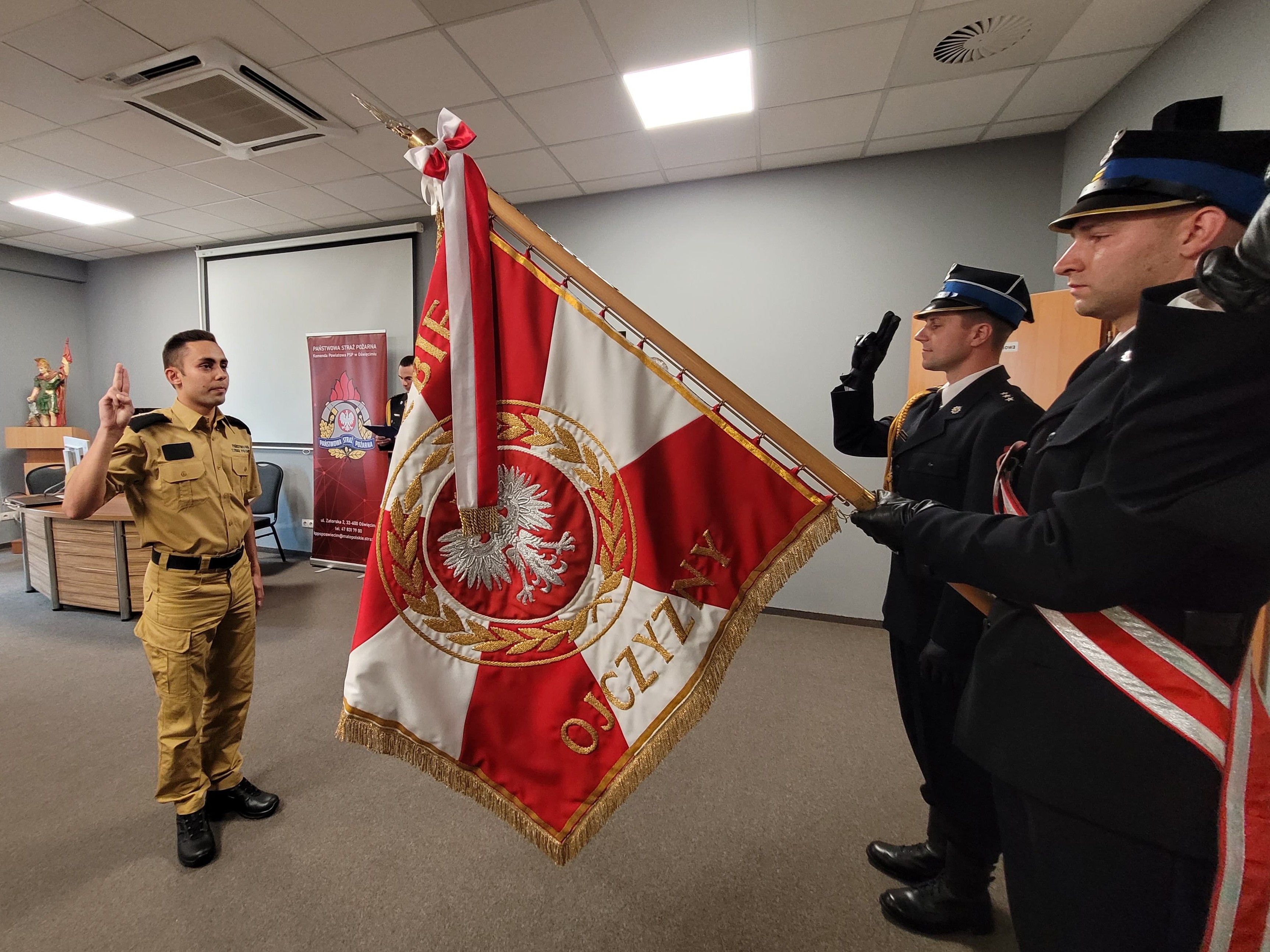 Strażakowi składającemu ślubowanie życzymy powodzenia jednocześnie witając w szeregach Państwowej Straży Pożarnej.