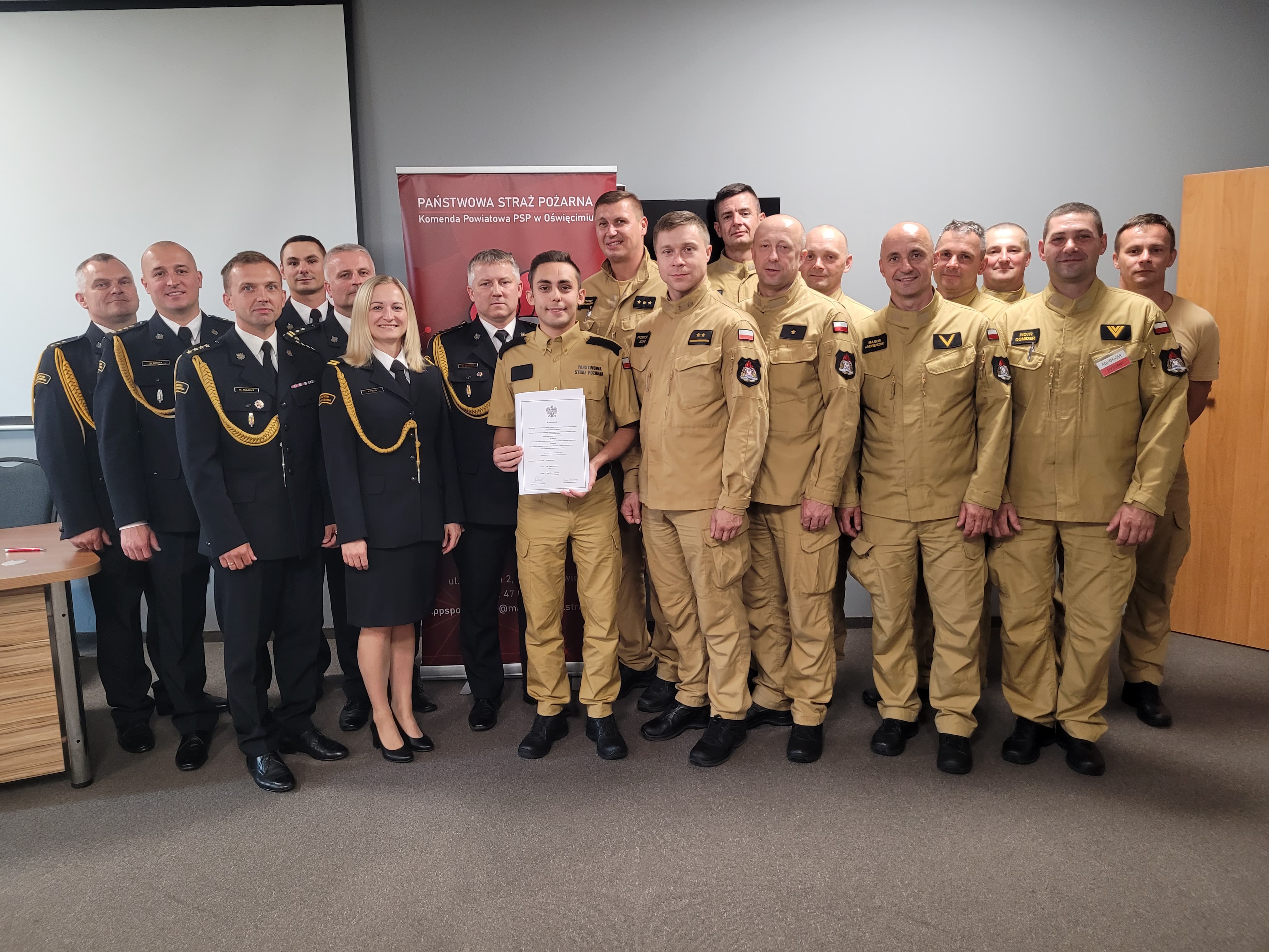 15.07.2025 r. w Komendzie Powiatowej PSP w Oświęcimiu odbyło się ślubowanie nowo przyjętego funkcjonariusza Państwowej Straży Pożarnej. W zbiórce udział wzięli: Komendant Powiatowy PSP w Oświęcimiu bryg. Ryszard Dudek, p.o. Zastępca Komendanta Powiatowego PSP w Oświęcimiu st. kpt. Maciej Dziura oraz kadra dowódcza Komendy Powiatowej PSP w Oświęcimiu. Rotę ślubowania złożył strażak Kacper Kwadrans.