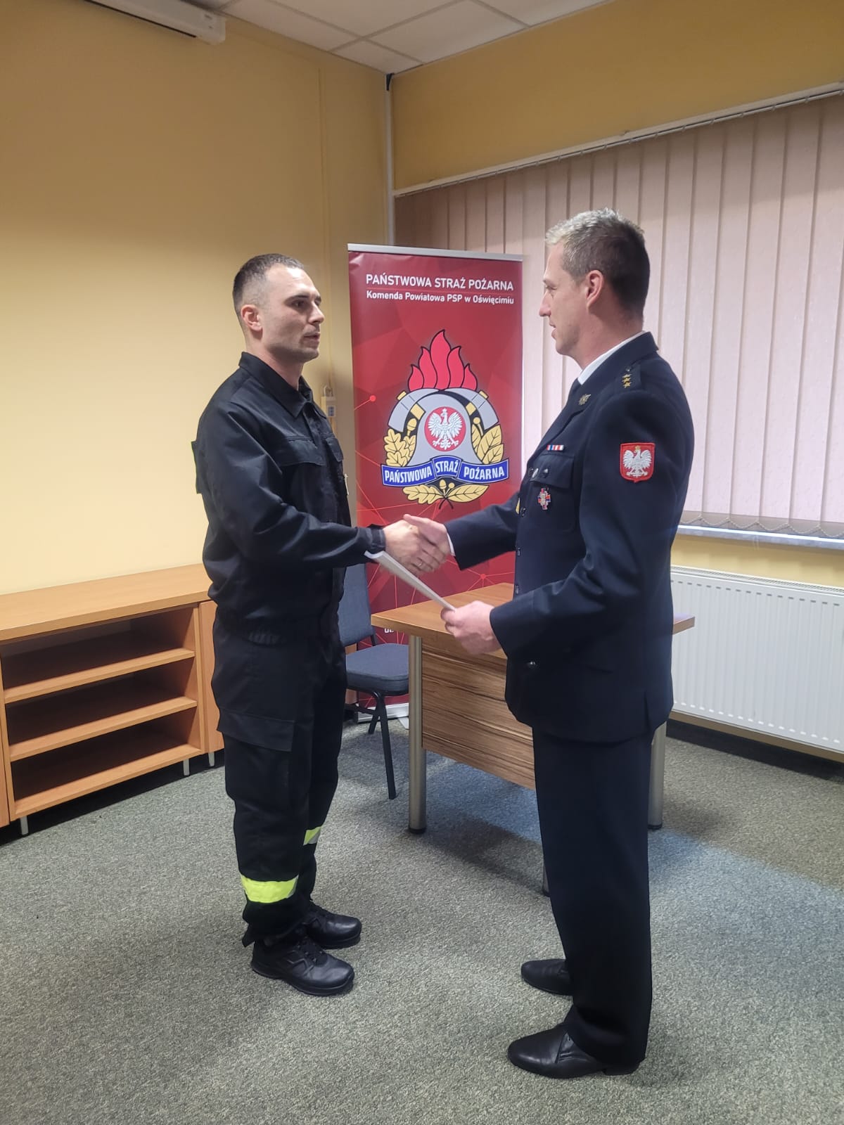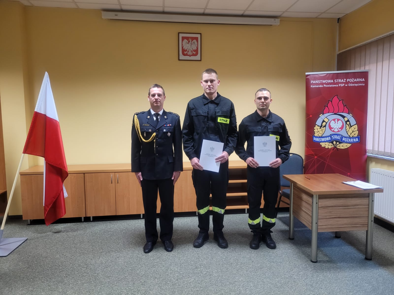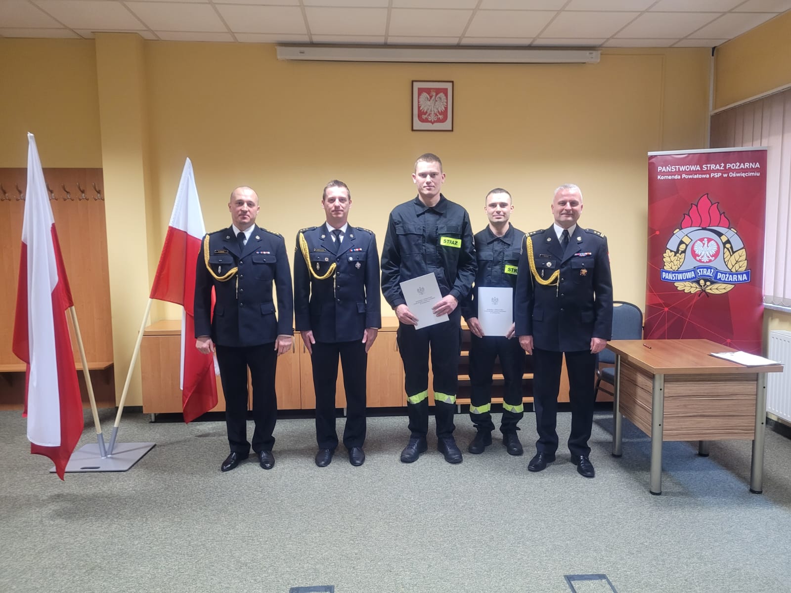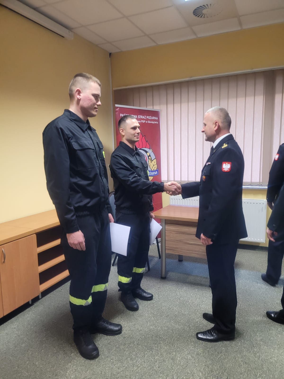 18.12.2024 r. w Komendzie Powiatowej PSP w Oświęcimiu odbyło się ślubowanie nowo przyjętych funkcjonariuszy Państwowej Straży Pożarnej. W zbiórce udział wzięli: p.o. Zastępca Komendanta Powiatowego PSP w Oświęcimiu kpt. Michał Senkowski oraz kadra dowódcza Komendy Powiatowej PSP w Oświęcimiu. Rotę ślubowania złożył strażak Mateusz Brusik oraz strażak Oskar Gielas.