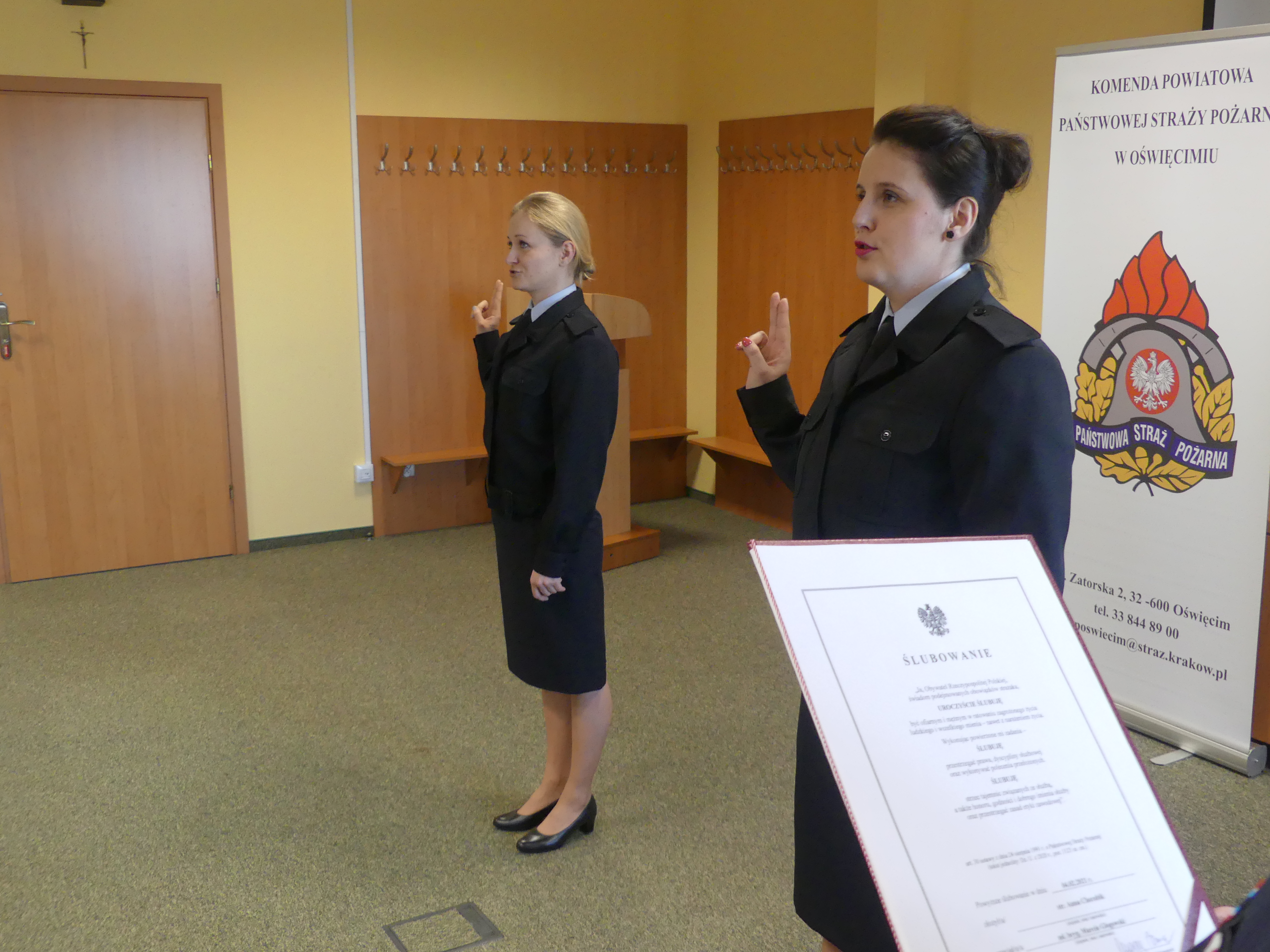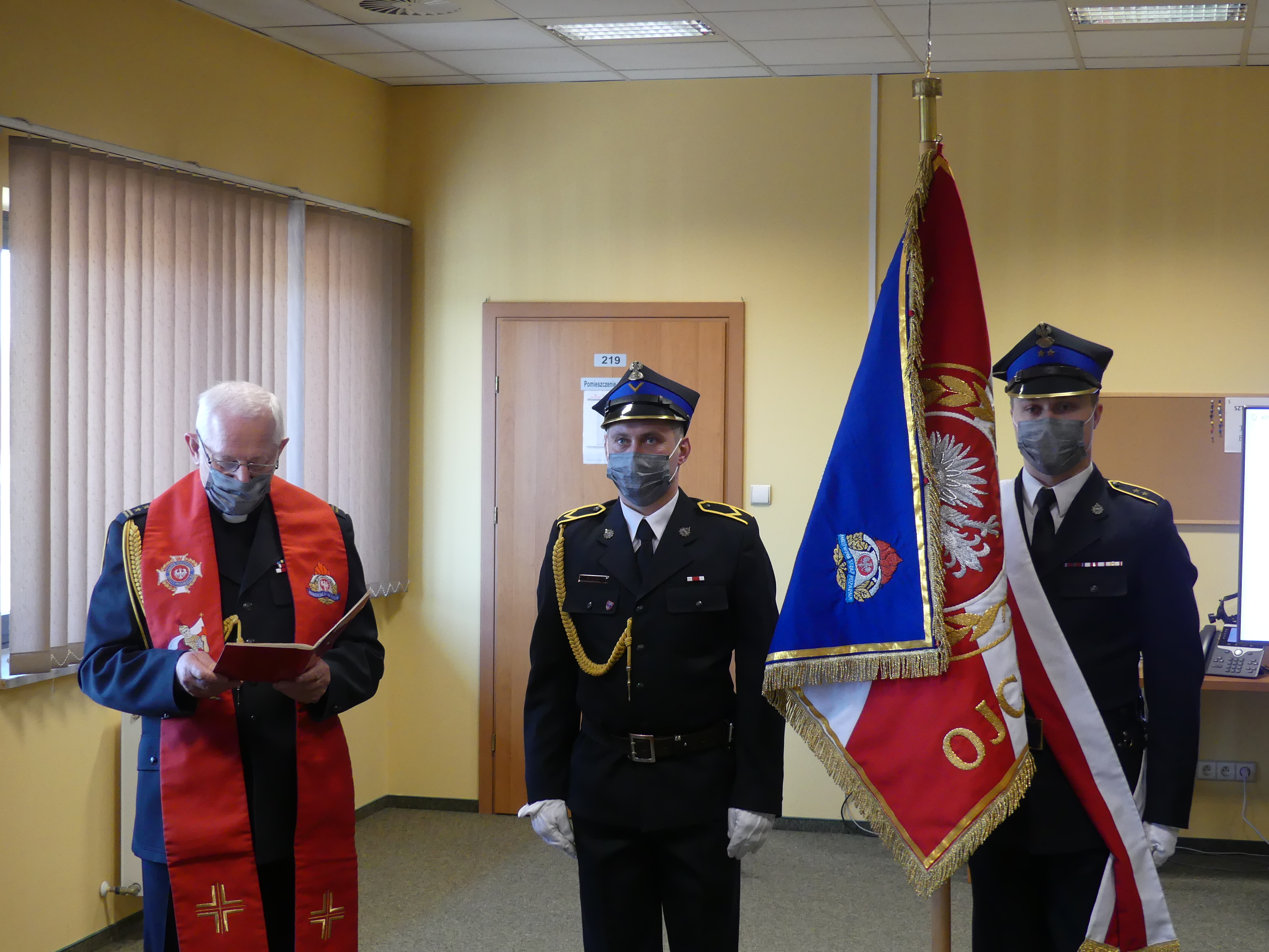 09.04.2021 r. w Komendzie Powiatowej PSP w Oświęcimiu odbyło się ślubowanie nowo przyjętych funkcjonariuszy Państwowej Straży Pożarnej. W zbiórce udział wzięli: kapelan Małopolskich Strażaków bryg. Władysław Kulig, Komendant Powiatowy PSP w Oświęcimiu mł. bryg. Marcin Głogowski oraz kadra dowódcza Komendy Powiatowej PSP w Oświęcimiu. Rotę ślubowania złożyła strażak Anna Chorabik oraz strażak Anna Piela.