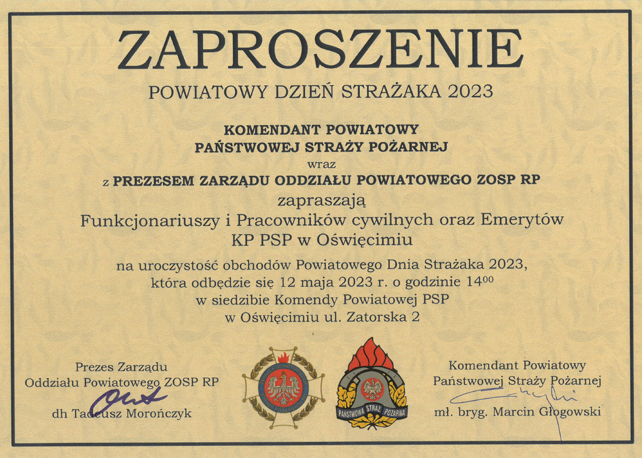 Zaproszenie na powiatowe obchody Dnia Strażaka 27.04.2023 Zdjęcia (2) Pokaż zdjęcie 1 z galerii. Pokaż zdjęcie 2 z galerii.
