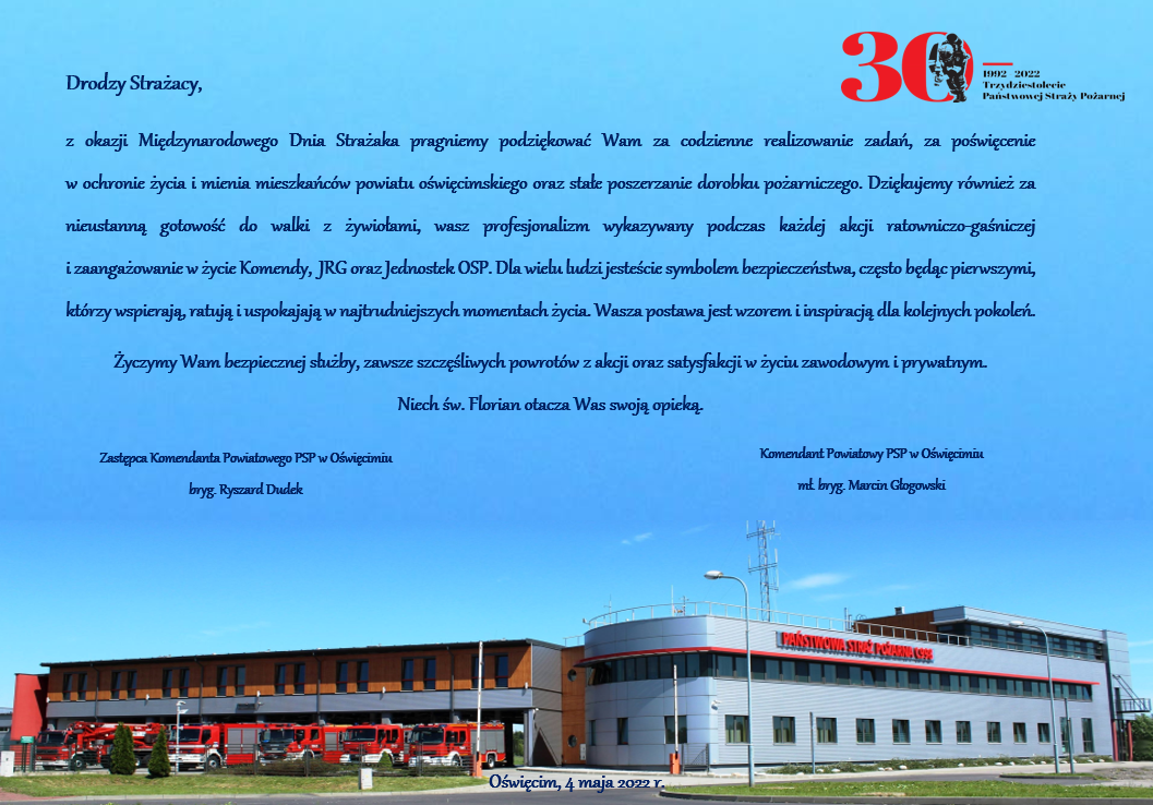 Życzenia Komendanta Powiatowego PSP w Oświęcimiu z okazji Dnia Strażaka Zdjęcia (1) Pokaż zdjęcie 1 z galerii.