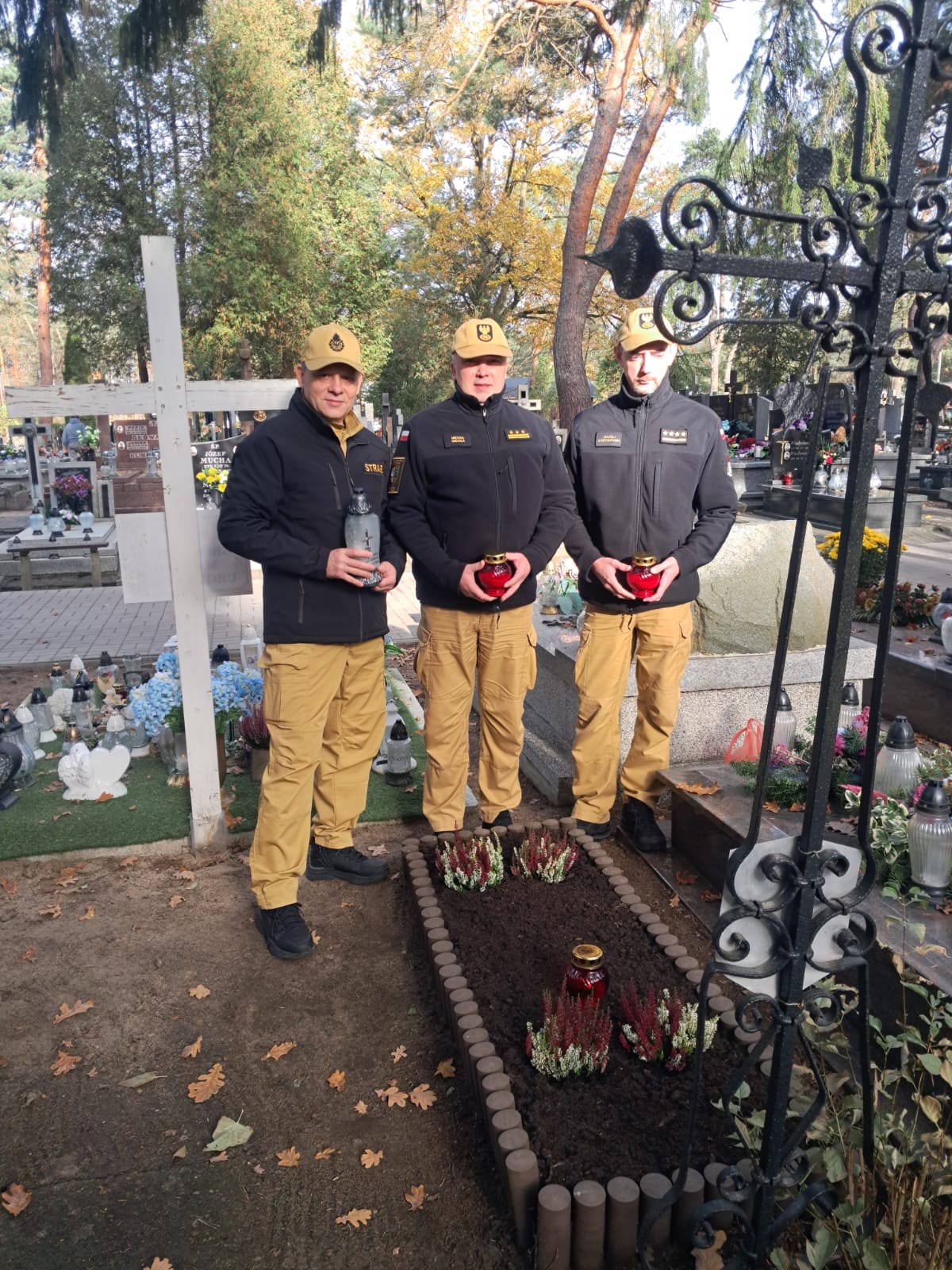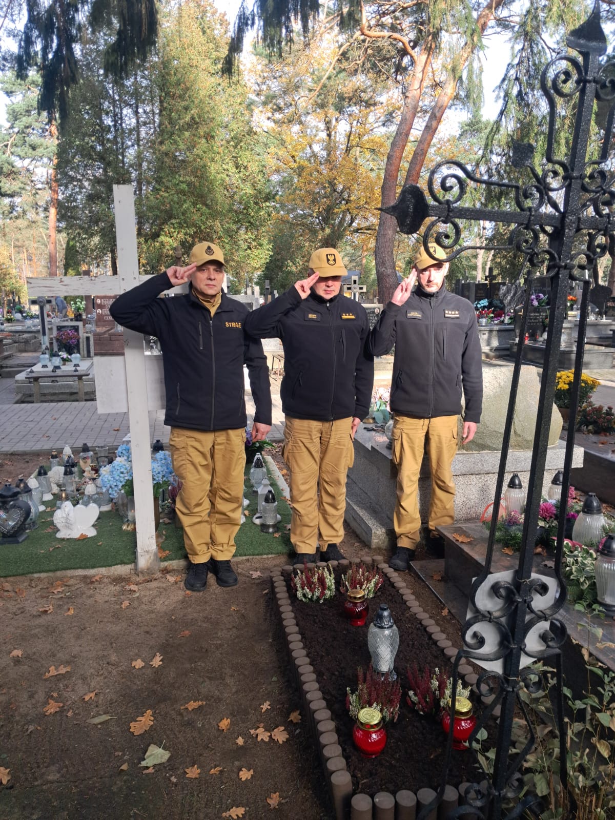 Pana st. bryg. Michała Gigoły oraz Zastępcy Komendnata Powiatowego Pana st. kpt. Macieja Łodygowskiego wraz z Prezesem Powiatowego Związku Ochotniczych Straży Pożarnych powiatu otwockiego druhem Mariuszem Zabrockim, złożyli kwiaty i zapalili symboliczne znicze na grobie Strzeżymira Rawicza Pruszyńskiego nestora otwockich strażaków.