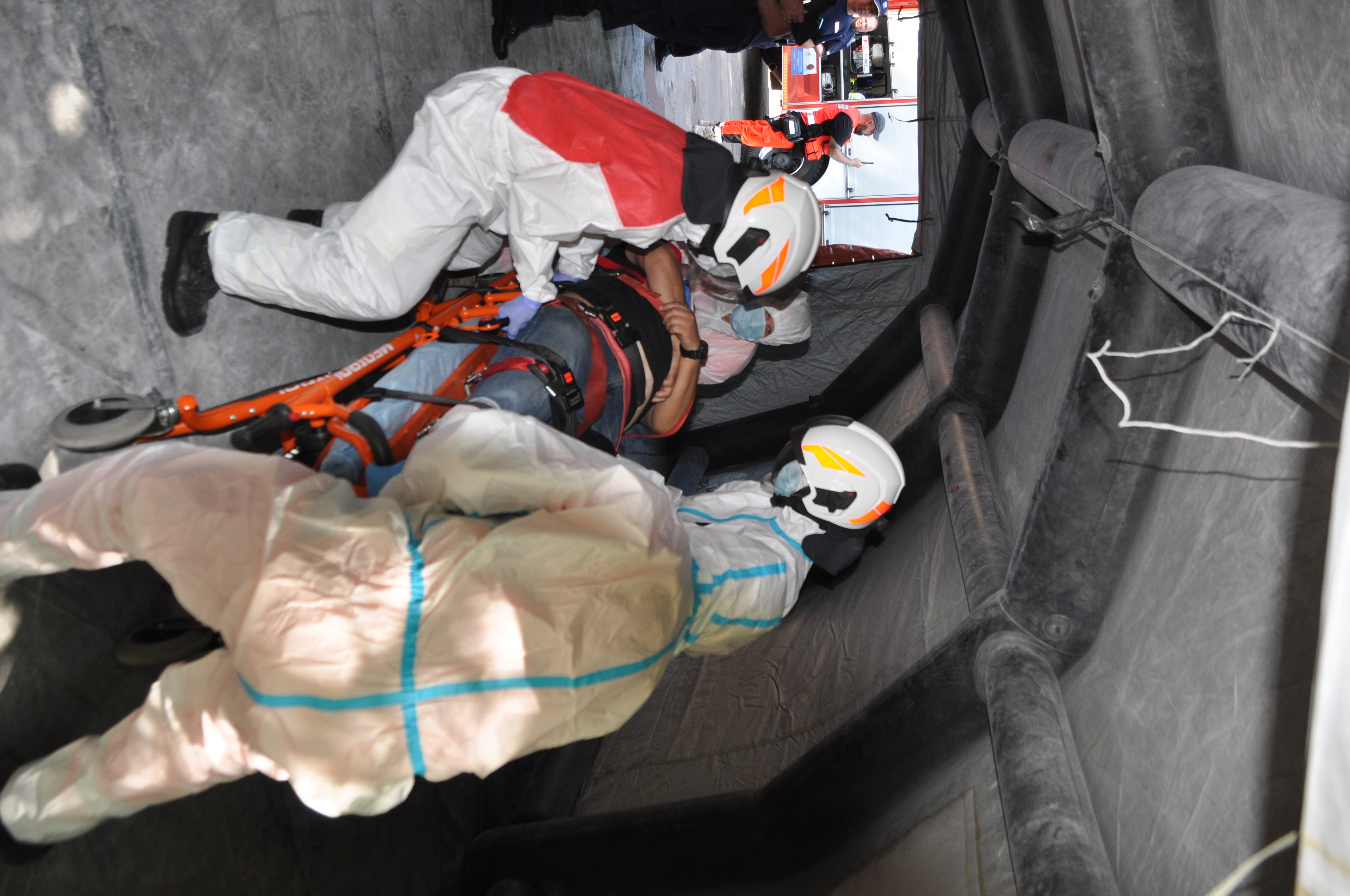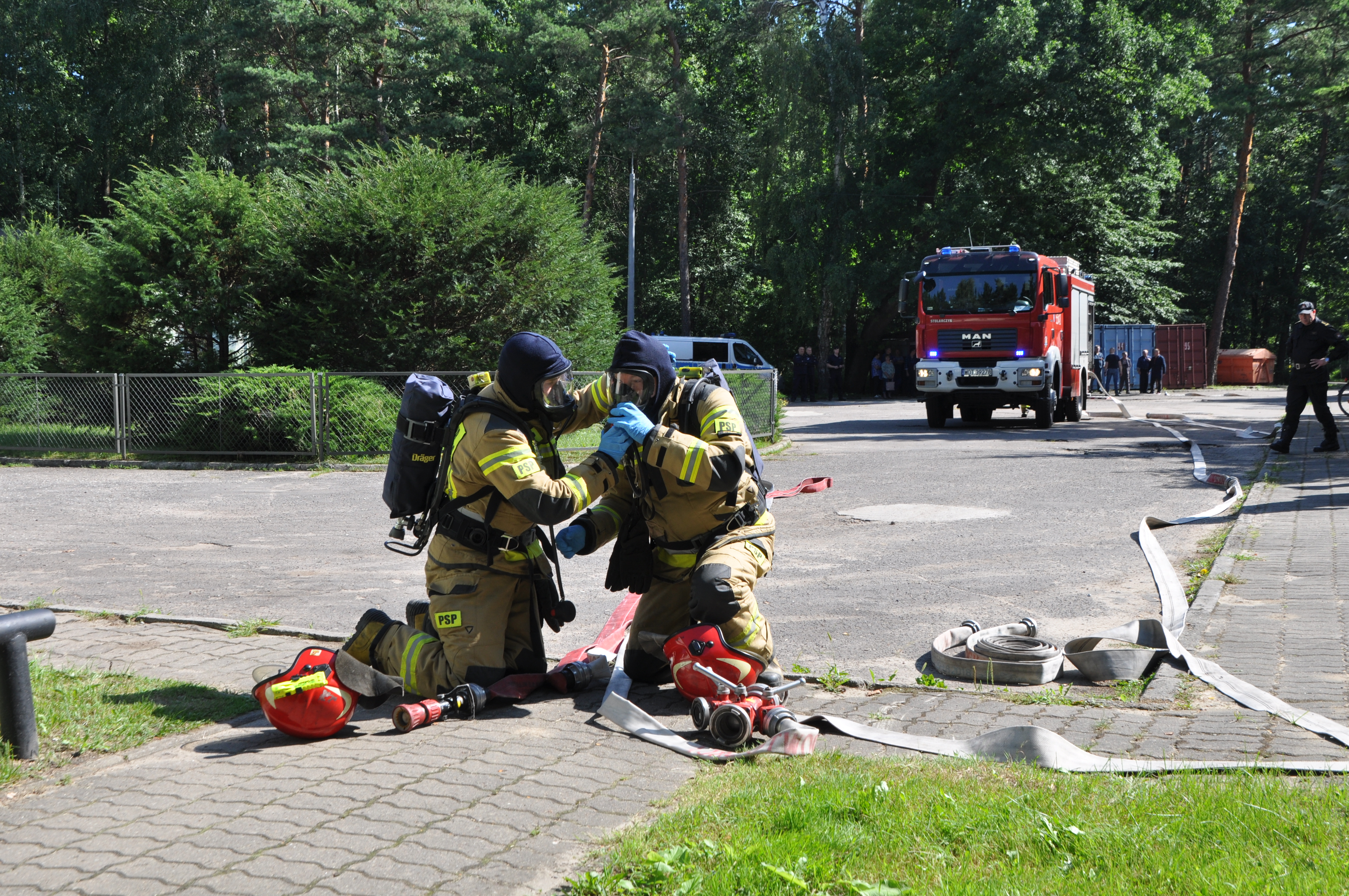 - sprawdzenie praktyczne metod organizacji i prowadzenia działań ratowniczo-gaśniczych obejmujących swoim zakresem: gaszenie pożarów, ewakuację osób z terenów objętych pożarem przy silnym zadymieniu, udzielanie kwalifikowanej pierwszej pomocy;