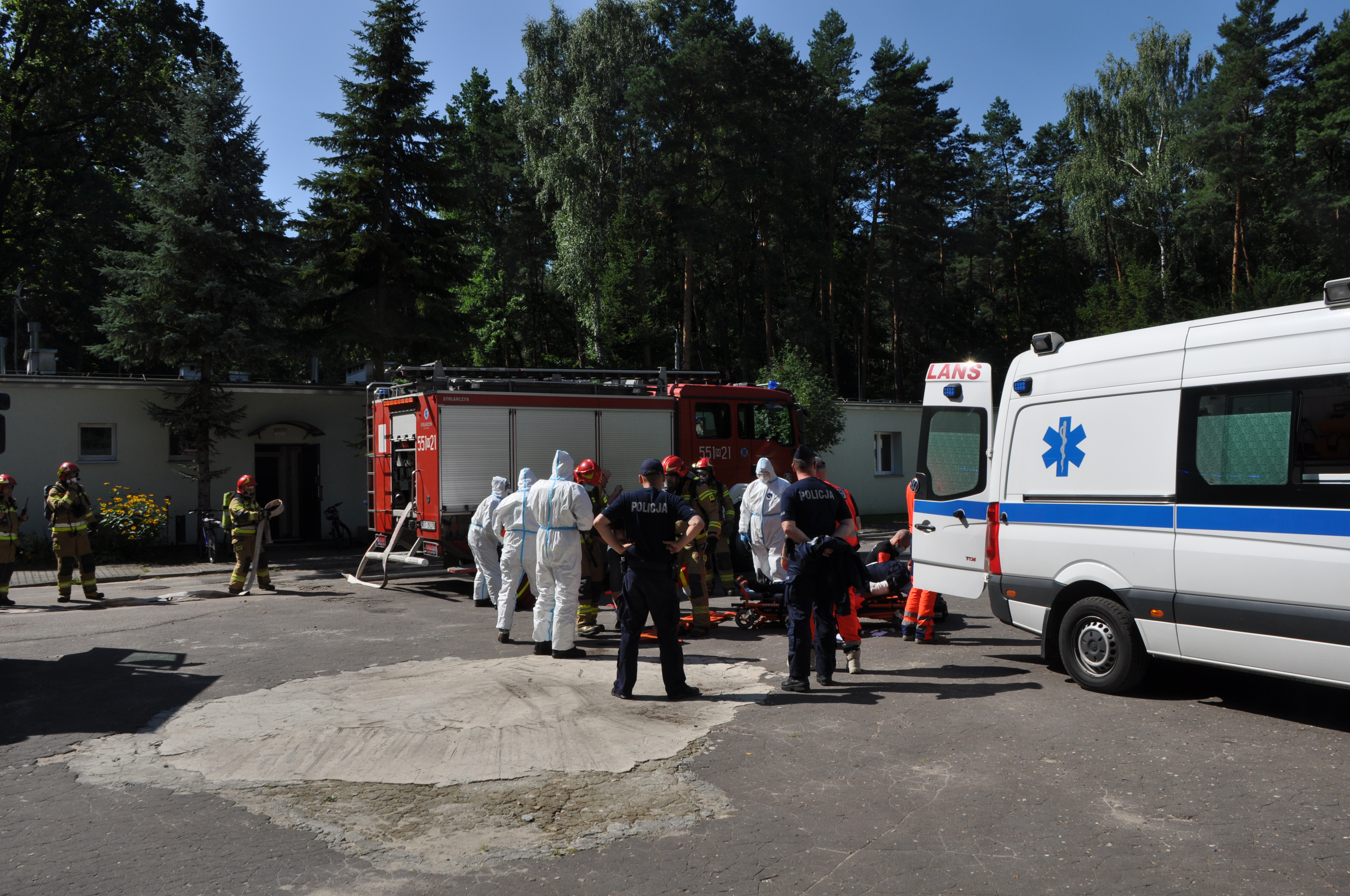 W scenariuszu do ćwiczeń założono, że na terenie CSU KSP w Starej Wsi w wyniku zaprószenia ognia dochodzi do pożaru w części budynku koszarowo-warsztatowego wydzielonego na cele izolacji funkcjonariuszy i pracowników Policji zarażonych wirusem COVID-19. Silne zadymienie wydobywające się spod drzwi dostrzega jedna z osób przebywająca na kwarantannie, powiadania odpowiednie służby i przełożonego. Nie mając możliwości ewakuacji uszczelnia drzwi od środka i pozostaje w pomieszczeniu. Po podniesieniu alarmu pożarowego z pozostałych części budynku następuje ewakuacja osób. Część z nich uskarża się na duszności oraz poparzenia. Osoby, które ewakuowały się z budynku podejmują próbę samodzielnego ugaszenia pożaru, jednak w skutek wysokiej temperatury i silnego zadymienia wycofują się budynku – troje z nich doznaje oparzeń. Szybko rozwijający się pożar obejmuje swoim zasięgiem dalszą część obiektu oraz uniemożliwia ewakuację dwóch osób.