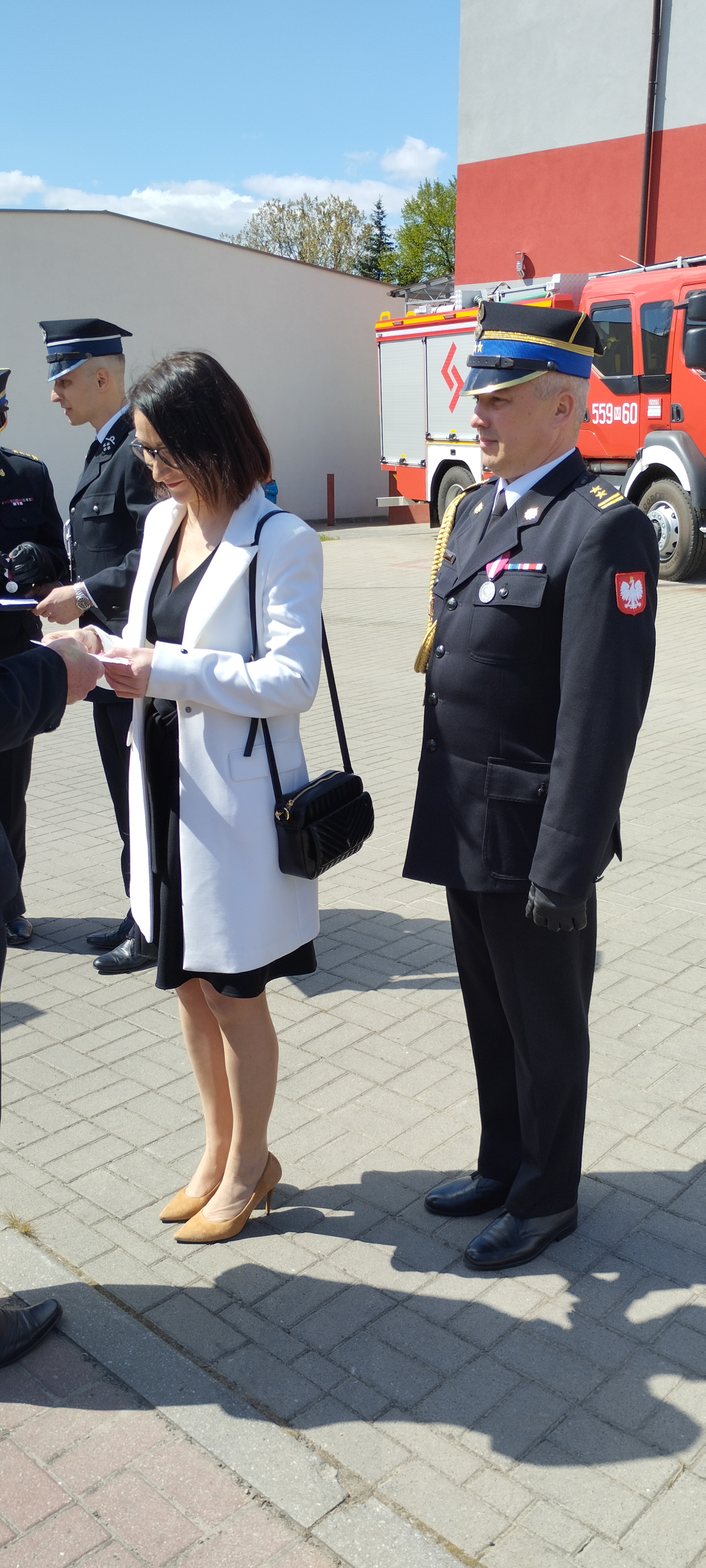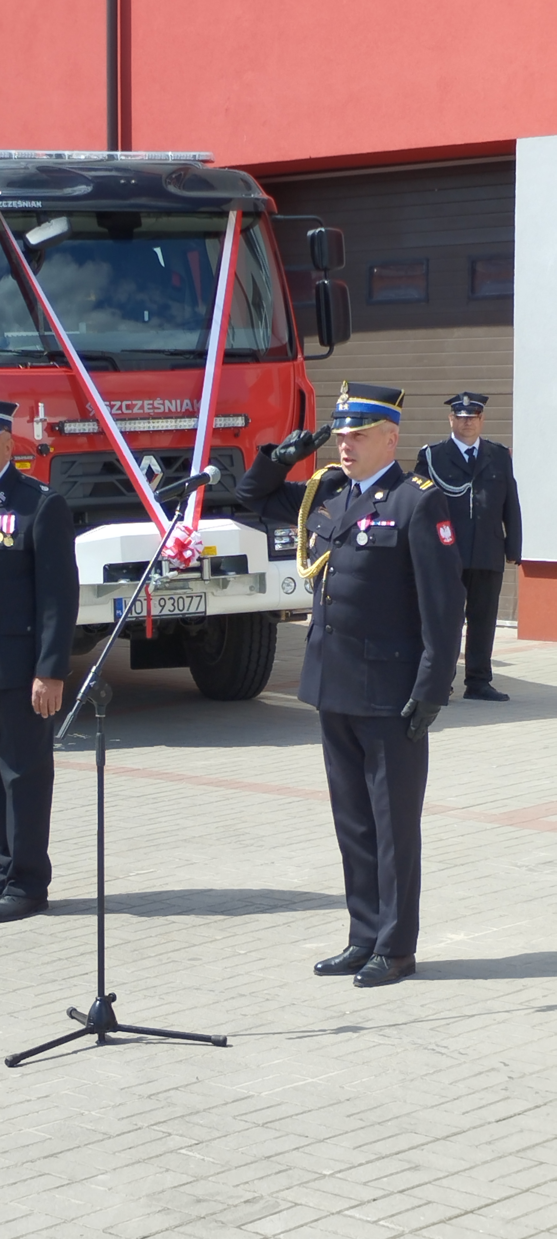 Uroczystość rozpoczęła się złożeniem meldunku Komendantowi Powiatowemu PSP bryg. Michałowi Gigoła, następnie odegrano hymn państwowy.