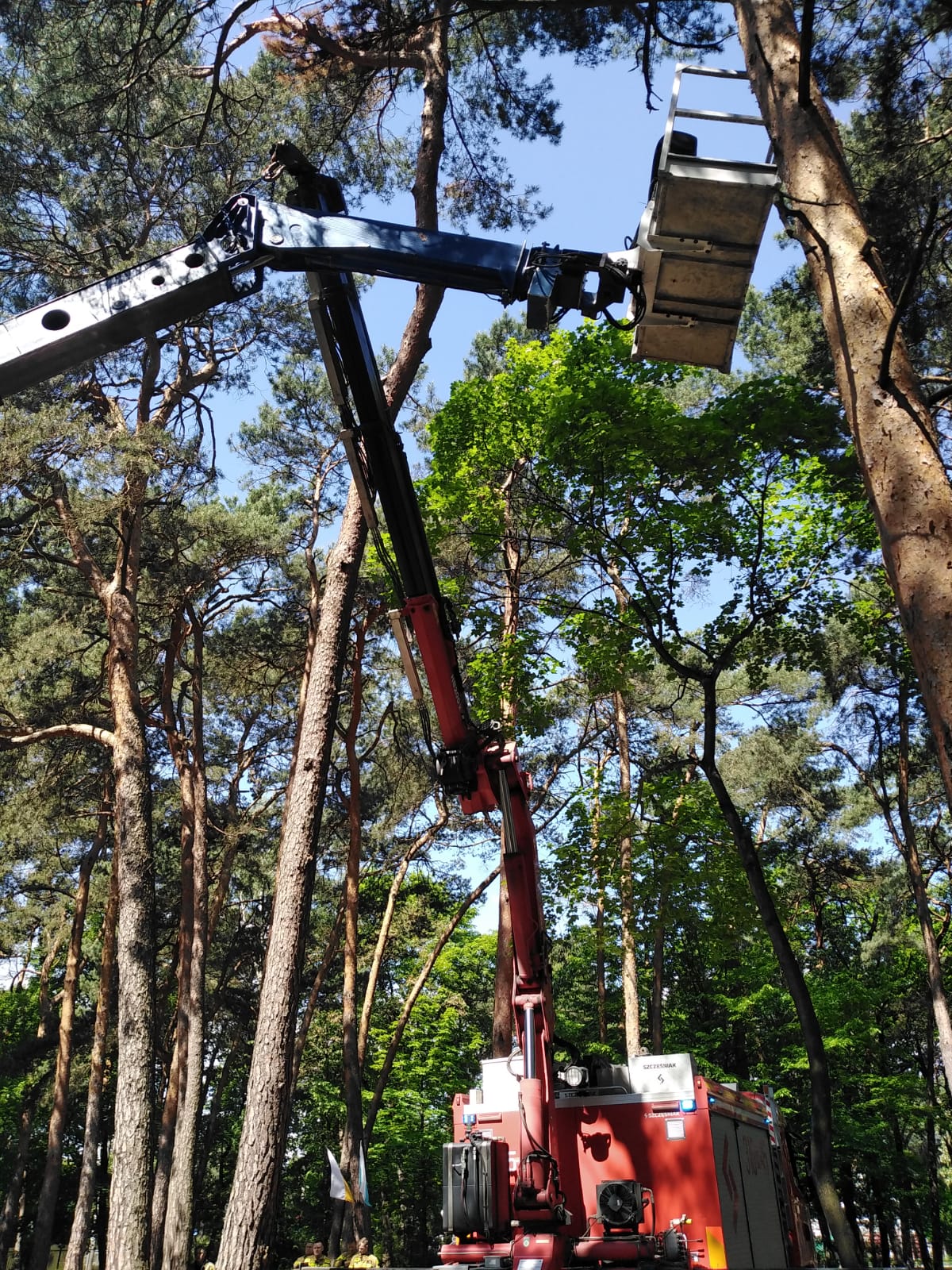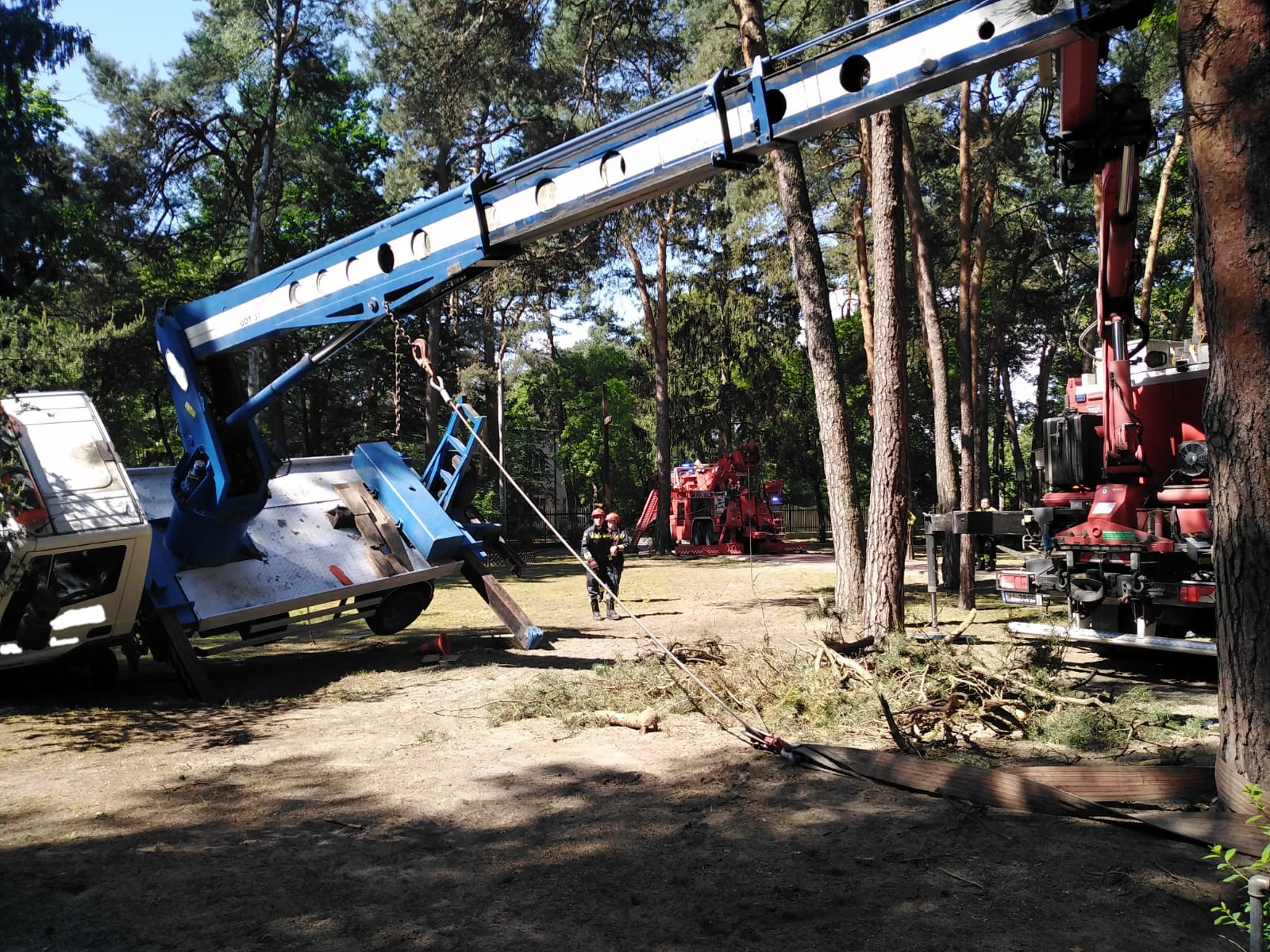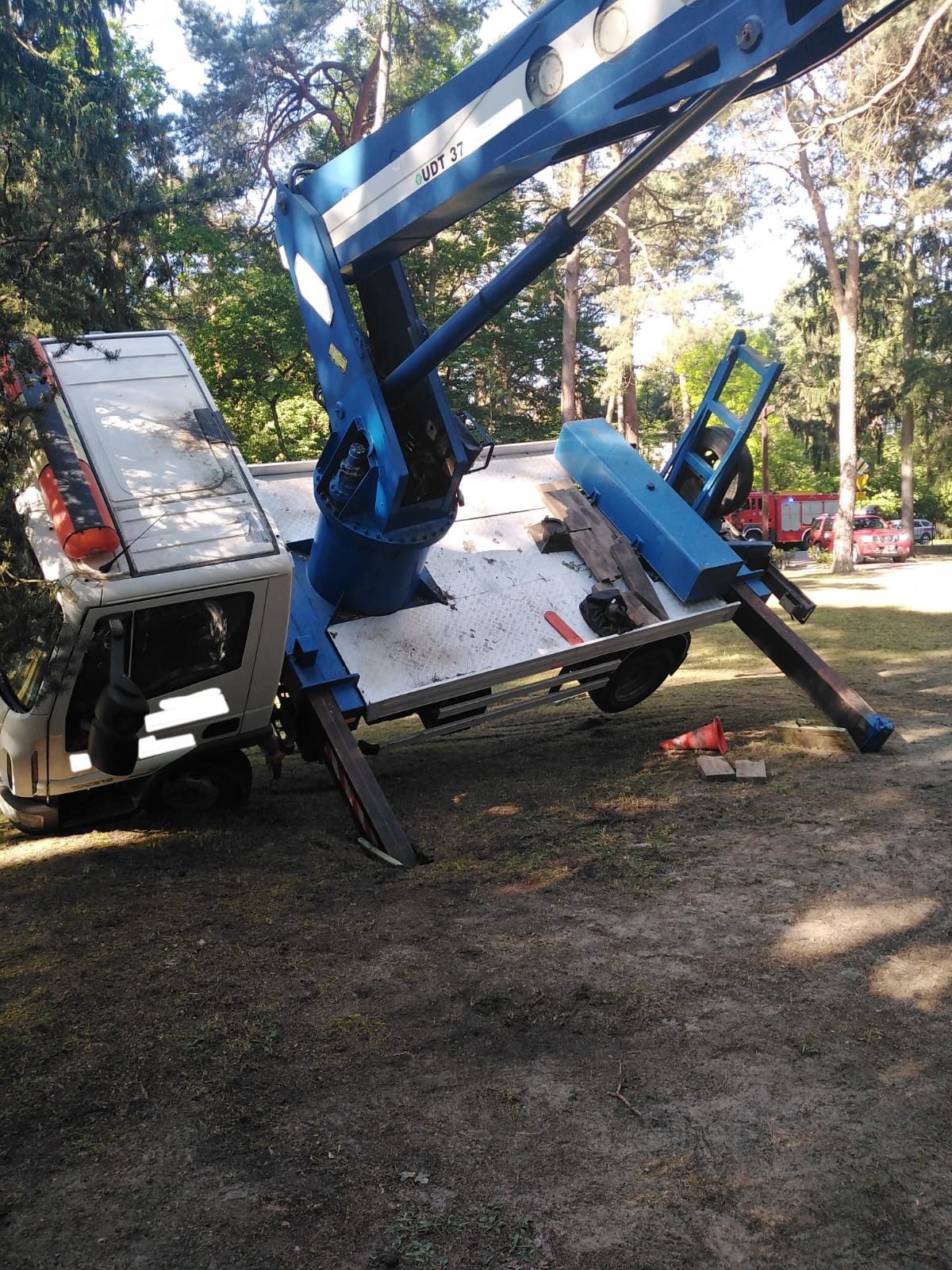 Podnośnik koszowy oparty był lewą stroną o podłoże, prawe koła pojazdu uniesione były w górze. Swym ramieniem zapierał się o sosnę. W wyniku zdarzenia nikt nie odniósł obrażeń.