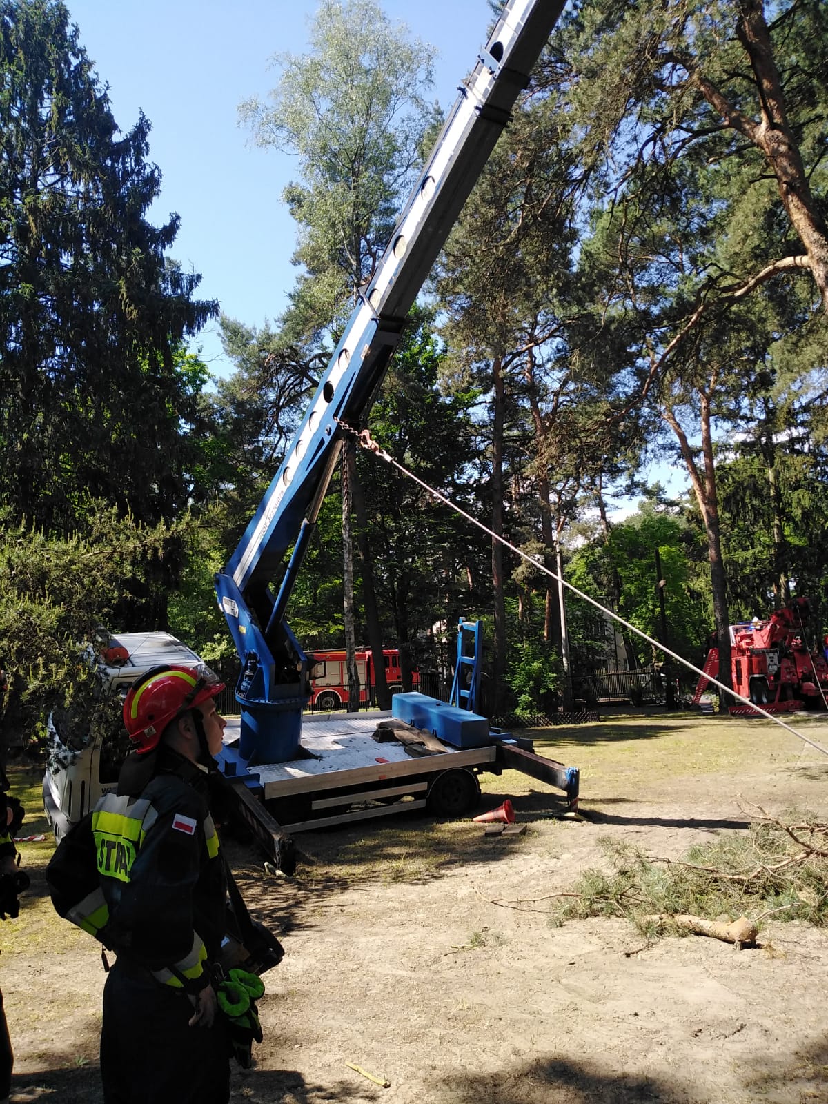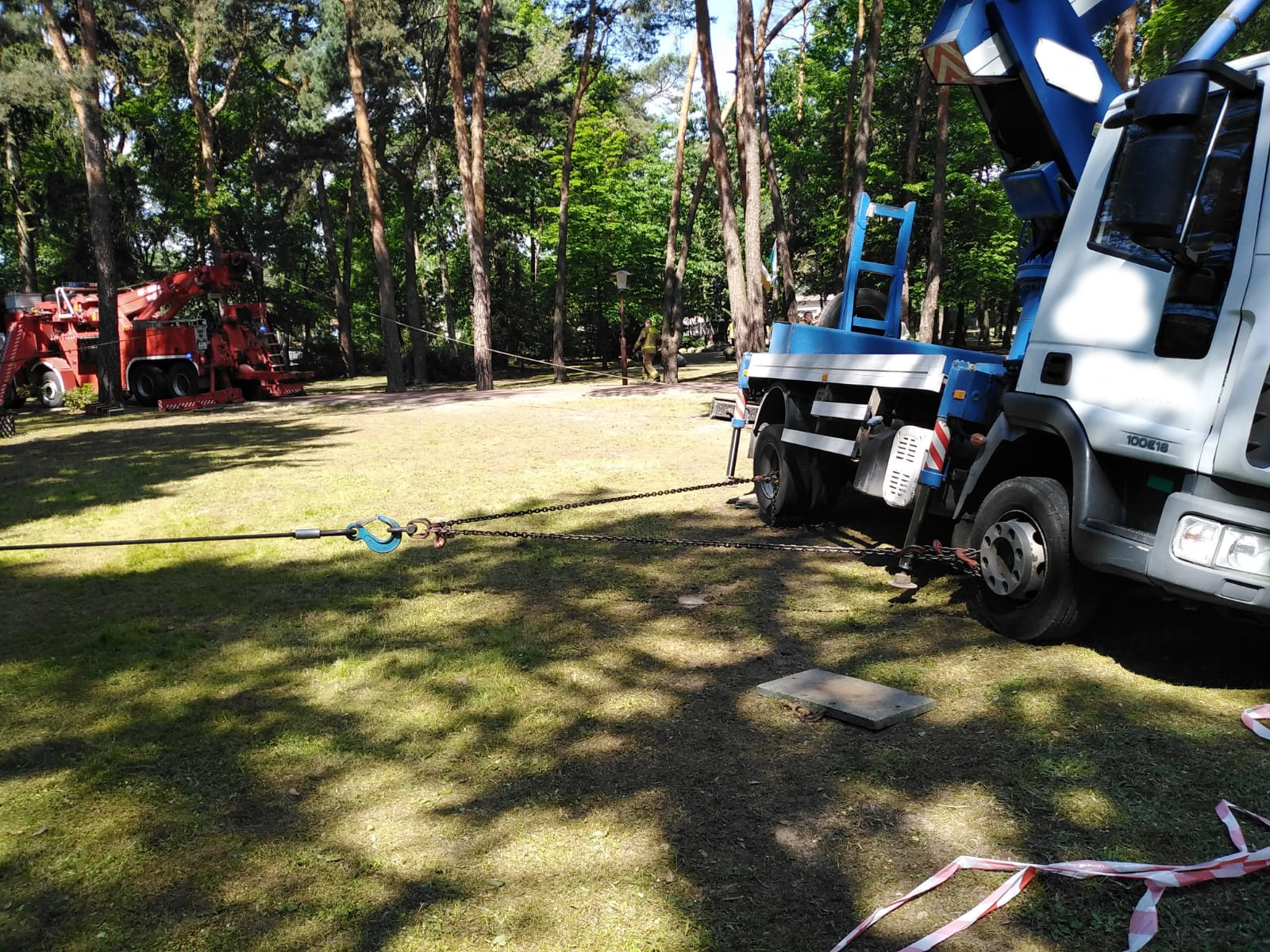 Po dojeździe Grupy Specjalistycznej przystąpiono do sprawiania układu złożonego z lin stalowych, zbloczy oraz zawiesi pasowych w celu bezpiecznego postawienia podnośnika na kołach. Cała akcja zakończona została pełnym sukcesem a pojazd bez żadnych strat odjechał z miejsca zdarzenia na własnych kołach.