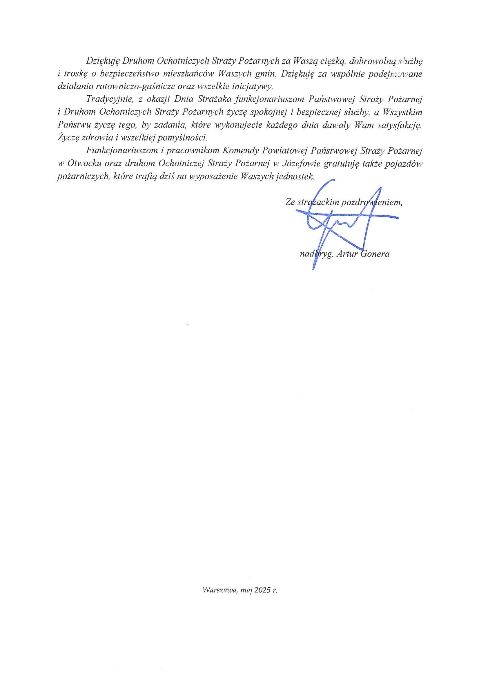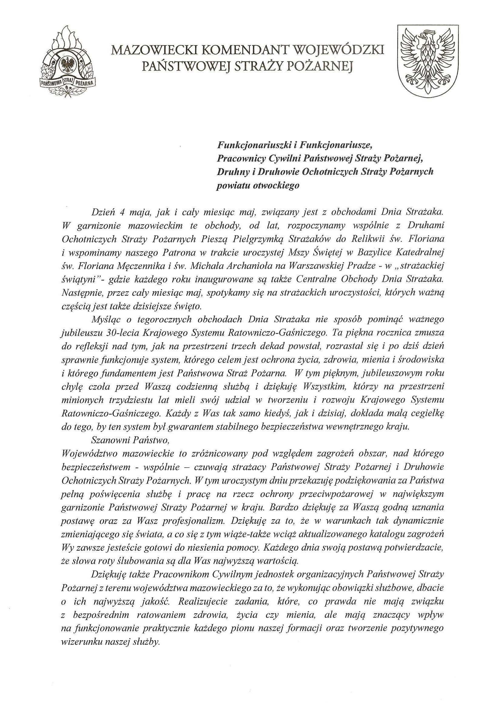 W swoim przemówieniu podziękował wszystkim strażakom za codzienną służbę, a obecnym samorządowcom za nieocenioną pomoc w budowaniu potencjału Krajowego Systemu Ratowniczo-Gaśniczego na terenie powiatu otwockiego.