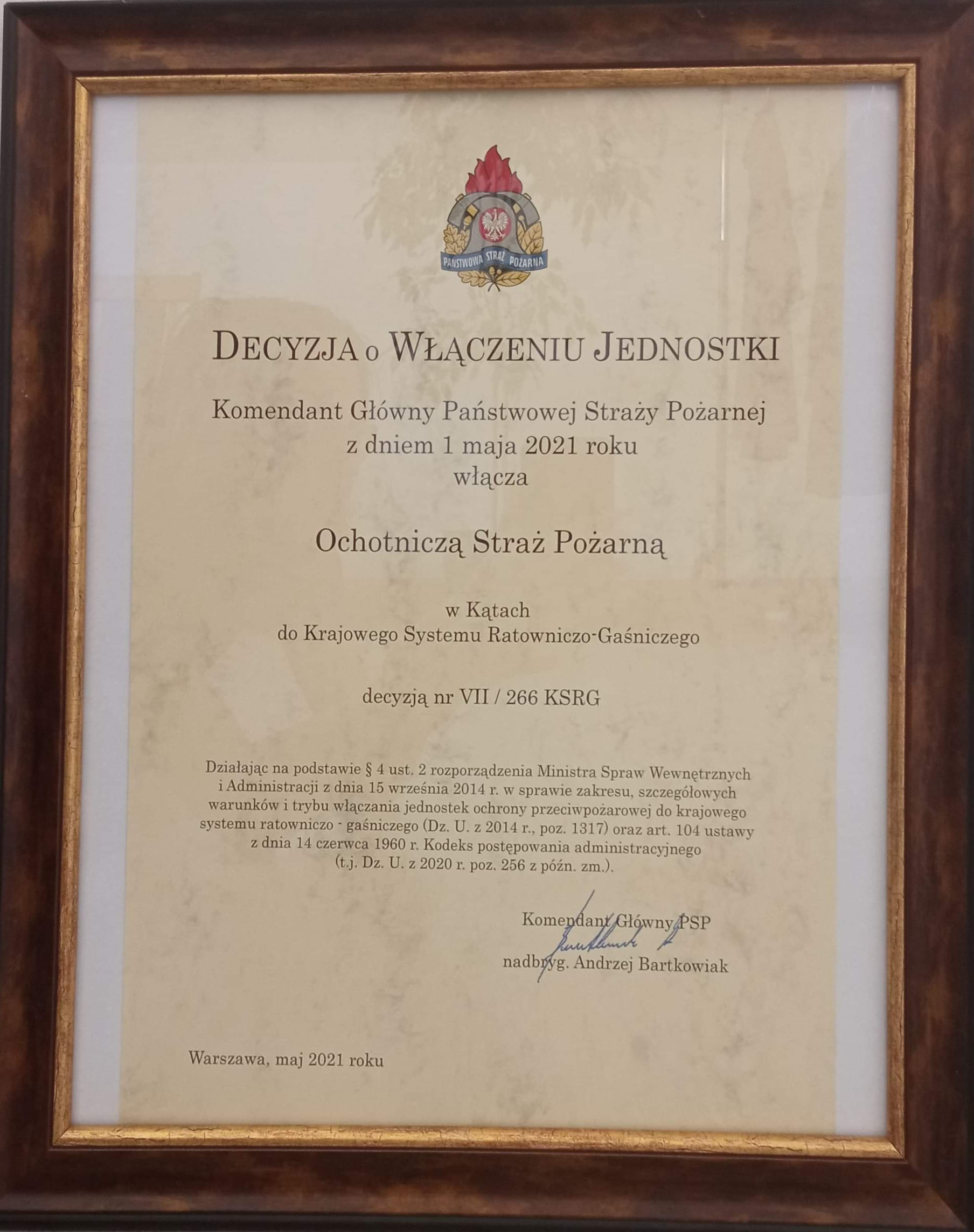 12 maja 2021 roku w Komendzie Wojewódzkiej PSP w Warszawie miała miejsce uroczysta zbiórka, podczas której wręczono promesy na zakup nowych samochodów ratowniczo-gaśniczych oraz akty włączenia do krajowego systemu ratowniczo-gaśniczego dla jednostek ochotniczych straży pożarnych z terenu województwa mazowieckiego.
