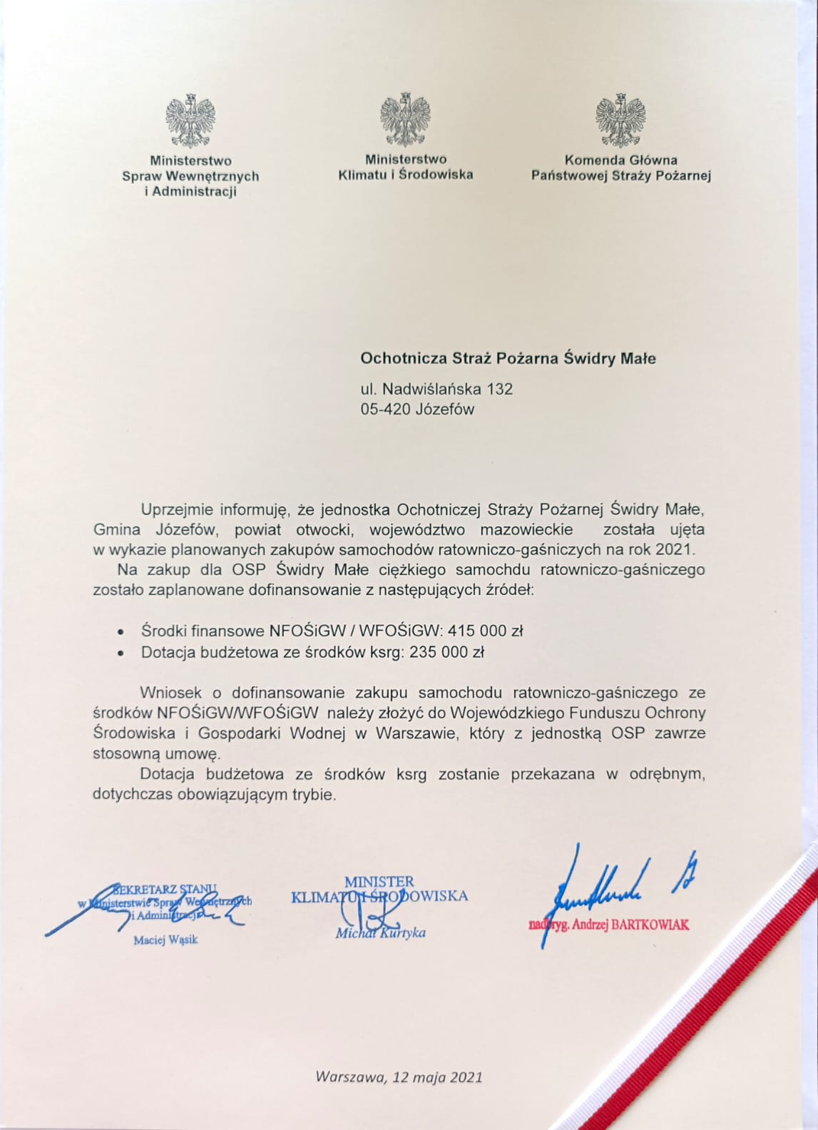 W projekt dofinansowania zakupu samochodów ratowniczych dla jednostek ochotniczych straży pożarnych osobiście zaangażowali się pan Mariusz Kamiński minister spraw wewnętrznych i administracji, pan Maciej Wąsik wiceminister spraw wewnętrznych i administracji, nadbryg. Andrzej Bartkowiak komendant główny PSP oraz nadbryg. Jarosław Nowosielski mazowiecki komendant wojewódzki PSP.