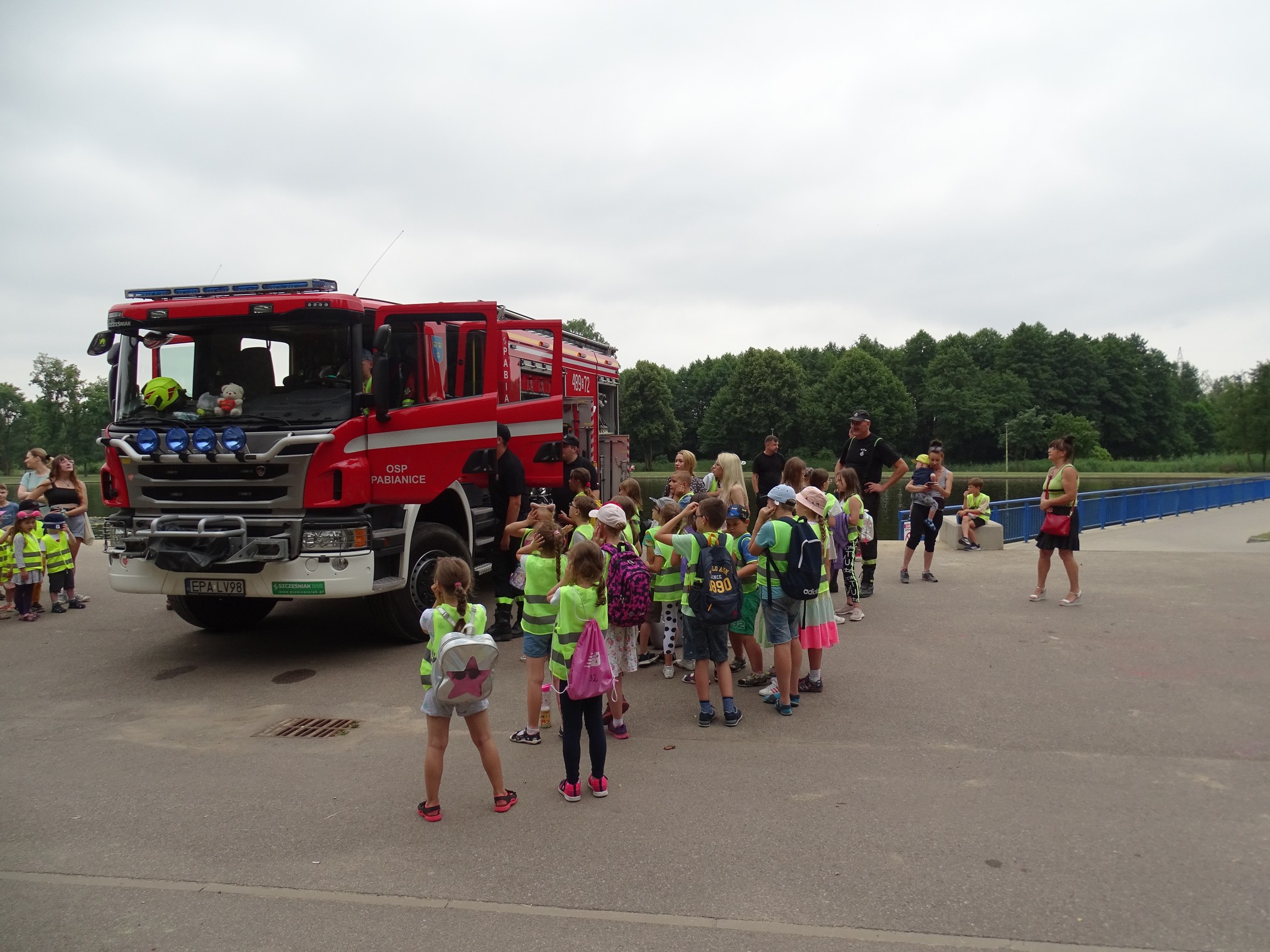 Strażacy PSP wspólnie ze strażakami OSP Pabianice zaprezentowali pokaz ratownictwa wodnego a także uczyli udzielania pierwszej pomocy, właściwego zachowania podczas wypoczynku nad wodą i w lesie oraz przypominali zasady właściwego powiadamiania służb