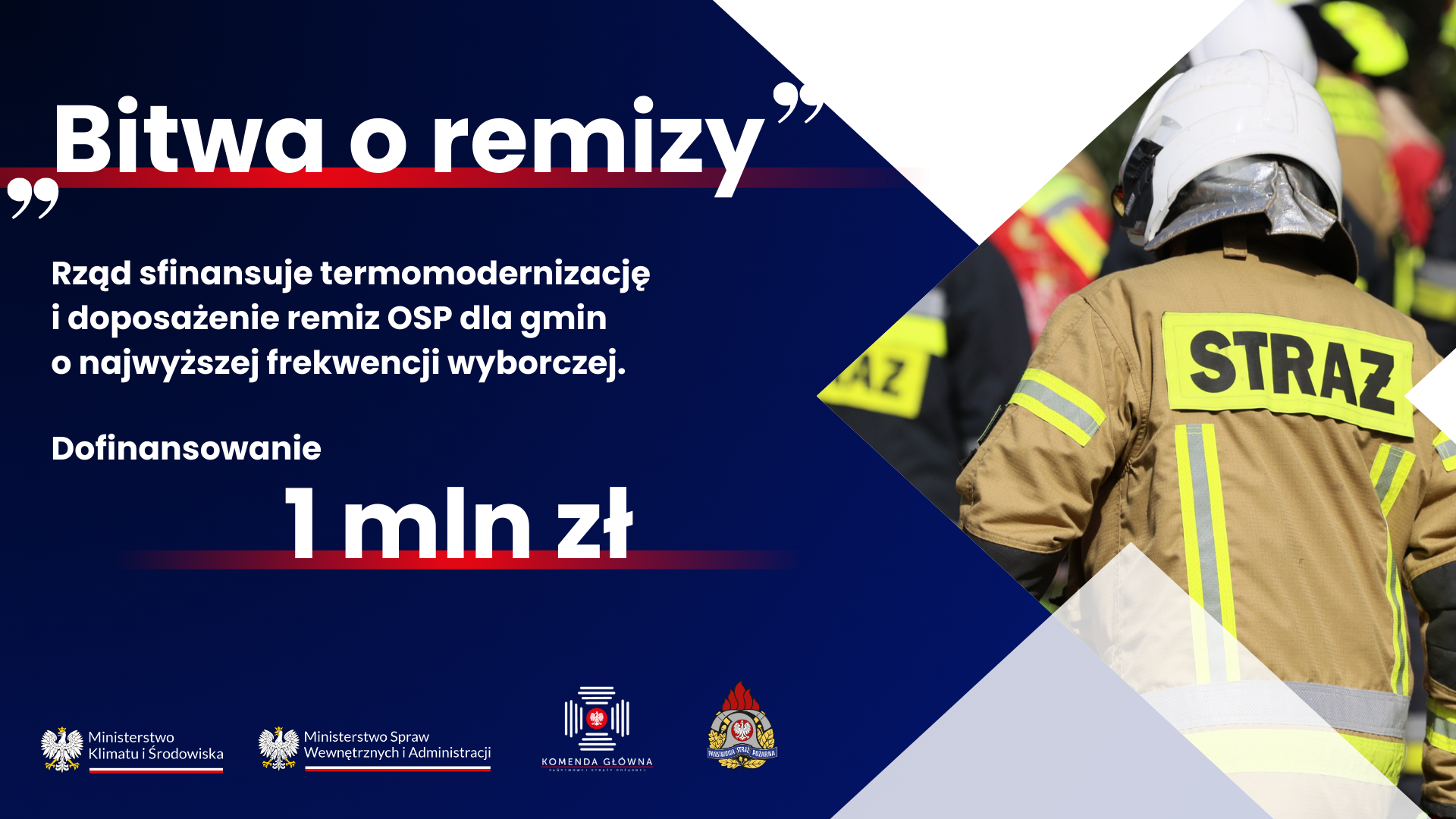 W każdym powiecie (z wyłączeniem miast na prawach powiatu) gmina do 20 tys. mieszkańców z największą frekwencją w wyborach do Sejmu i Senatu otrzyma do 1 miliona złotych dotacji na termomodernizację, remont i wyposażenie remizy strażackiej. To profrekwencyjna inicjatywa Ministerstwa Klimatu i Środowiska i Ministerstwa Spraw Wewnętrznych i Administracji. Poinformowali o niej na konferencji prasowej 27 września 2023 r. minister klimatu i środowiska Anna Moskwa i komendant główny Państwowej Straży Pożarnej gen. brygadier. Andrzej Bartkowiak.