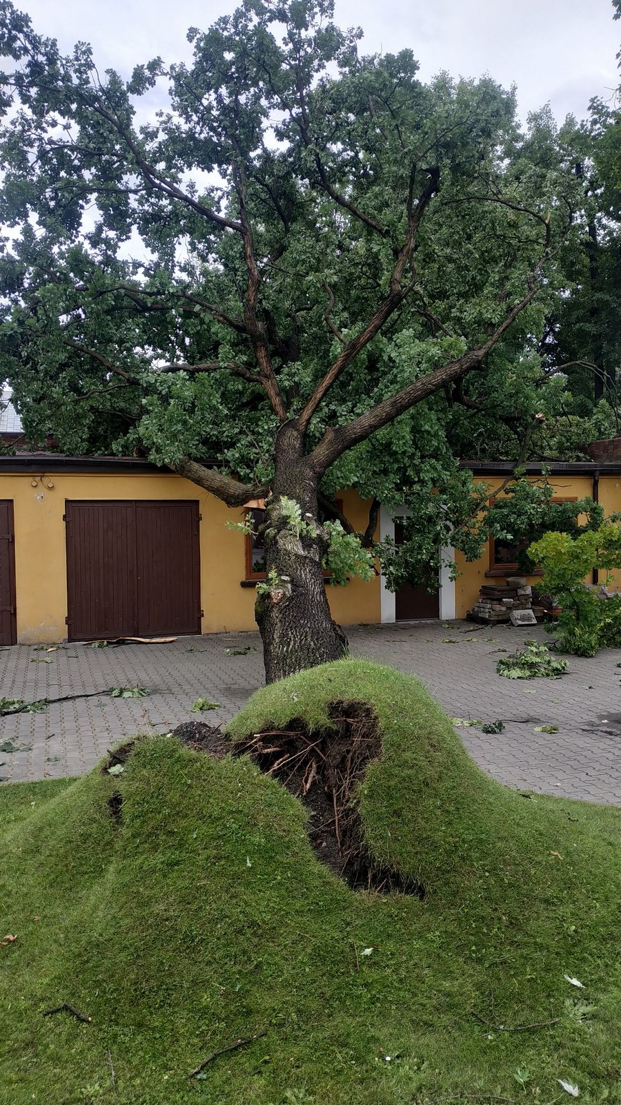 Silny wiatr nie oszczędził drzew znajdujących się na placu wewnętrznym Komendy, jedno z wywróconych drzew oparło się o dach budynku nie powodujących przy tym znacznych strat.