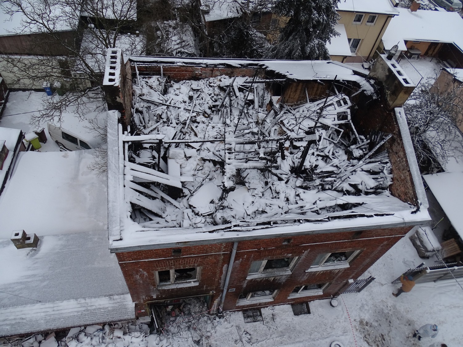 Pożar prawdopodobnie rozpoczął się w piwnicy, gdzie zlokalizowany był piec typu "koza". Następnie po częściowo drewnianej klatce schodowej przedostał się na poddasze i zajął drewnianą konstrukcję dachu, który uległ całkowitemu spaleniu.
