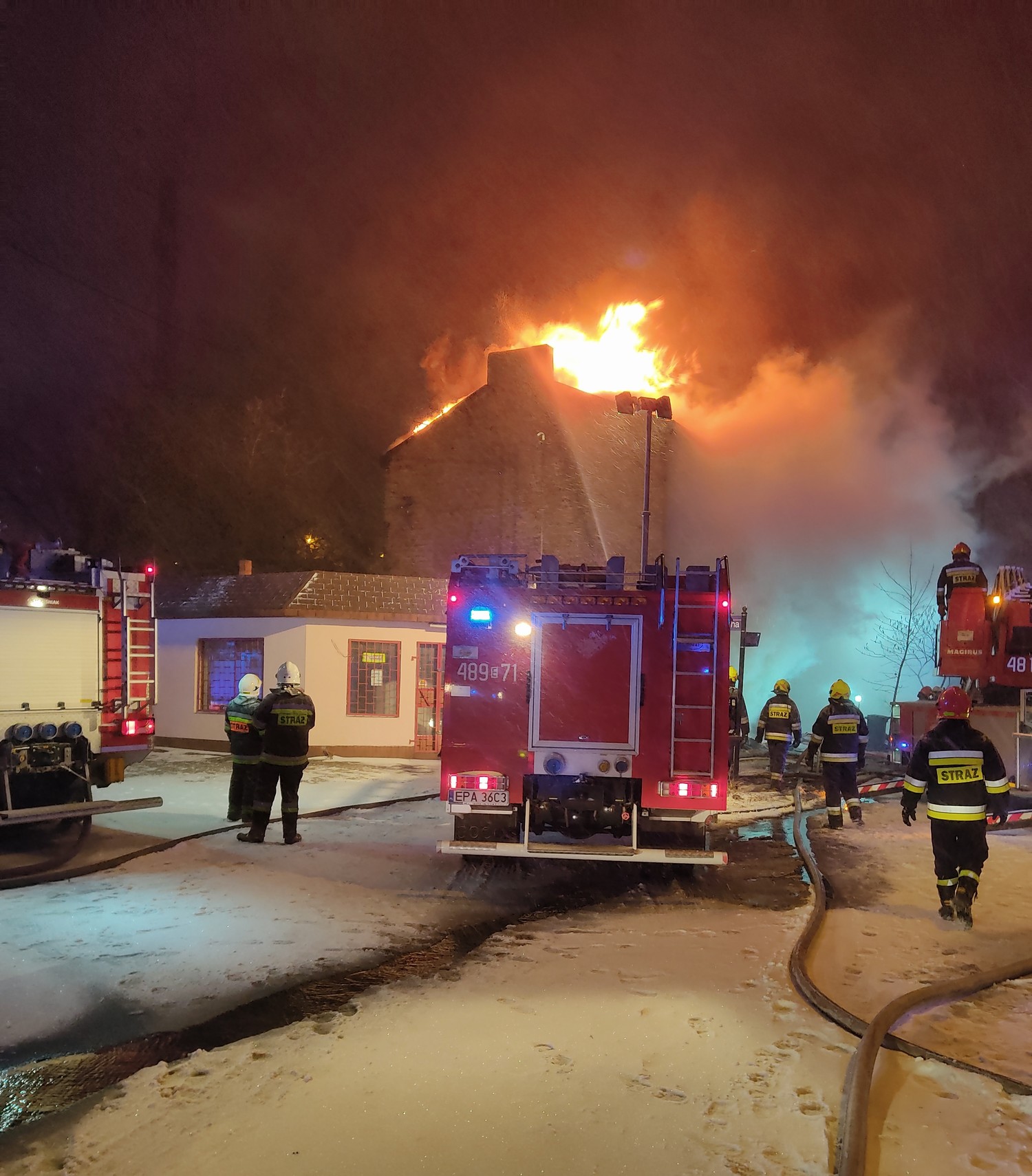 Działania na miejscu zdarzenia trwały ponad 7 godzin. Wynikało to z bardzo trudnych warunków pogodowych, wiatr i mróz w połączeniu z drobnymi kropelkami wody używanej do stłumienia ognia powodowały zamarzanie aparatów ochrony układu oddechowego, radiostacji, mundurów oraz rozrywanie stojaków hydrantowych. Ze względu na olbrzymie ilości nagromadzonych materiałów łatwopalnych w budynku strażacy mogli wejść do niego dopiero po kilku godzinach prowadzenia działań.