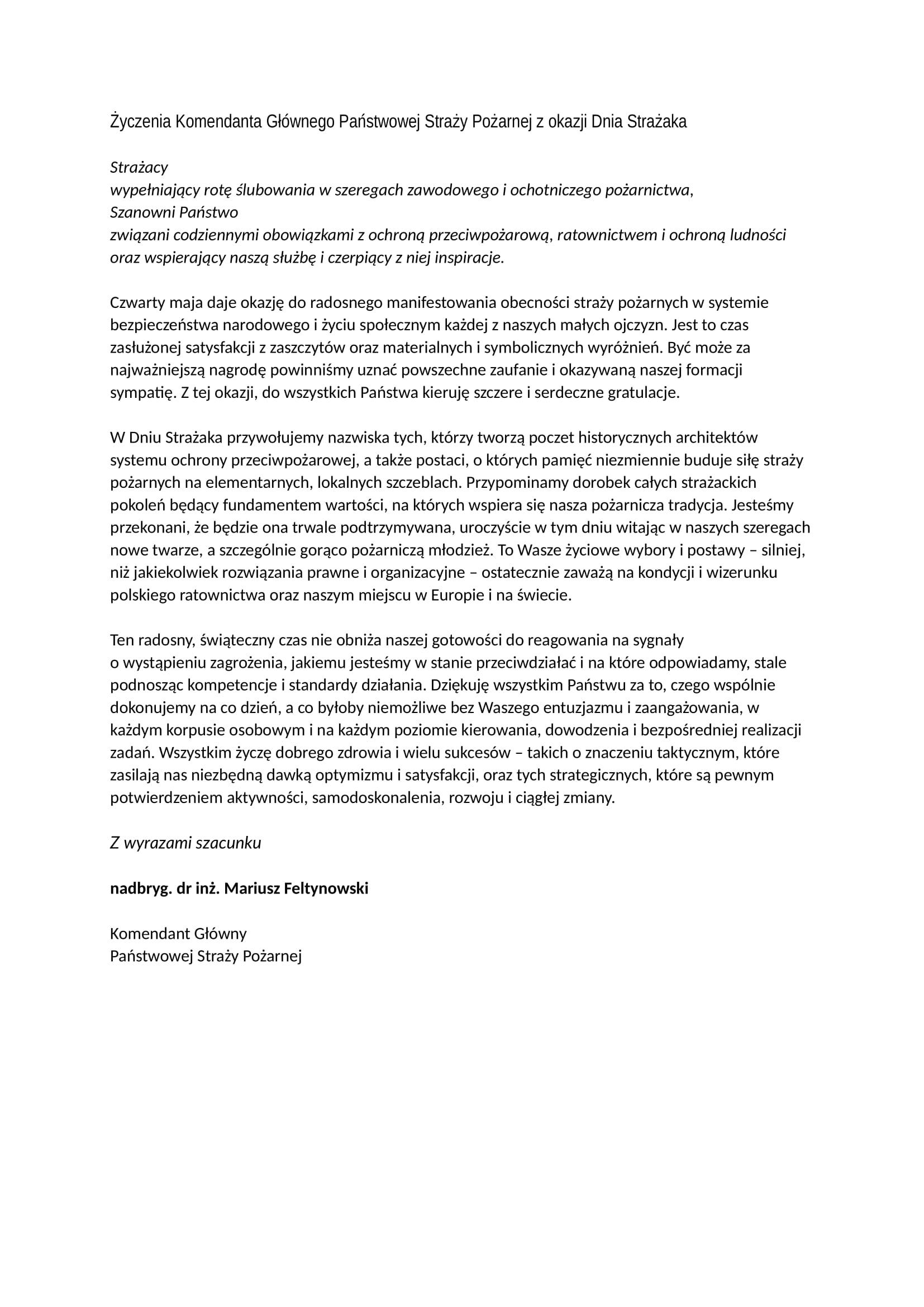 W Dniu Strażaka przywołujemy nazwiska tych, którzy tworzą poczet historycznych architektów systemu ochrony przeciwpożarowej, a także postaci, o których pamięć niezmiennie buduje siłę straży pożarnych na elementarnych, lokalnych szczeblach. Przypominamy dorobek całych strażackich pokoleń będący fundamentem wartości, na których wspiera się nasza pożarnicza tradycja. Jesteśmy przekonani, że będzie ona trwale podtrzymywana, uroczyście w tym dniu witając w naszych szeregach nowe twarze, a szczególnie gorąco pożarniczą młodzież. To Wasze życiowe wybory i postawy – silniej, niż jakiekolwiek rozwiązania prawne i organizacyjne – ostatecznie zaważą na kondycji i wizerunku polskiego ratownictwa oraz naszym miejscu w Europie i na świecie.