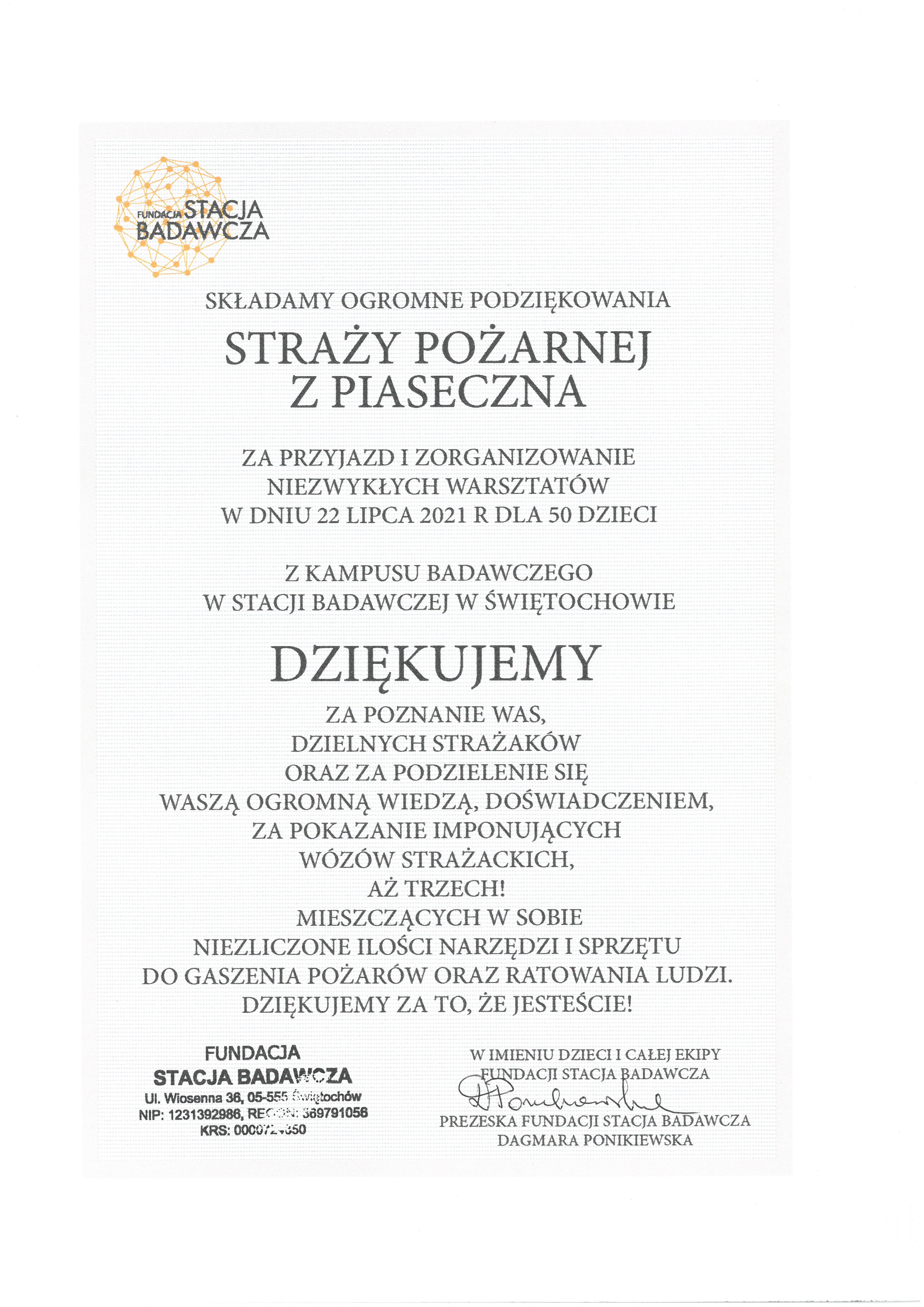 W lipcu 2021r. funkcjonariusze KP PSP w Piasecznie wraz z druhami z Ochotniczych Straży Pożarnych uczestniczyli w cyklu spotkań z dziećmi i młodzieżą, które dotyczyły bezpiecznego wypoczynku w okresie letnim. Tematyka spotkań obejmowała m. in. bezpieczeństwo podczas wypoczynku nad wodą, zasady postępowania podczas zauważenia zagrożenia, a także podstawowe zasady udzielania pierwszej pomocy. Uczestnicy spotkań mieli także okazję zapoznania się ze sprzętem, który znajduje się na wyposażeniu straży pożarnej.