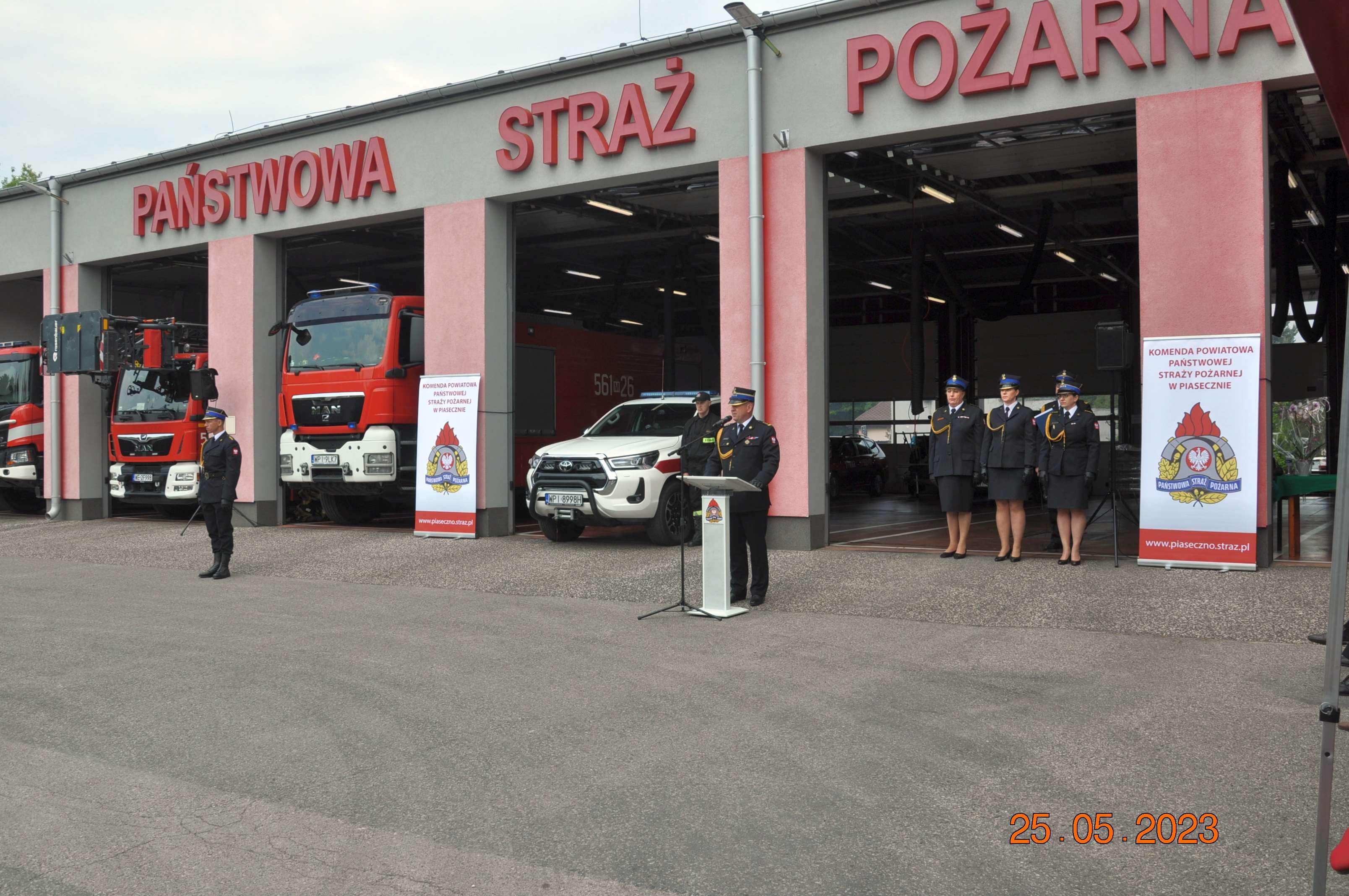 W dniu 25 maja 2023 r. w Komendzie Powiatowej Państwowej Straży Pożarnej w Piasecznie odbył się uroczysty apel z okazji Dnia Strażaka. Gości oraz funkcjonariuszy, pracowników i druhów Ochotniczych Straży Pożarnych zebranych na placu przed komendą powitał st. bryg. Leszek Szcześniak - Komendant Powiatowy Państwowej Straży Pożarnej w Piasecznie.