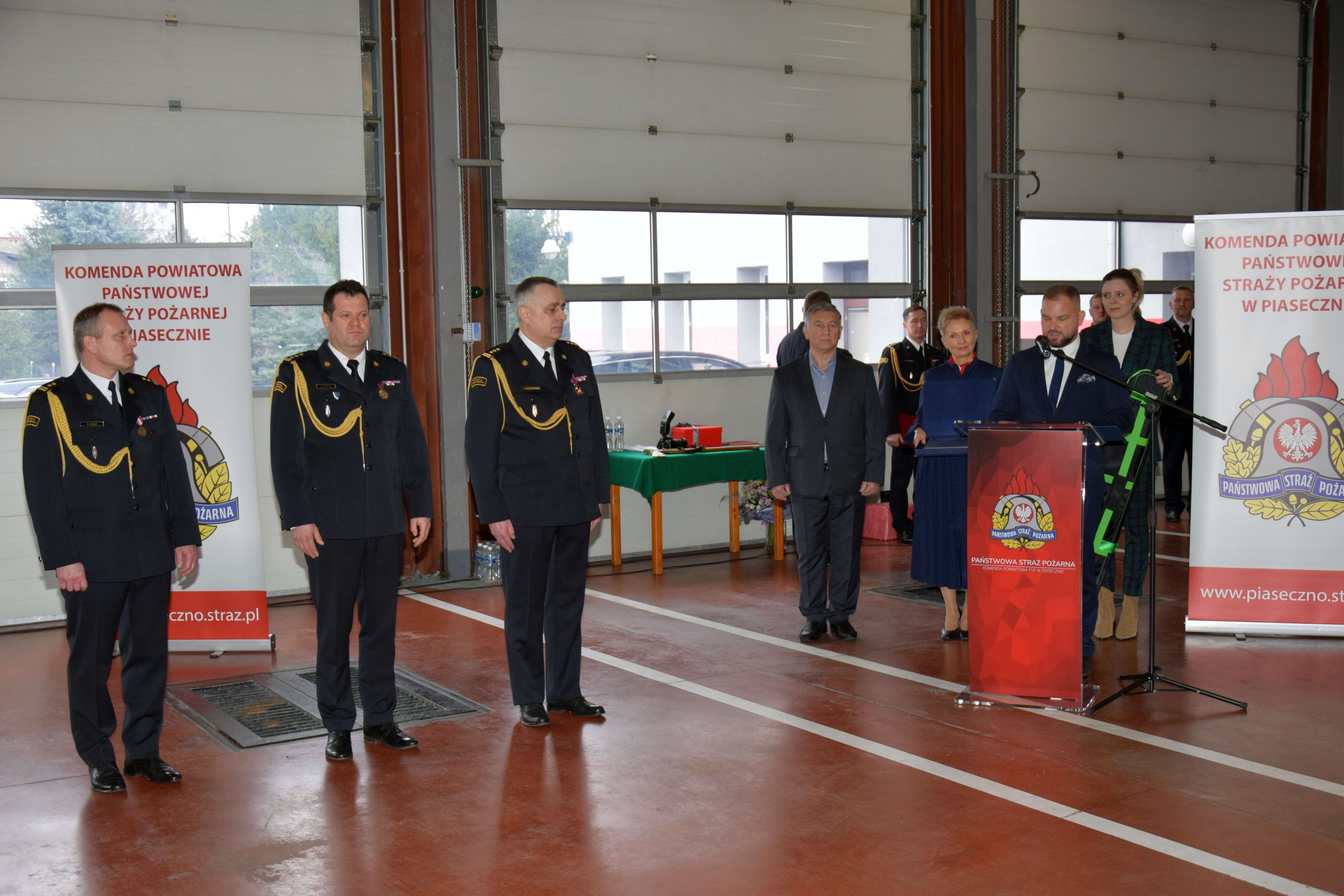 Zaproszonych gości powitał sam st. bryg. Szcześniak. Znaleźli się wśród nich obecni i byli komendanci wojewódzcy i powiatowi Państwowej Straży Pożarnej, obecni i byli funkcjonariusze Komendy Powiatowej PSP w Piasecznie, przedstawiciele władz samorządowych szczebla wojewódzkiego, powiatowego i gmin powiatu piaseczyńskiego, Komendant Powiatowy Policji, Nadleśniczy Nadleśnictwa Chojnów, przedstawiciele Zarządu Oddziału Powiatowego Związku OSP RP w Piasecznie, Kapelan Powiatowy Strażaków, przedstawiciele instytucji i organizacji bezpośrednio zaangażowani we współpracę z Komendą oraz przyjaciele i rodzina odchodzącego ze służby Komendanta.