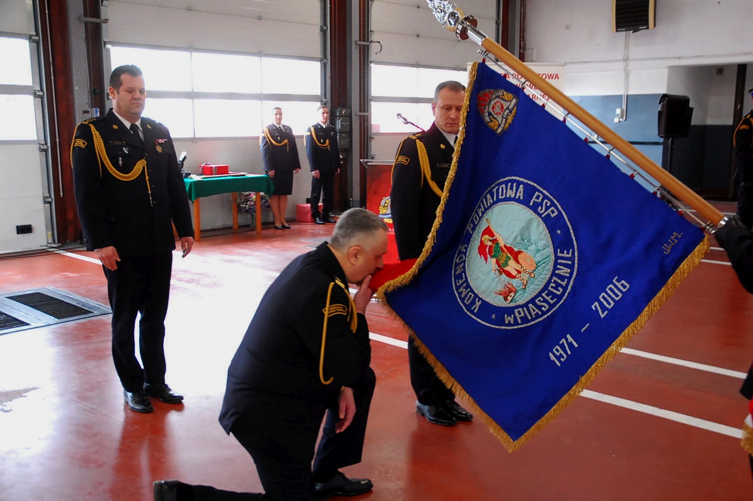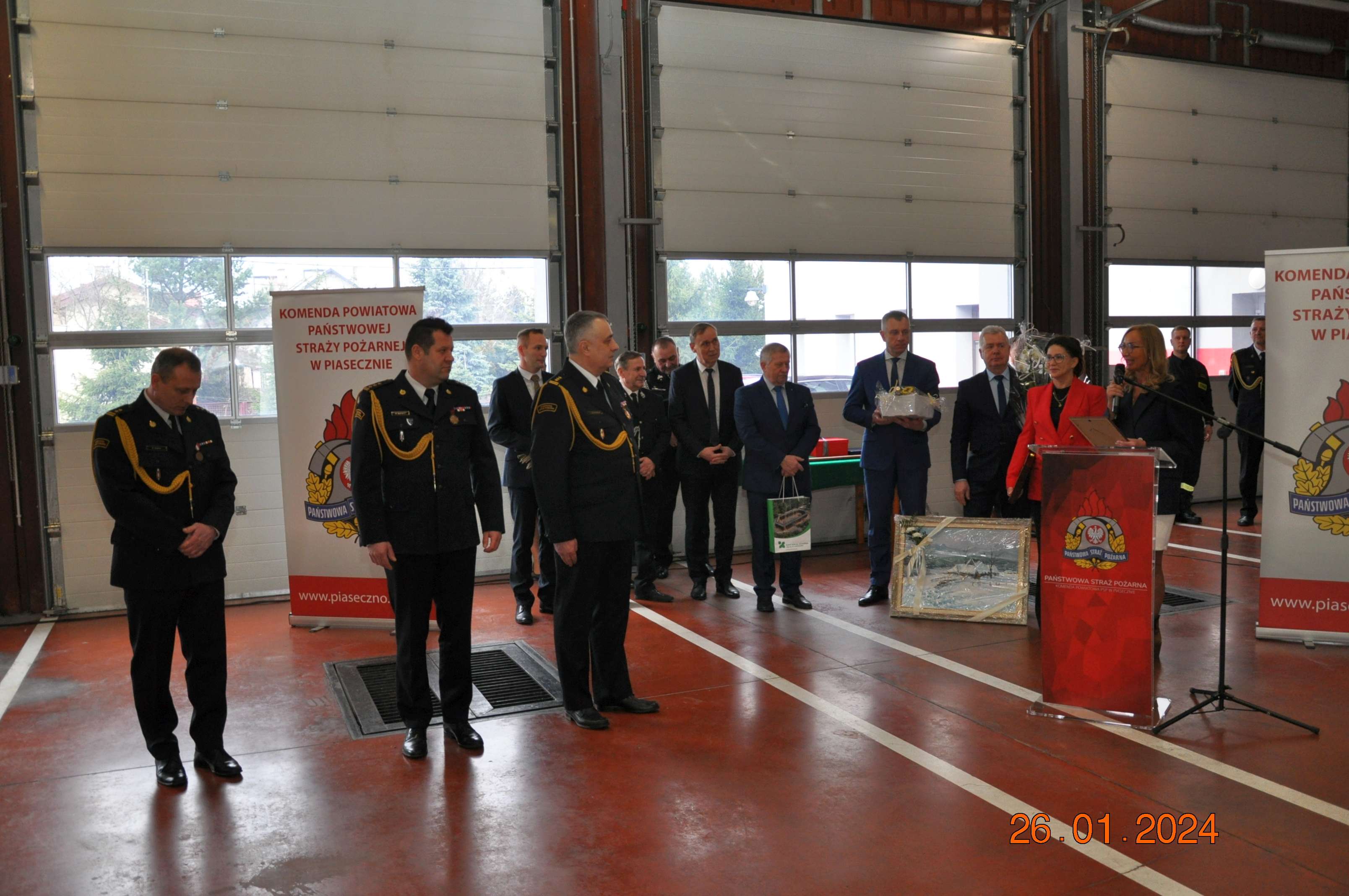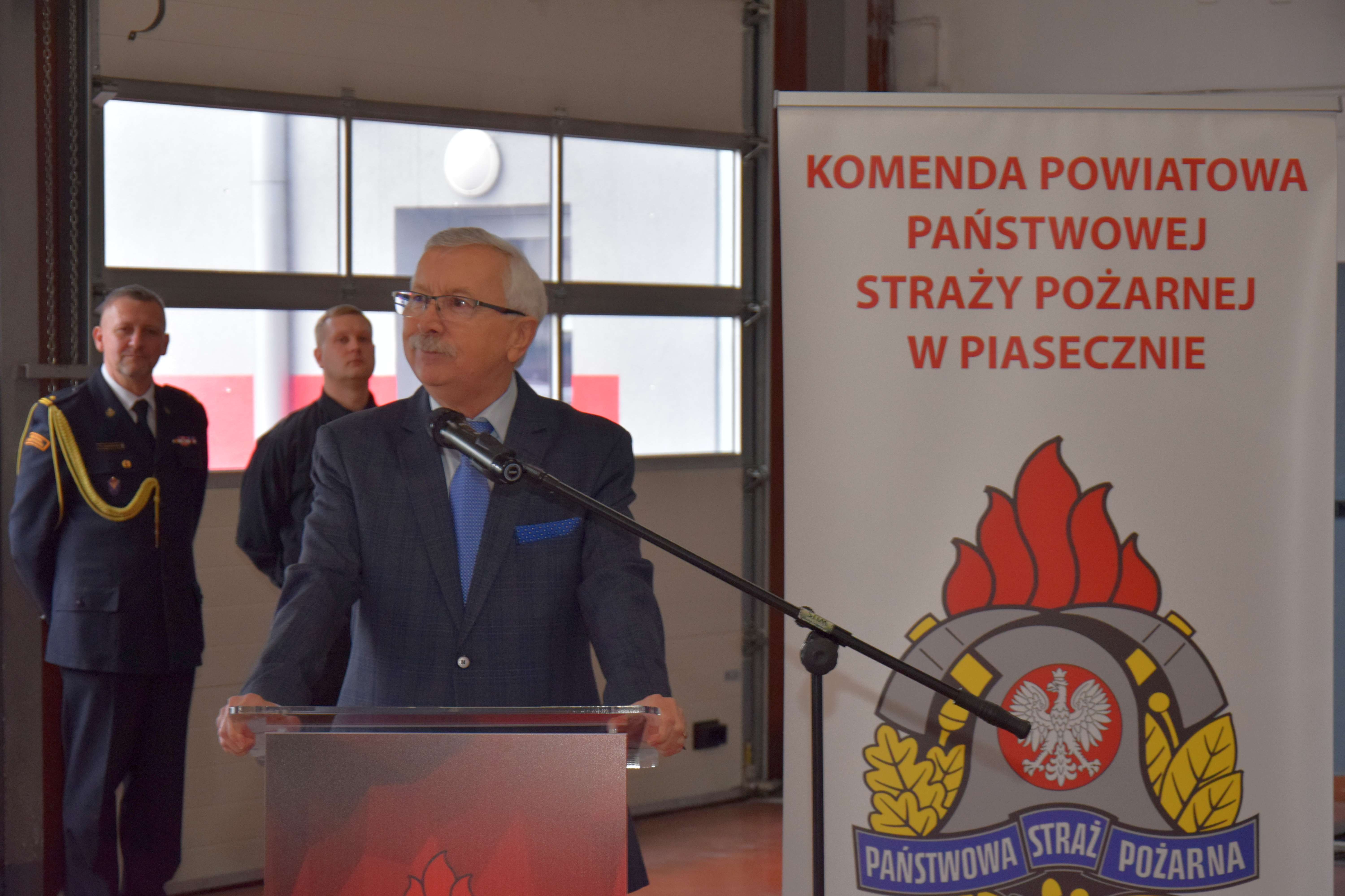 Uroczystość rozpoczęła się złożeniem przez dowódcę uroczystości meldunku, który przyjął p.o. Mazowiecki Komendant Wojewódzki PSP st. bryg. Artur Gonera. Następnie wprowadzony został sztandar Komendy Powiatowej PSP w Piasecznie oraz odegrano hymn państwowy.