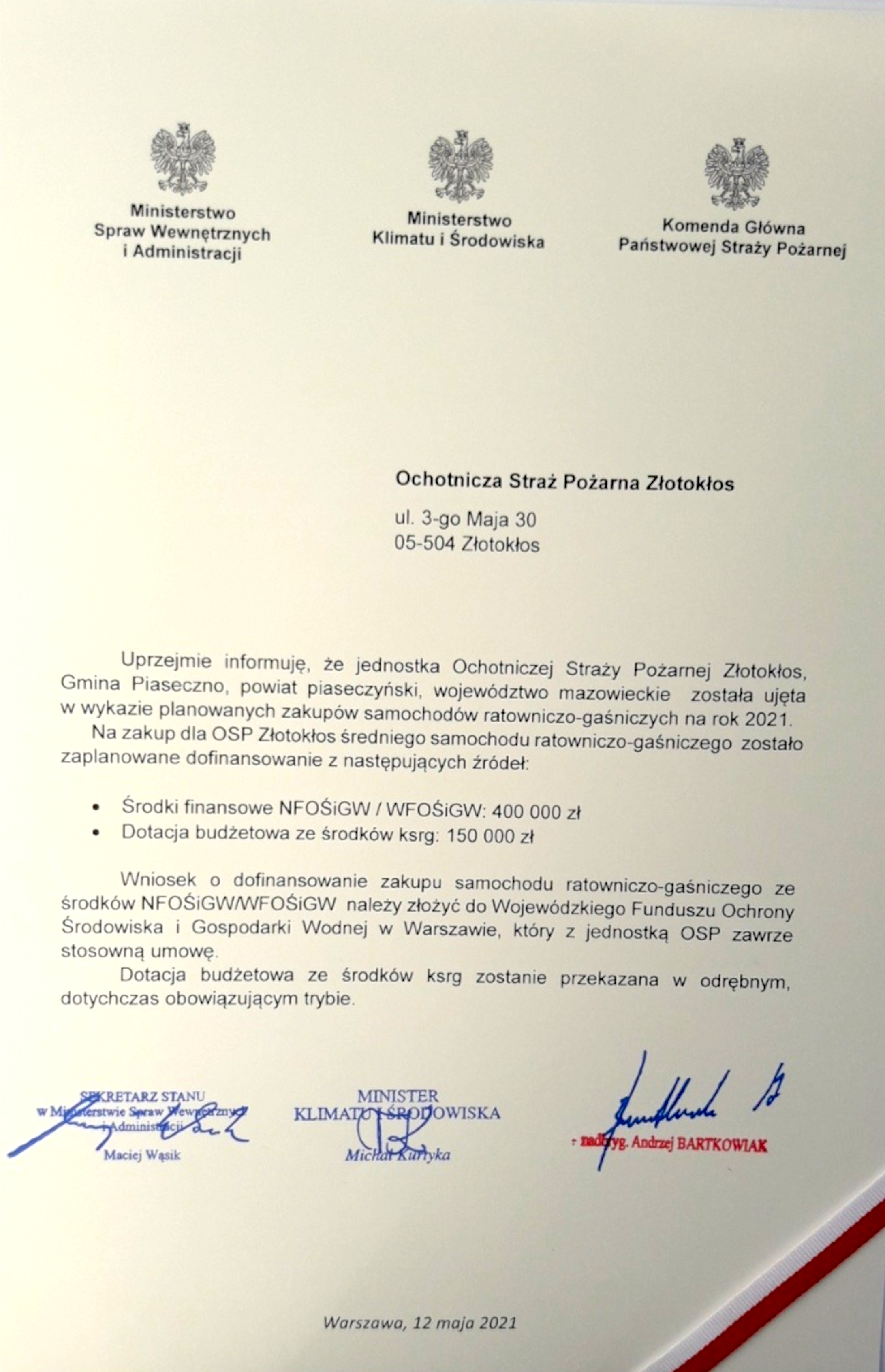 12 maja 2021 roku w Komendzie Wojewódzkiej Państwowej Straży pożarnej w Warszawie miała miejsce uroczysta zbiórka, podczas której wręczono promesy na zakup nowych samochodów ratowniczo-gaśniczych oraz akty włączenia do krajowego systemu ratowniczo-gaśniczego dla jednostek ochotniczych straży pożarnych z terenu województwa mazowieckiego.