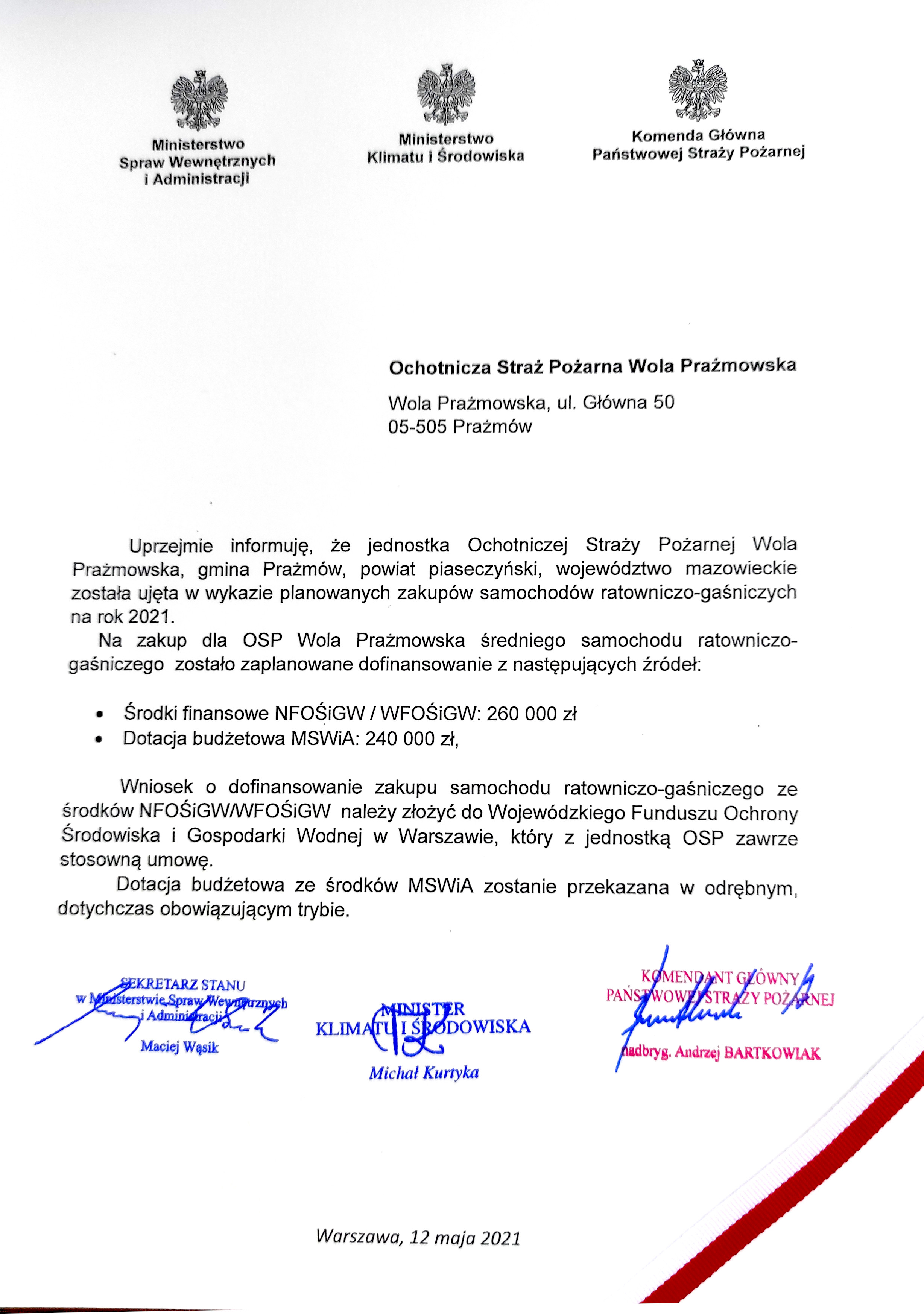 - Ochotnicza Straż Pożarna w Woli Prażmowskiej - dofinansowanie w łącznej kwocie 500 000,00zł