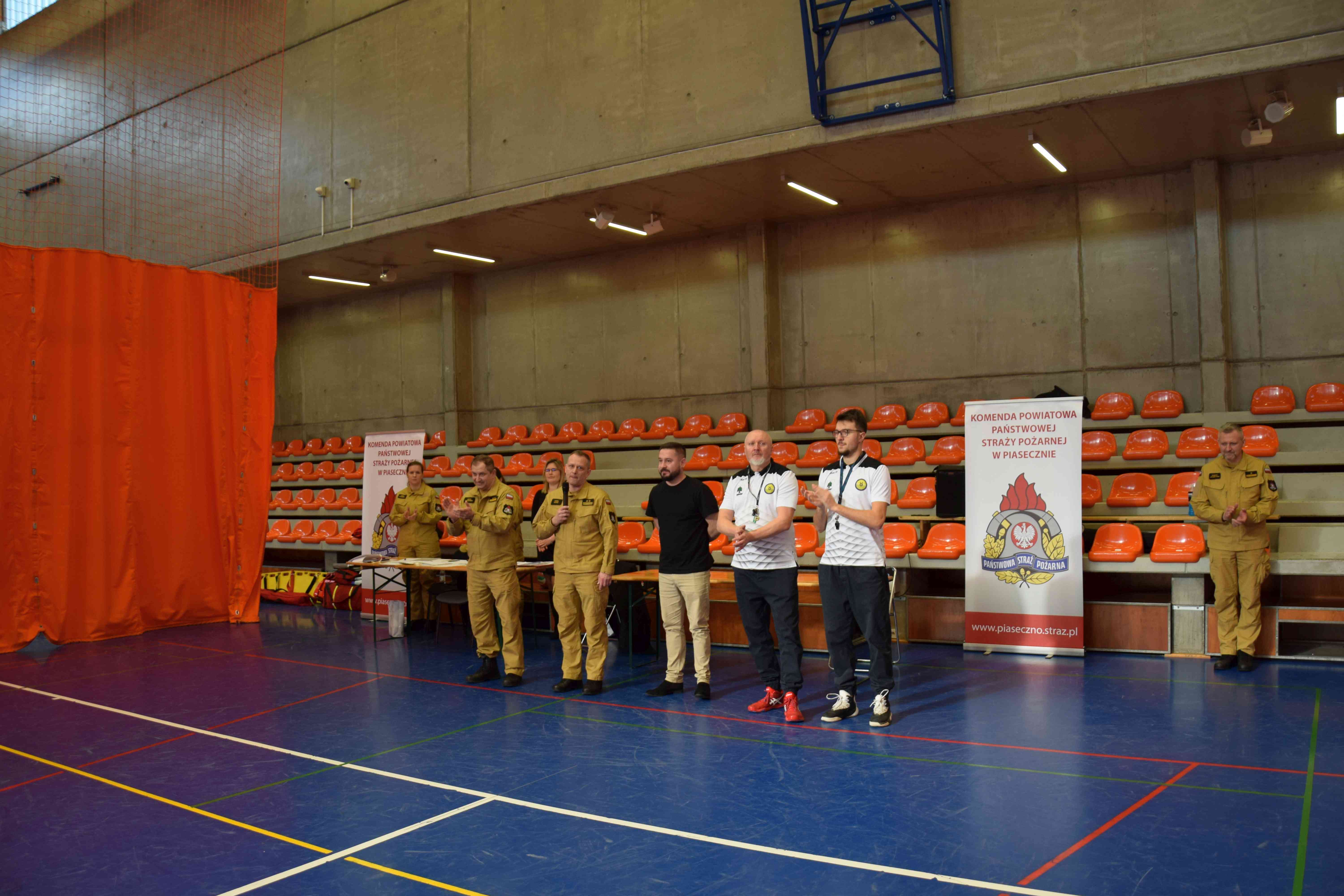 Wręczenia nagród indywidualnych oraz dla drużyn uczestniczących w XXII Mistrzostw Województwa Mazowieckiego Strażaków w Piłce Siatkowej dokonał p.o. Zastępca Mazowieckiego Komendnata Wojewódzkiego PSP st. bryg. Piotr Gąska, p.o. Komendanta Powiatowego PSP w Piasecznie bryg. Karol Kuras oraz sędzia zawodów Tymoteusz Kapitan.