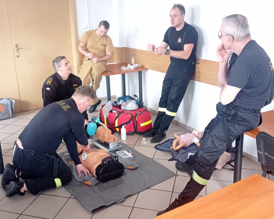 • Postępowanie w stanach nagłych nieurazowych (zawał serca, udar mózgu, cukrzyca, padaczka) . Następnie w trakcie symulacji scenek medycznych , strażacy doskonalili umiejętności na fantomach szkoleniowych.