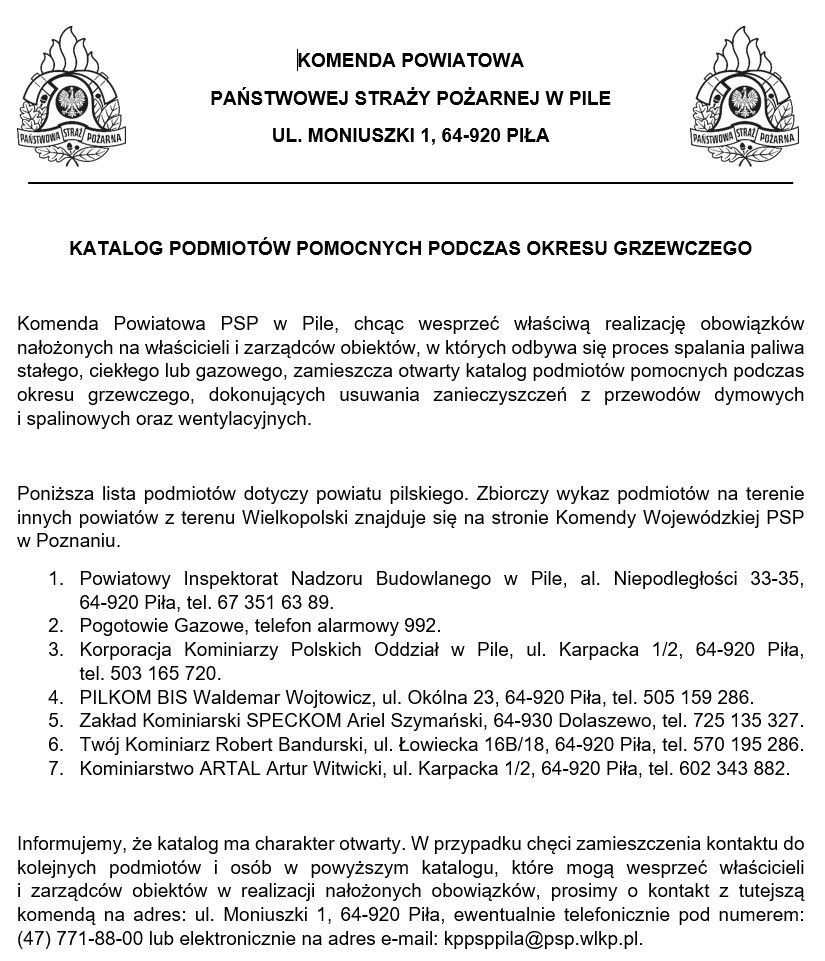 KATALOG PODMIOTÓW POMOCNYCH PODCZAS OKRESU GRZEWCZEGO