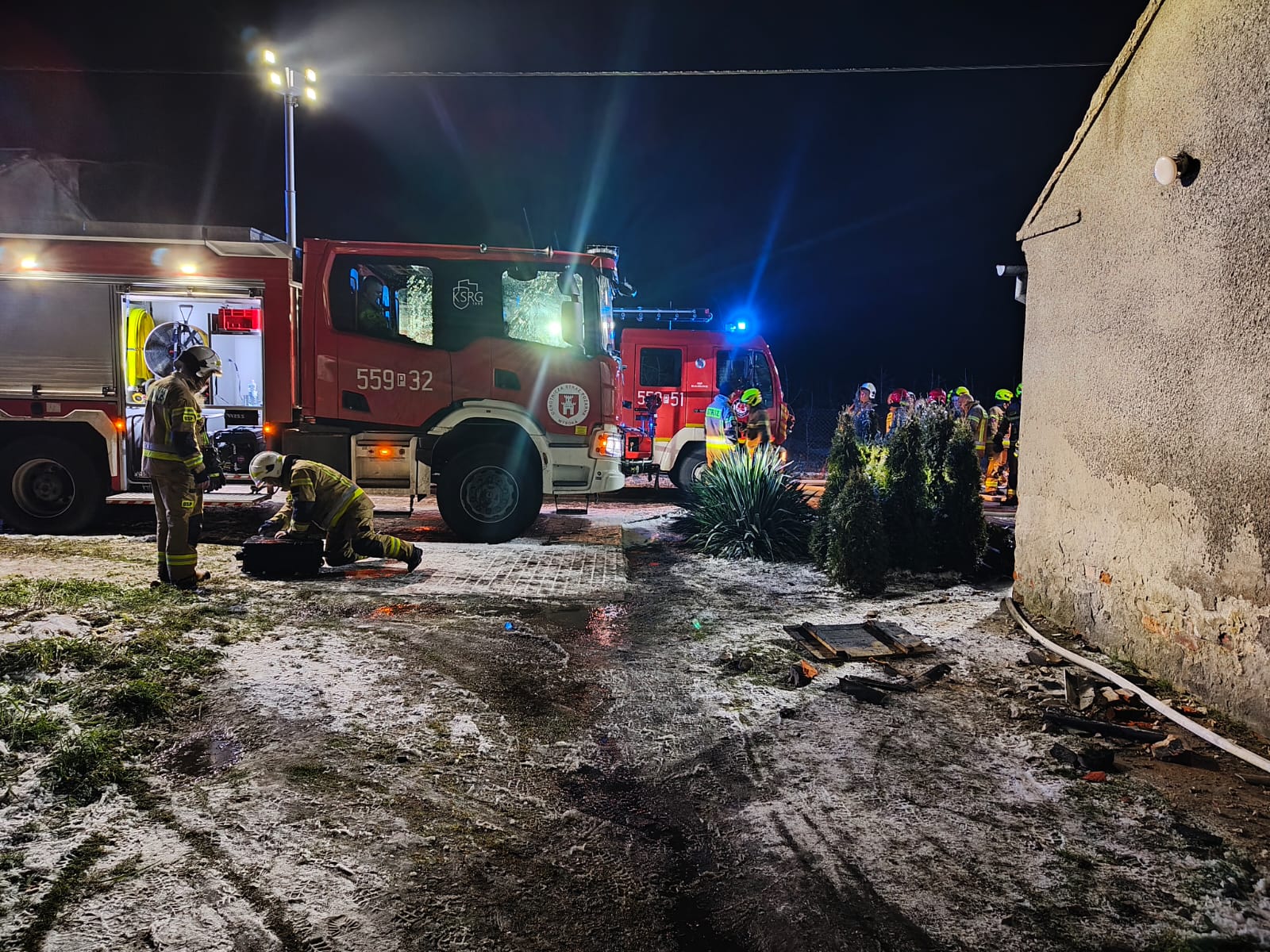 Działania strażaków to przede wszystkim zabezpieczenie miejsca zdarzenia, ewakuacja mieszkańców z przylegającego do wiaty obiektu i podaniu prądów wody w natarciu na paląca się wiatę. Następnie dogaszono drewno i dokonano częściowej rozbiórki spalonej elementów konstrukcyjnych. Pogorzelisko i mieszkania w obiekcie sprawdzono kamerą termowizyjną oraz miernikiem tlenku węgla.