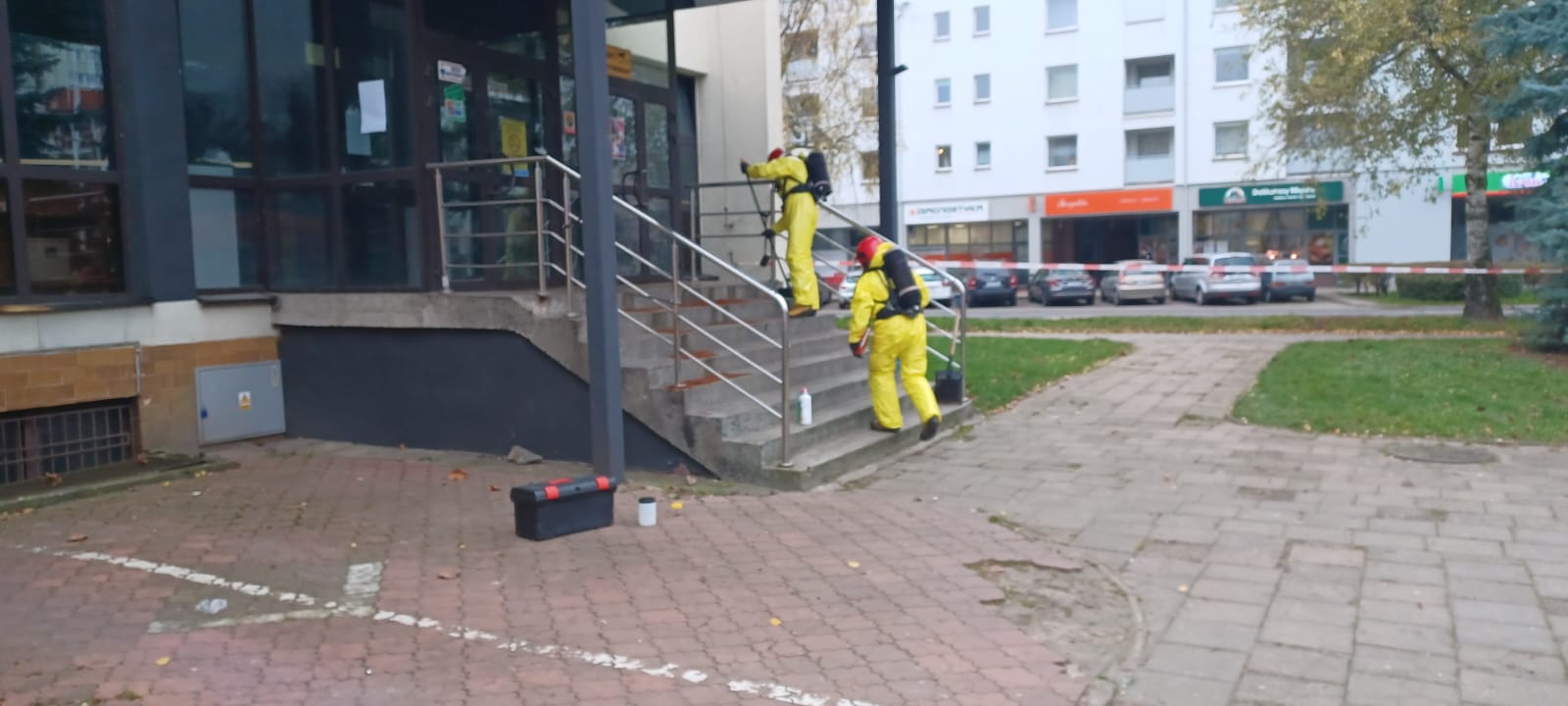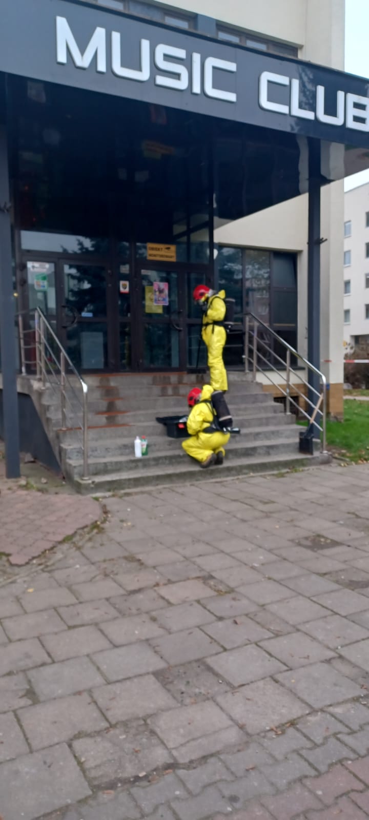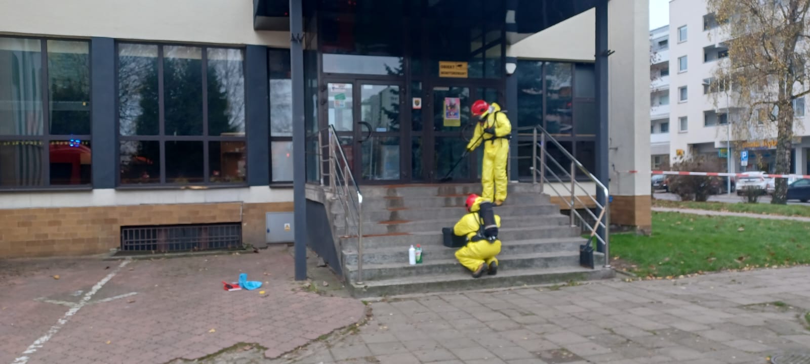 Po przyjeździe na miejsce stwierdzono, że przy wejściu do budynku rozlana jest substancja niewiadomego pochodzenia. Z informacji od osób postronnych wynikało, że może to być preparat do odstraszania dzikich zwierząt.