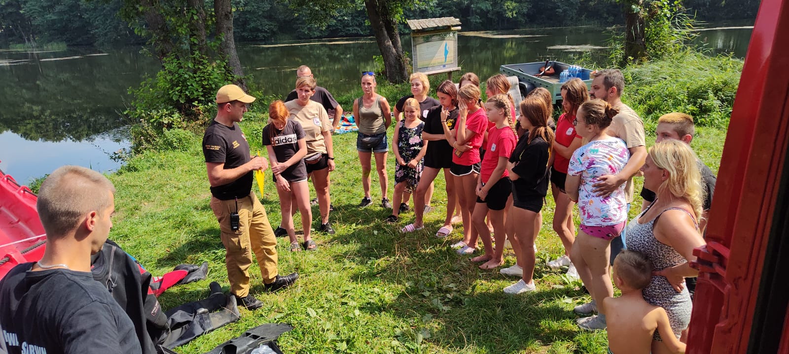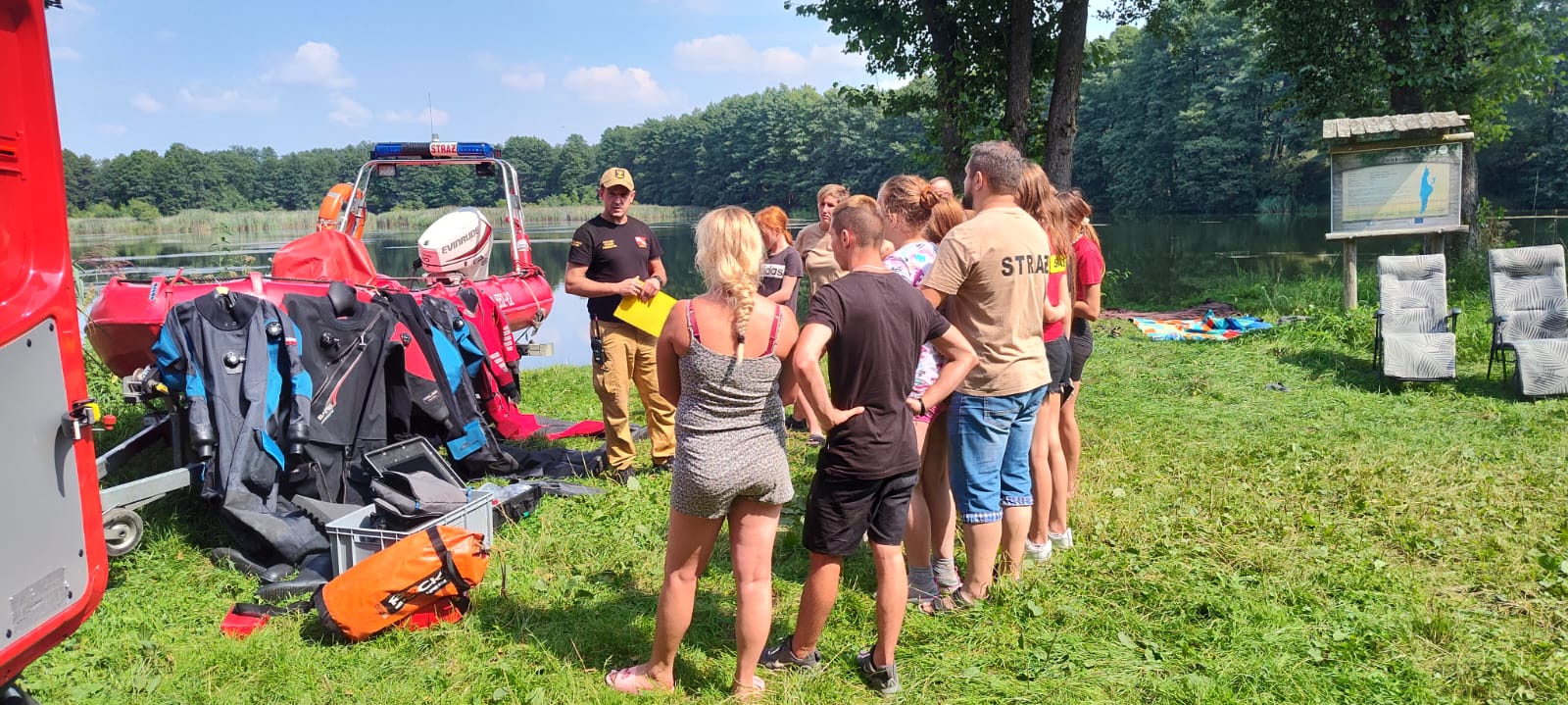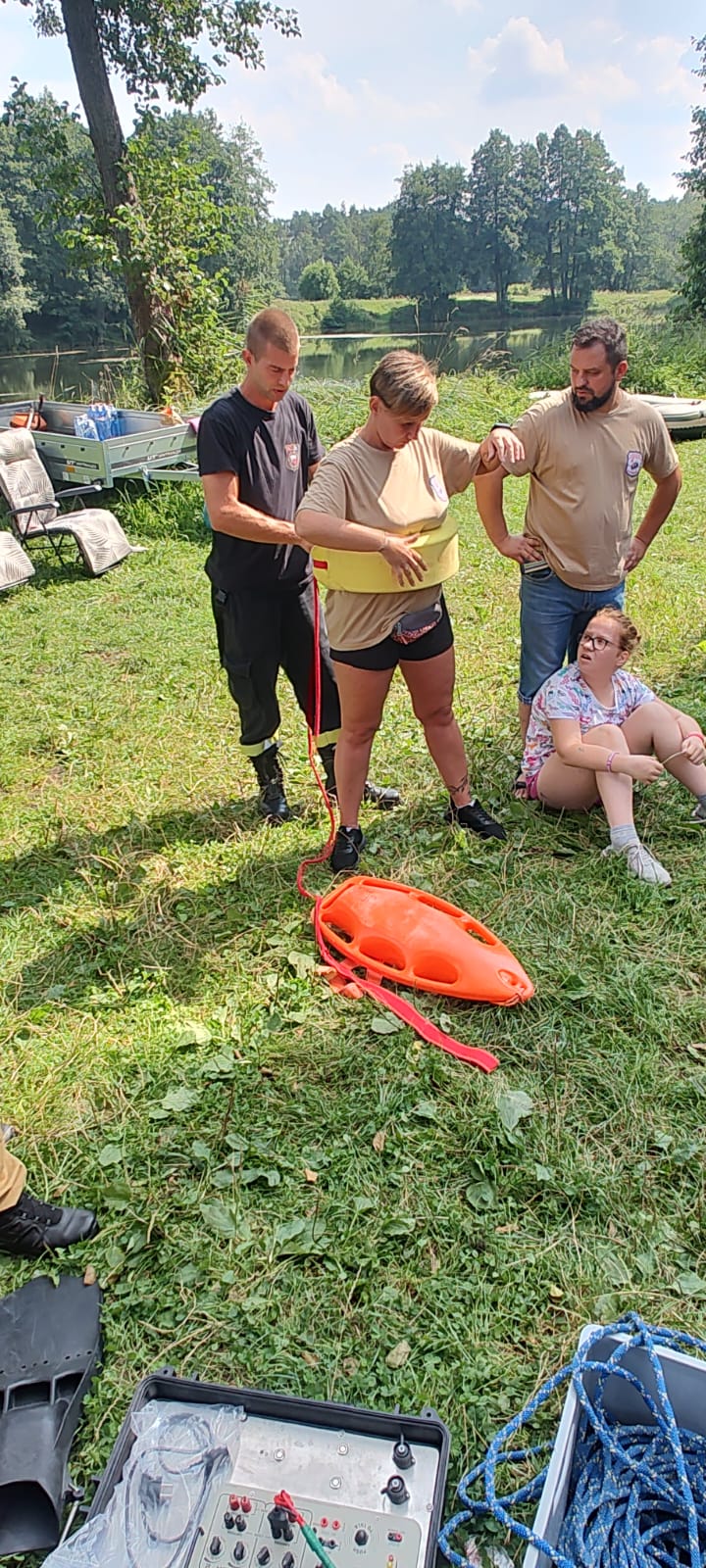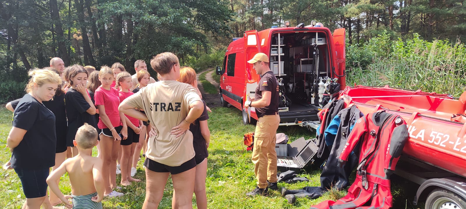 Obecność strażaków z dwójki pozwoliła przybliżyć uczestnikom obozu zakres i sposób działania naszej specjalizacji. Zaprezentowano i omówiono sprzęt nurkowy oraz ratownictwa wodnego. Przypomniane zostały zasady bezpiecznego przebywania nad wodą. Spotkanie urozmaiciły przepyszne przekąski, ciasta oraz pieczona kiełbaska.